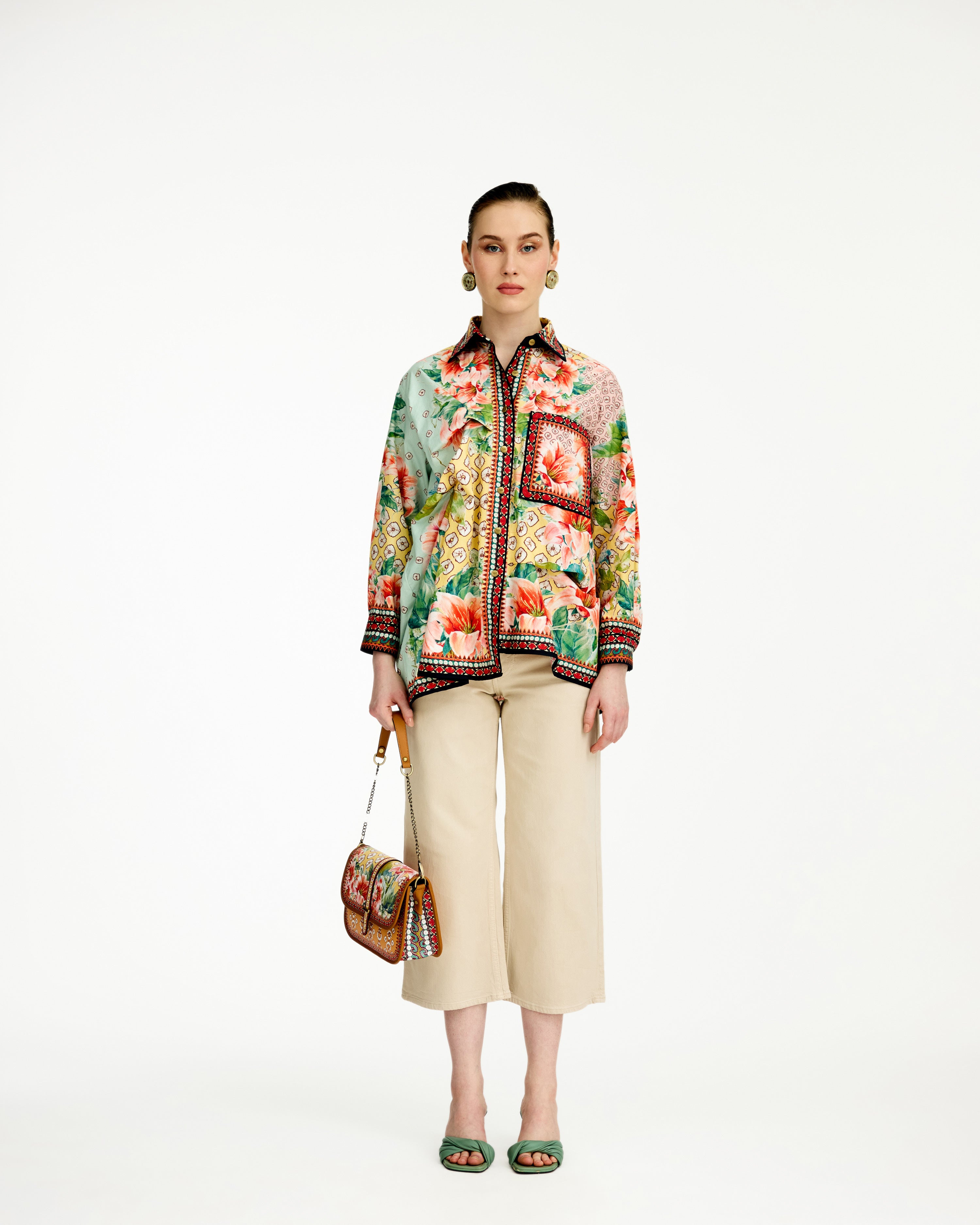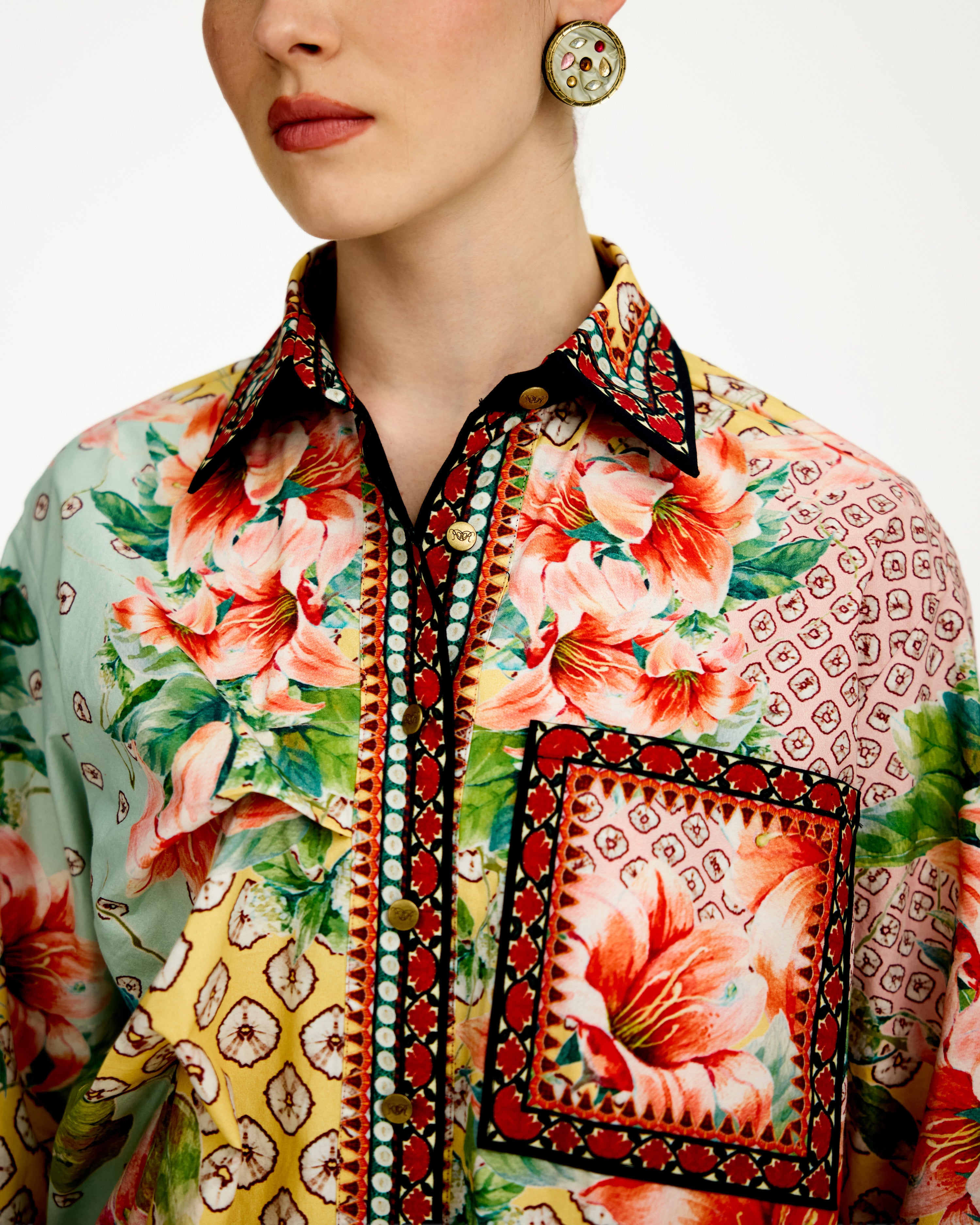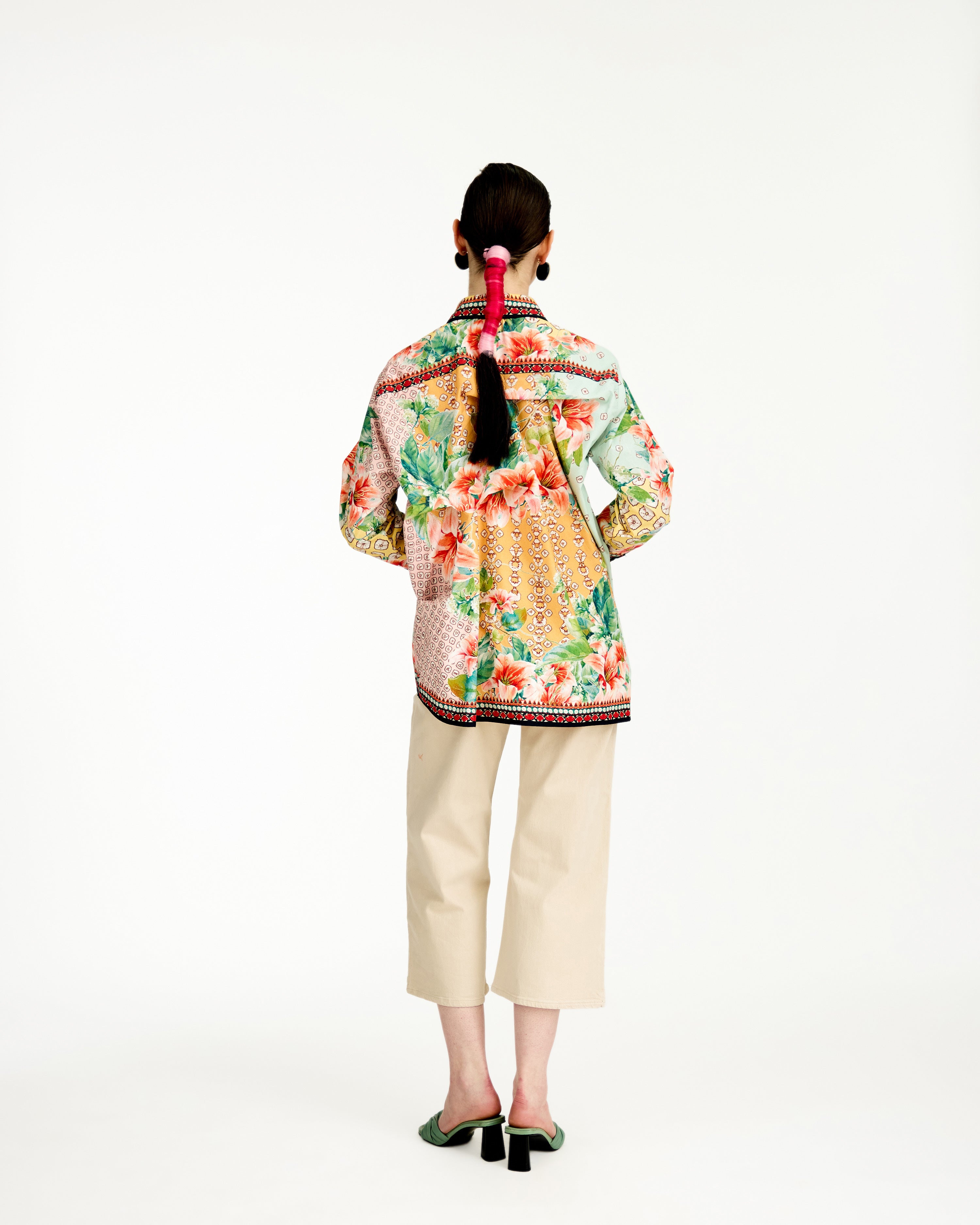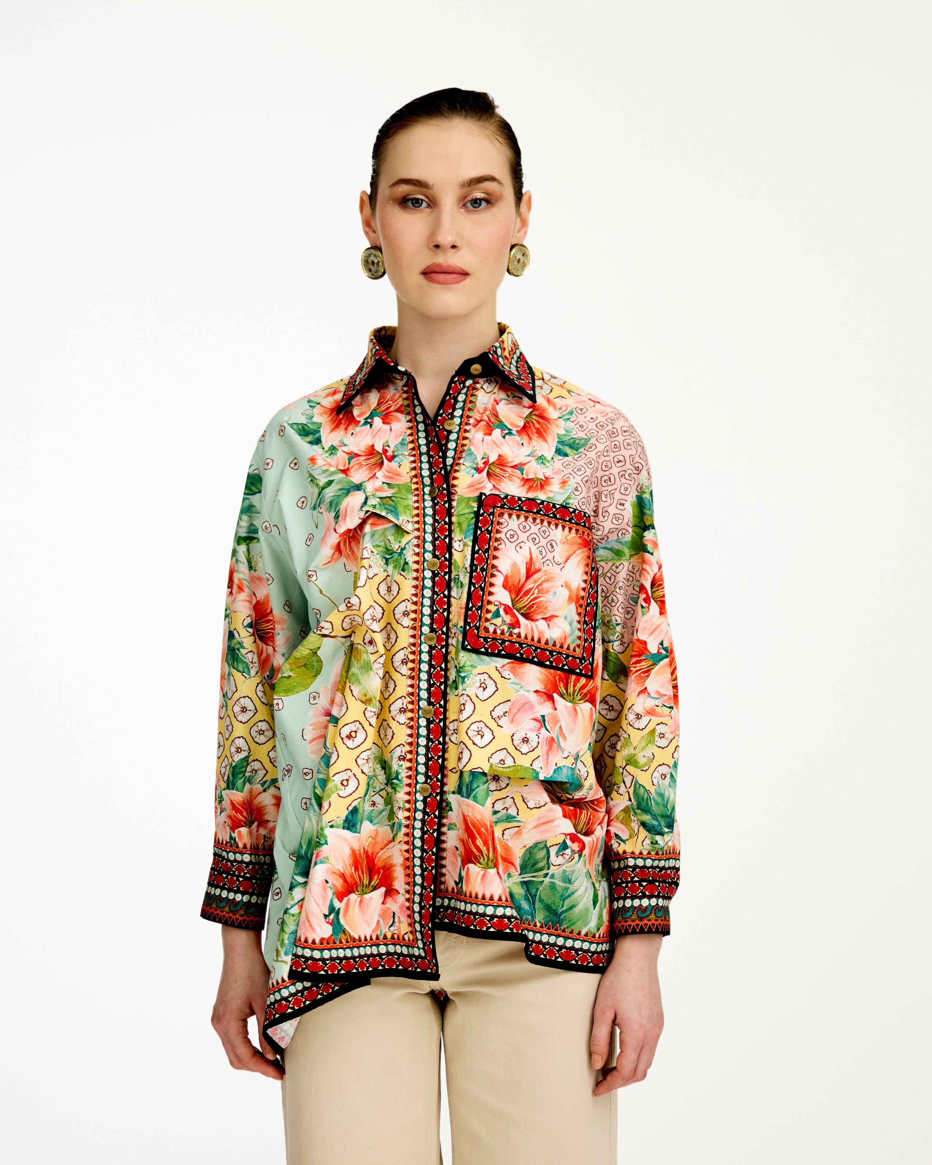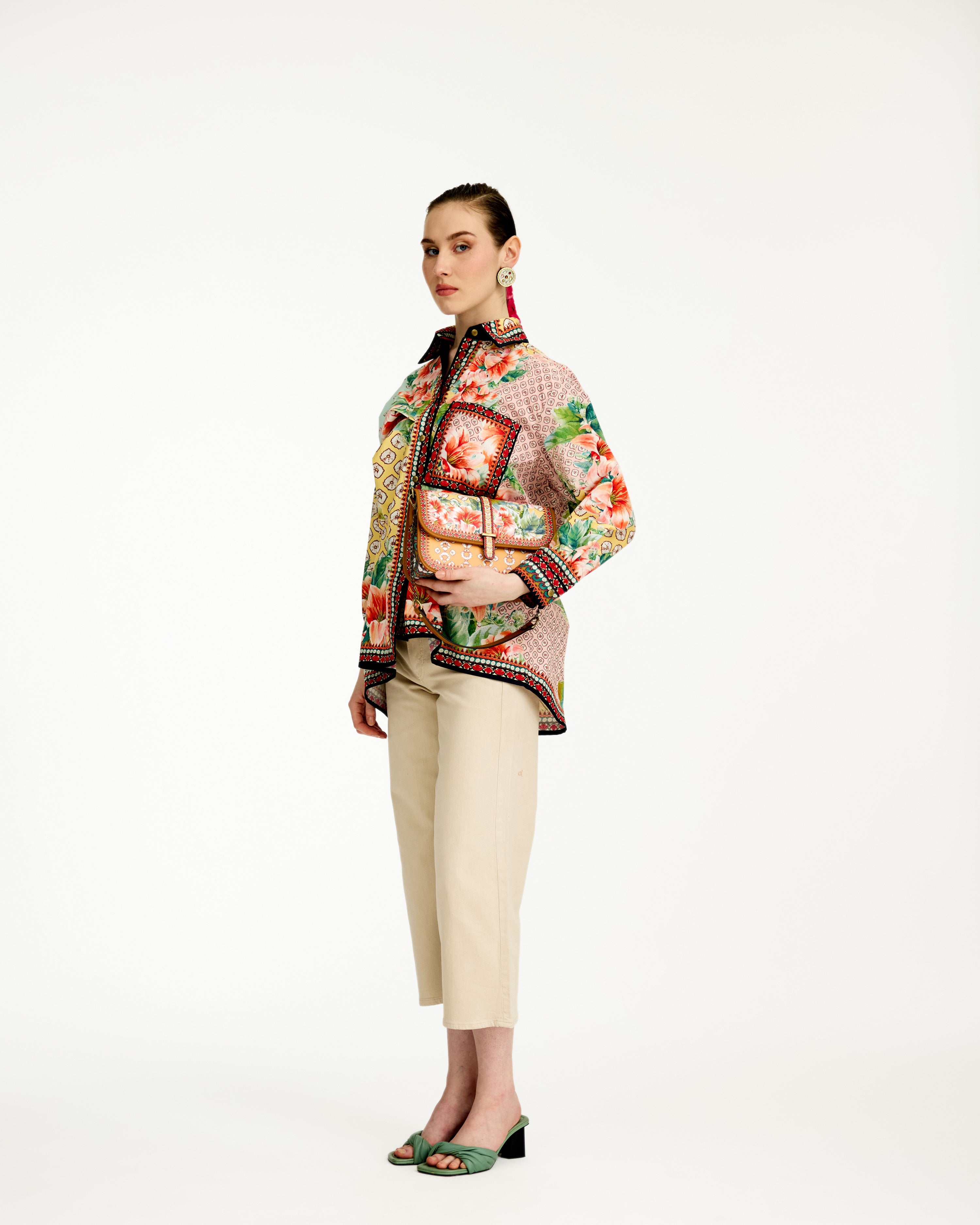 The Asiya assymetric front shirt has a collar and full sleeves with a cuff closure.