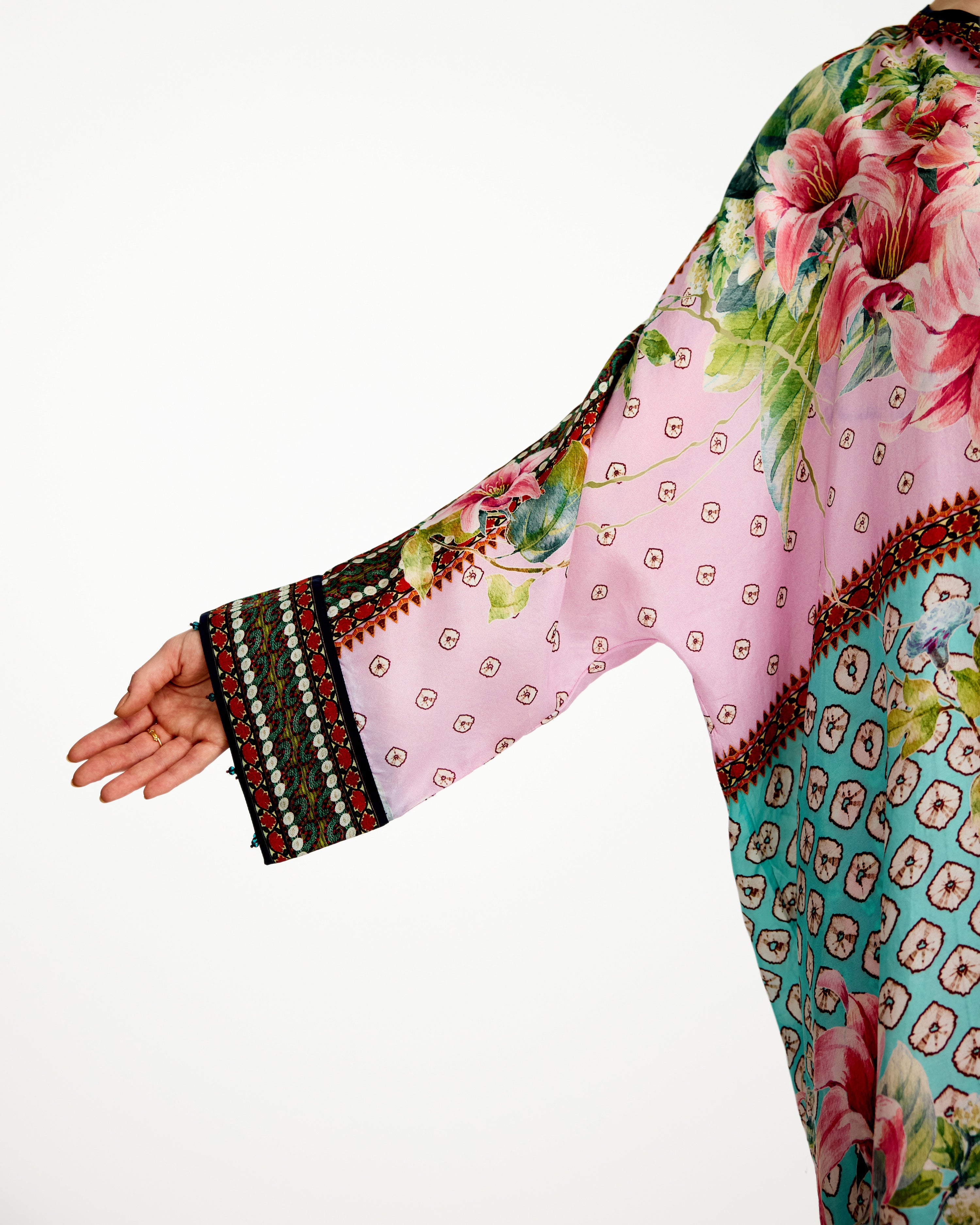 The tunic has a curved hem and open cuffs.