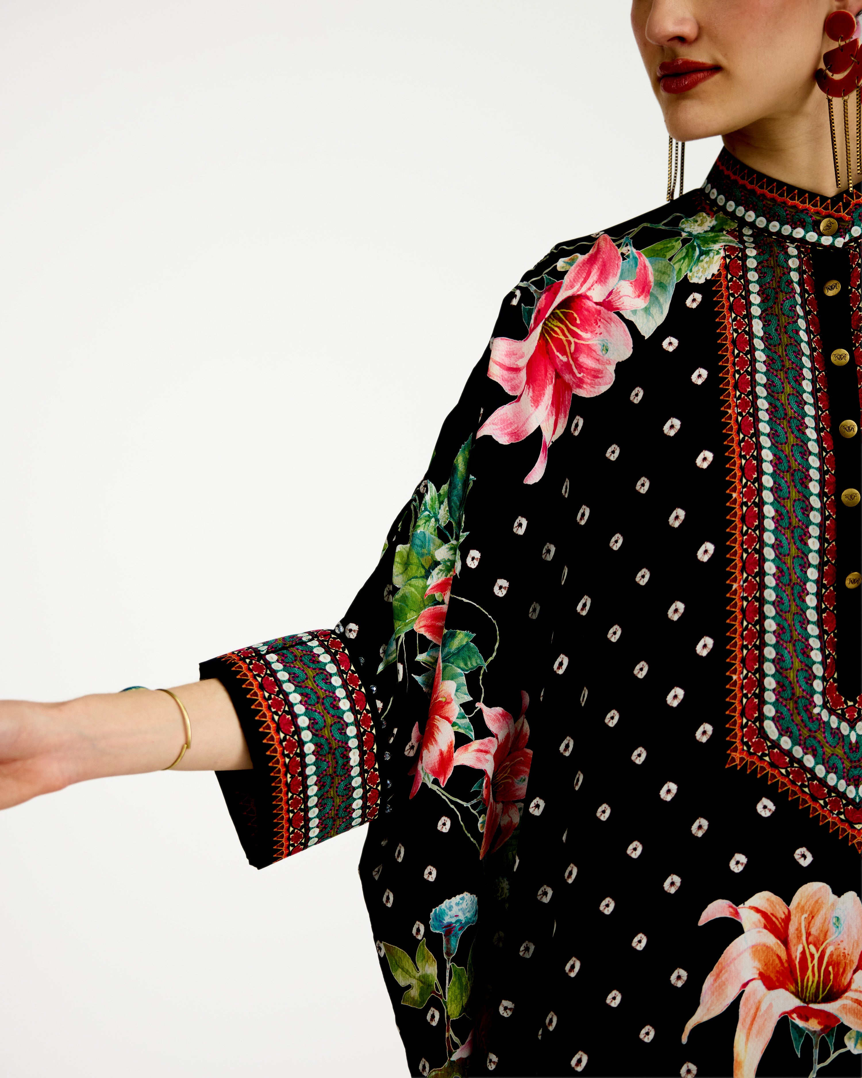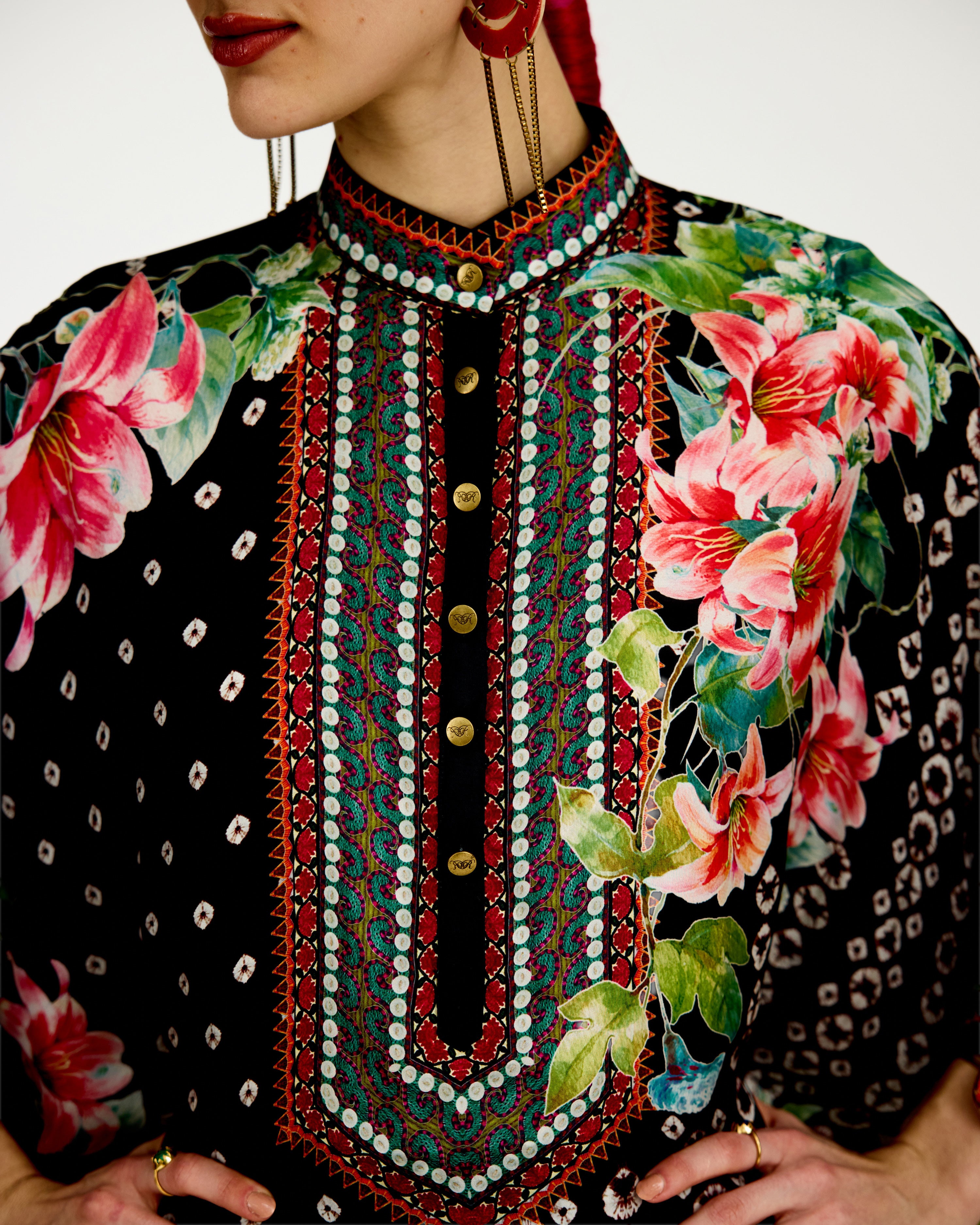 The tunic has a lovely mandarin collar and a button front placket neckline.