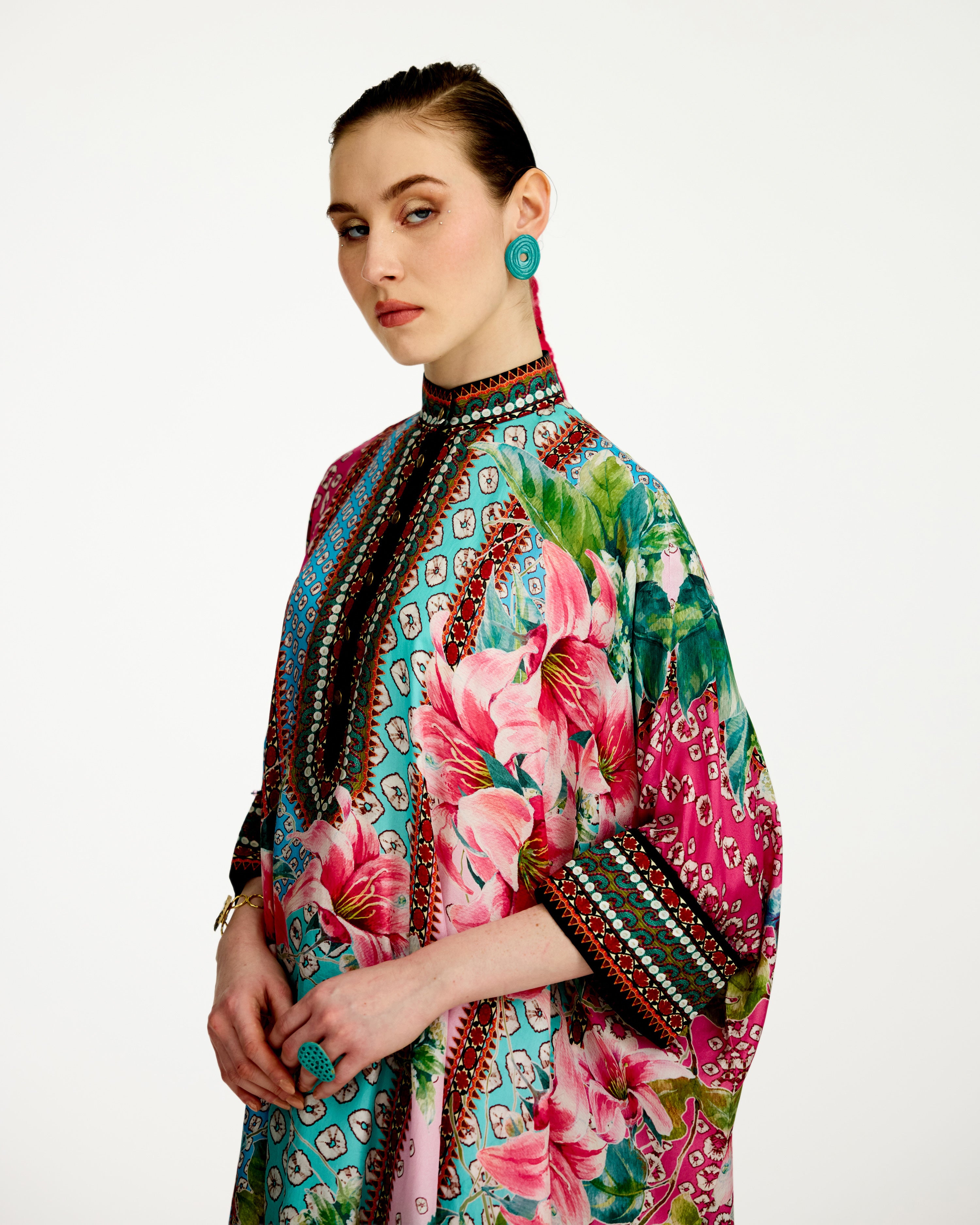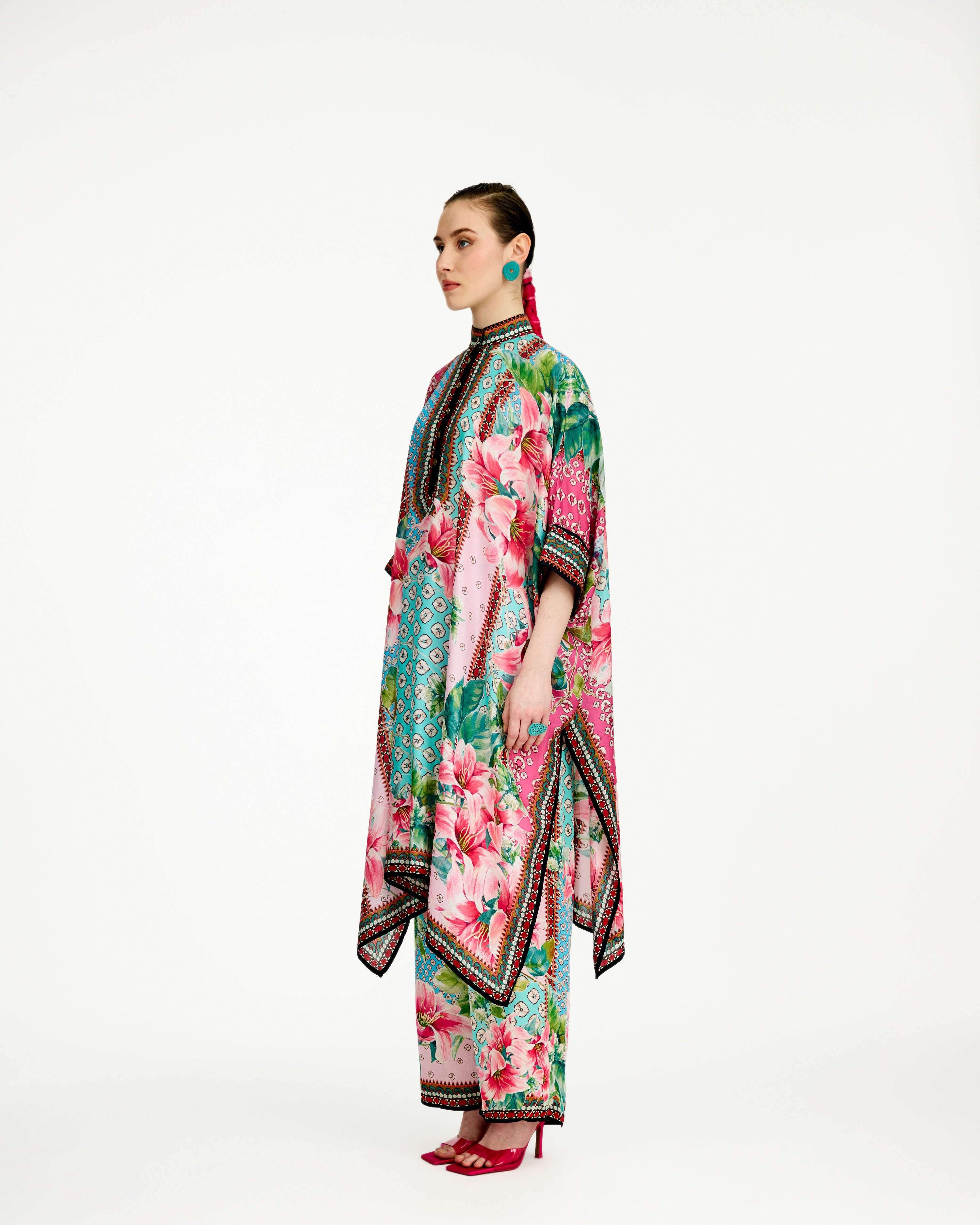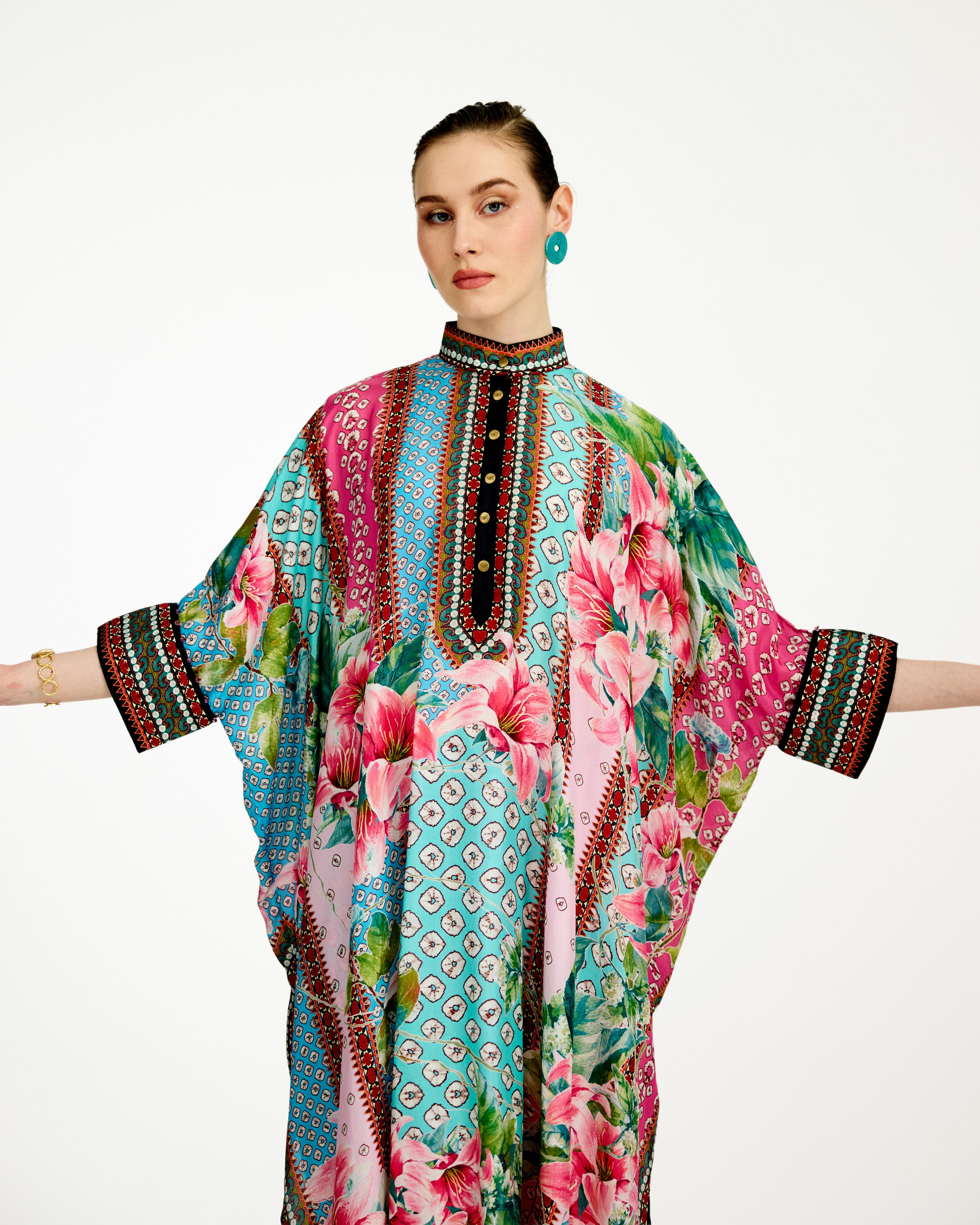 It has drop sleeves with folded cuffs and a comfortable wide flare that drops on the sides as a drape with side slits.