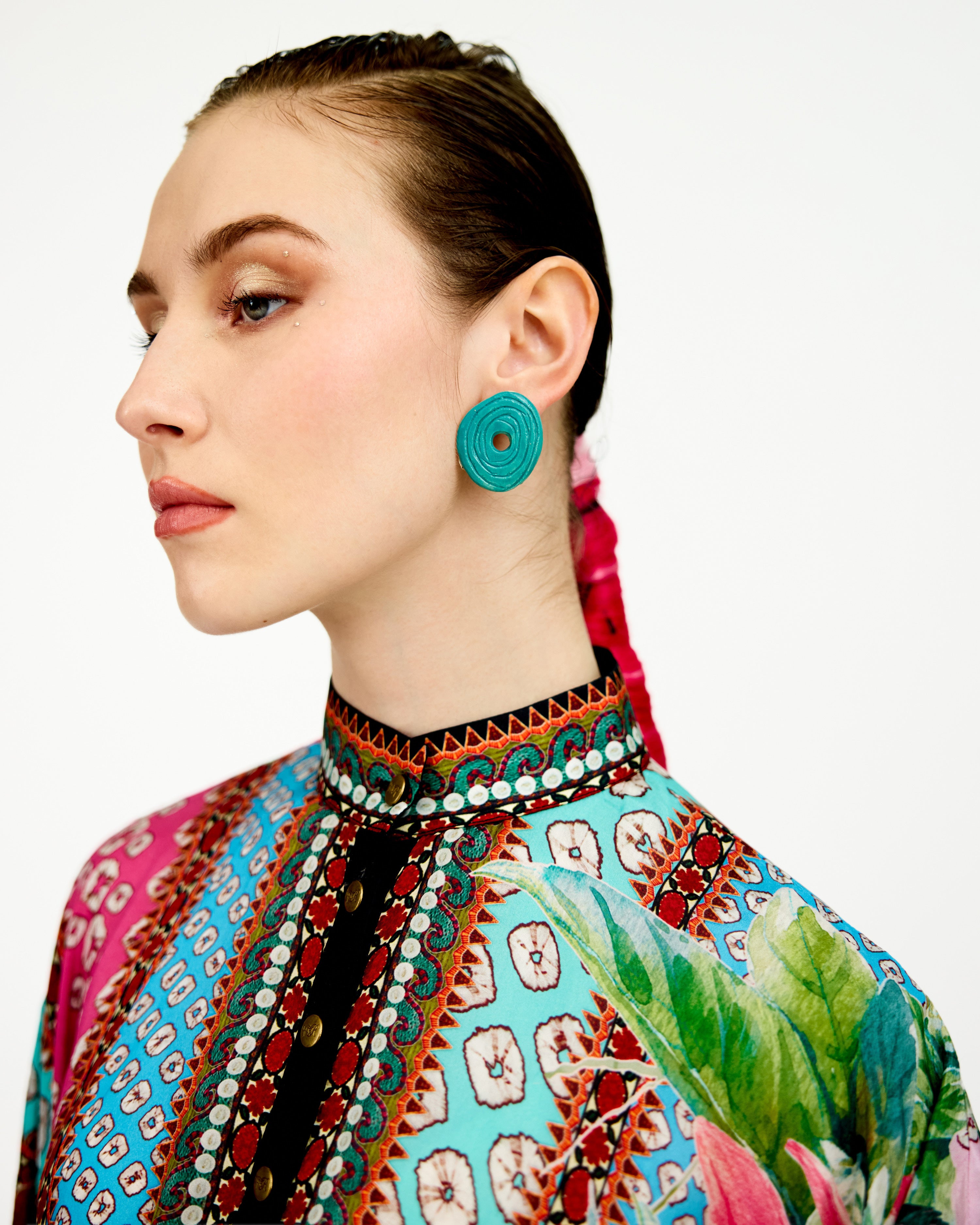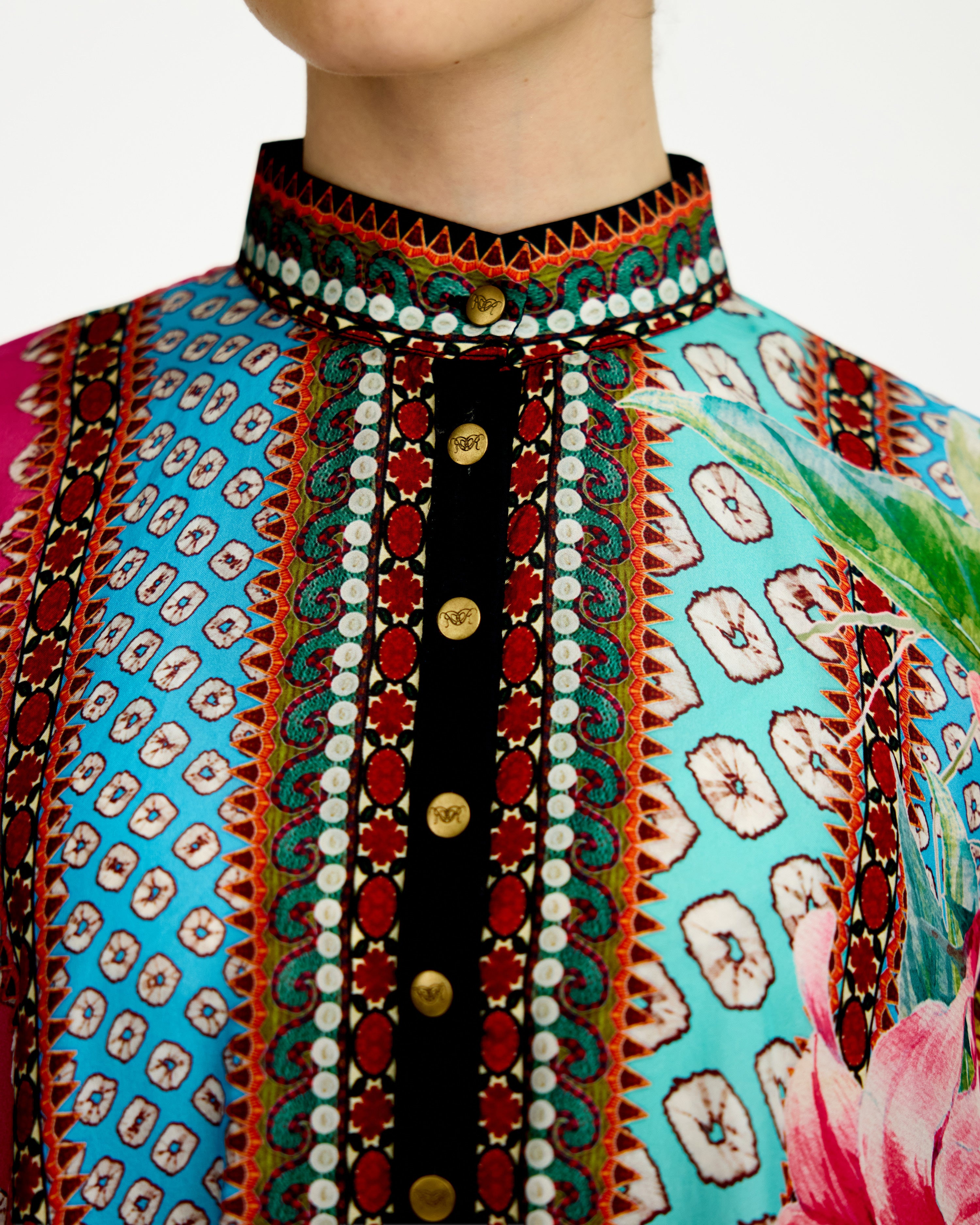 The 42" length tunic has a mandarin collar and a button front neckline.