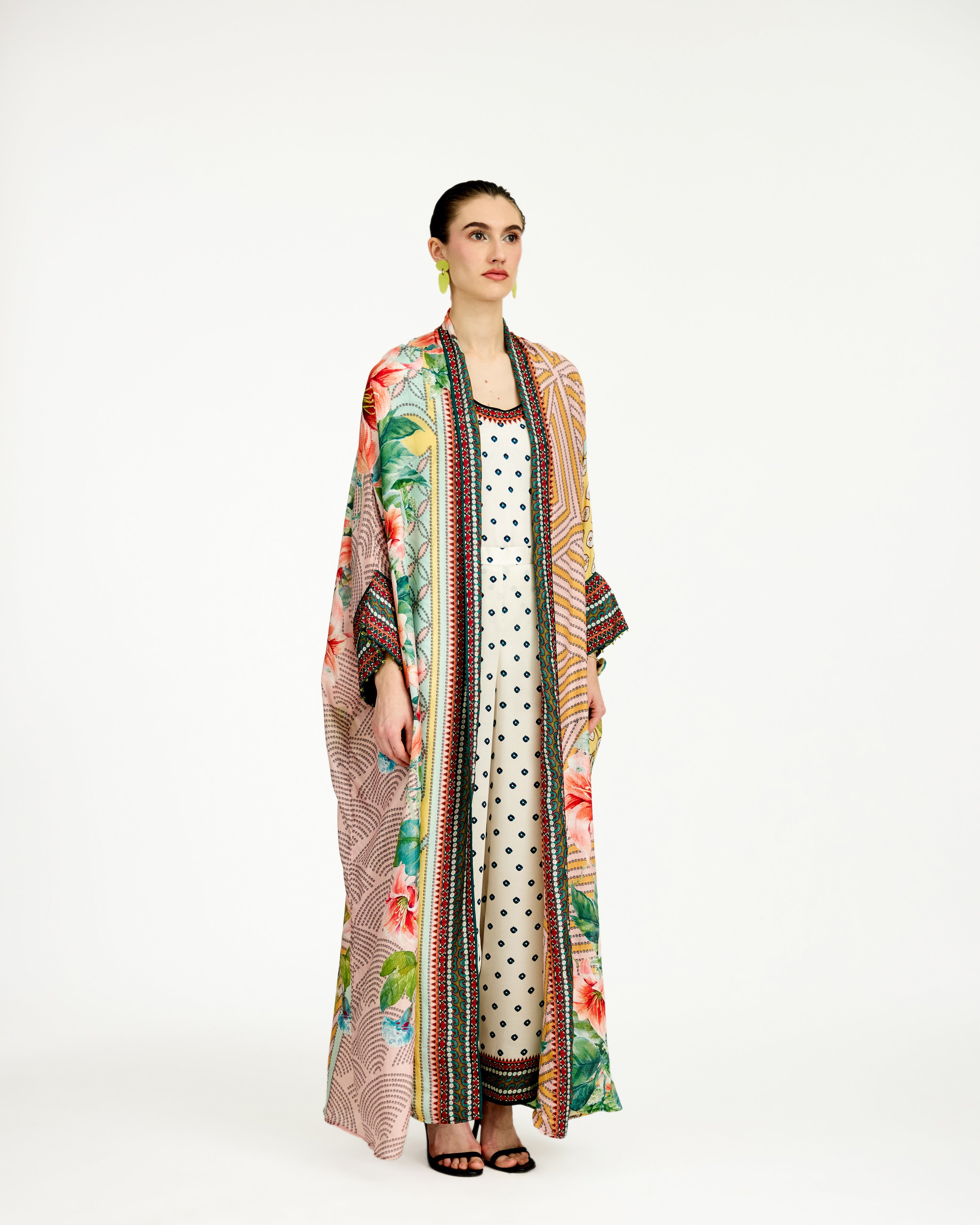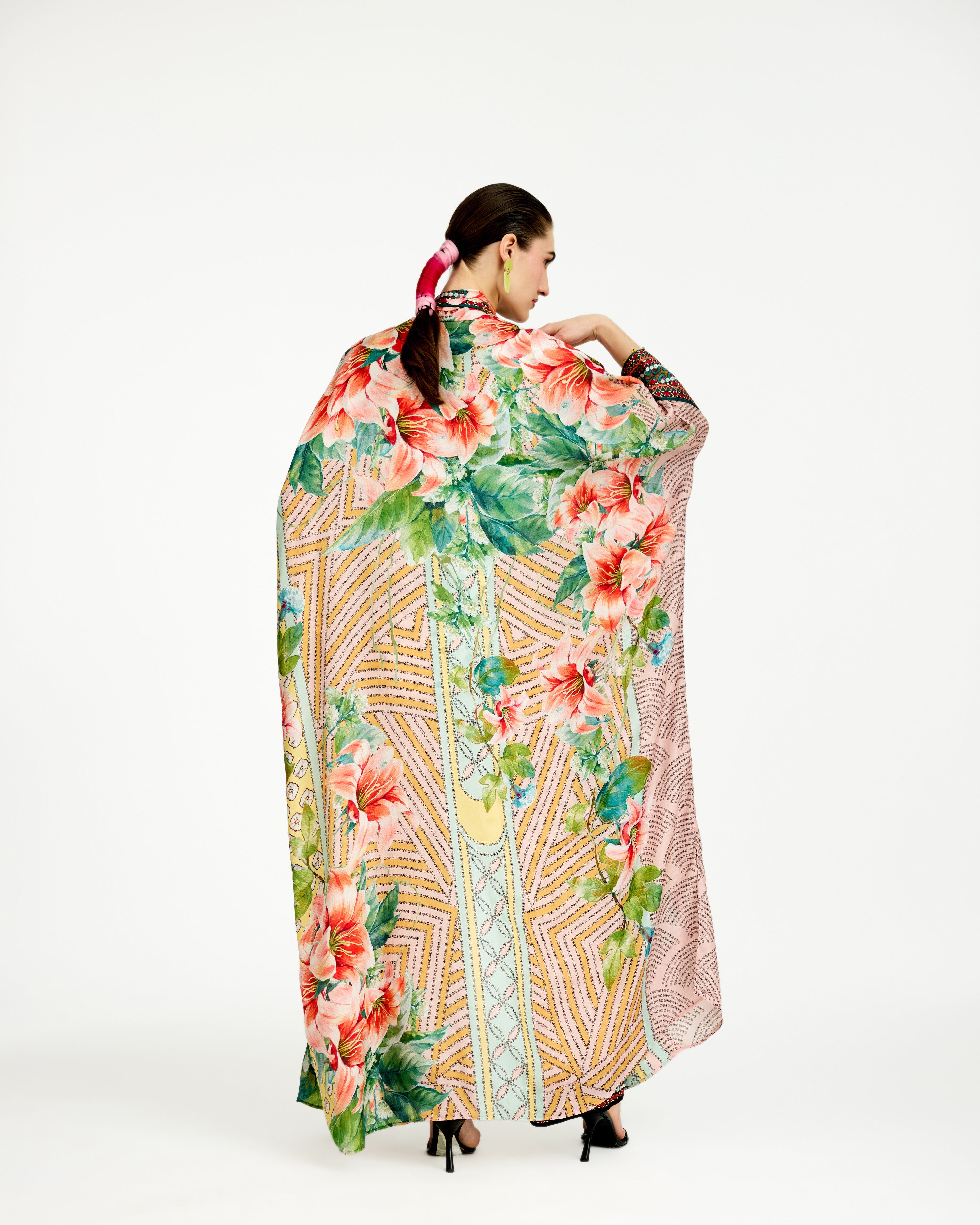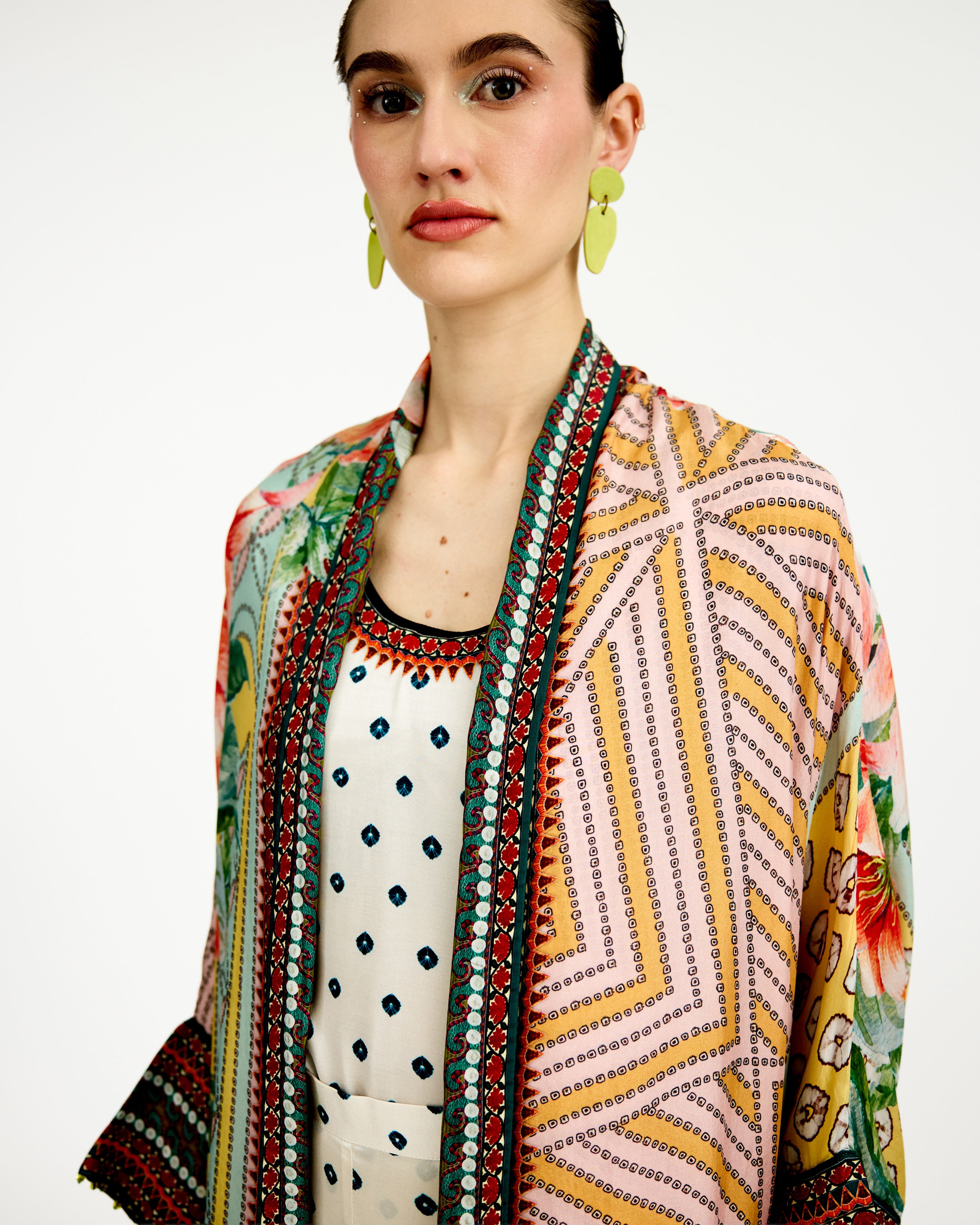 The kimono jacket has a shawl collar neckline and an open front.