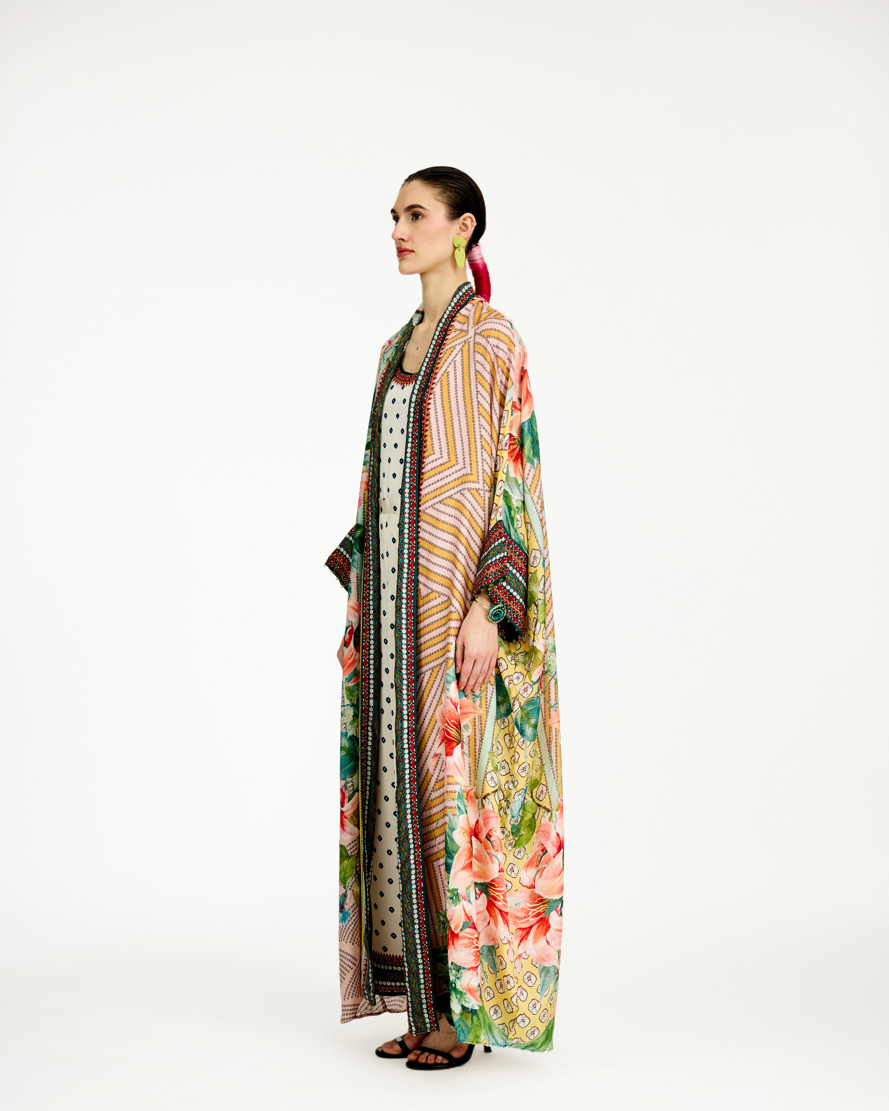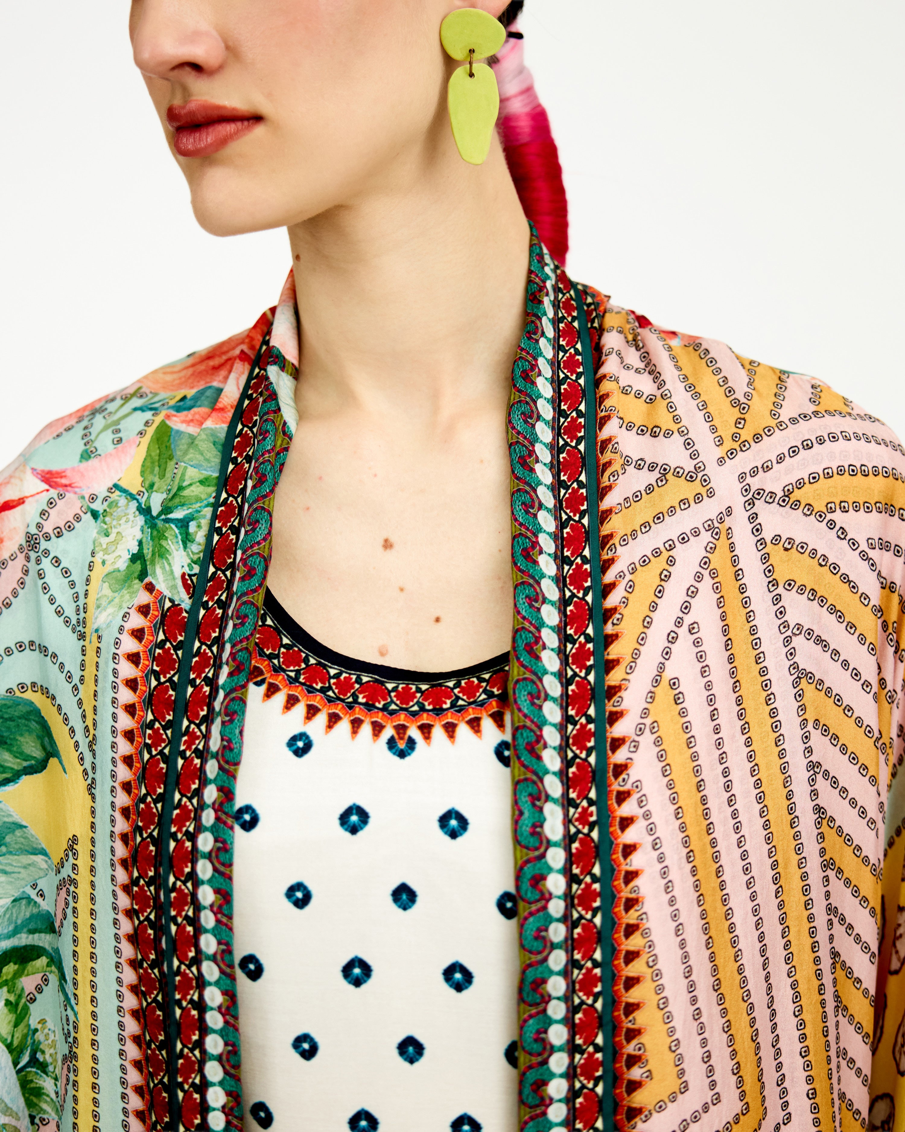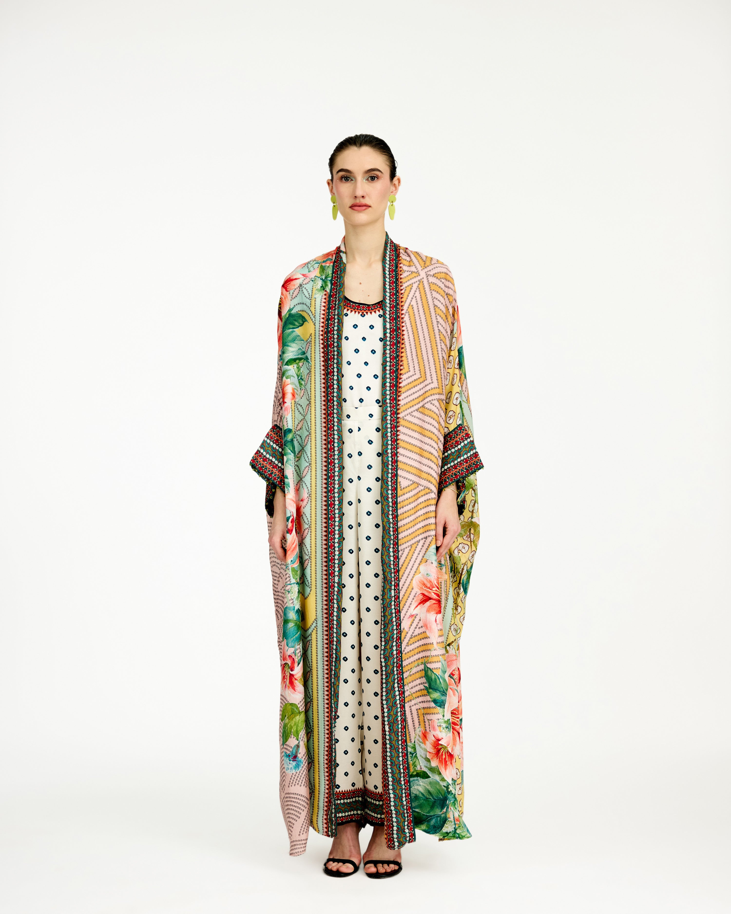 The kimono jacket has a shawl collar neckline and an open front.