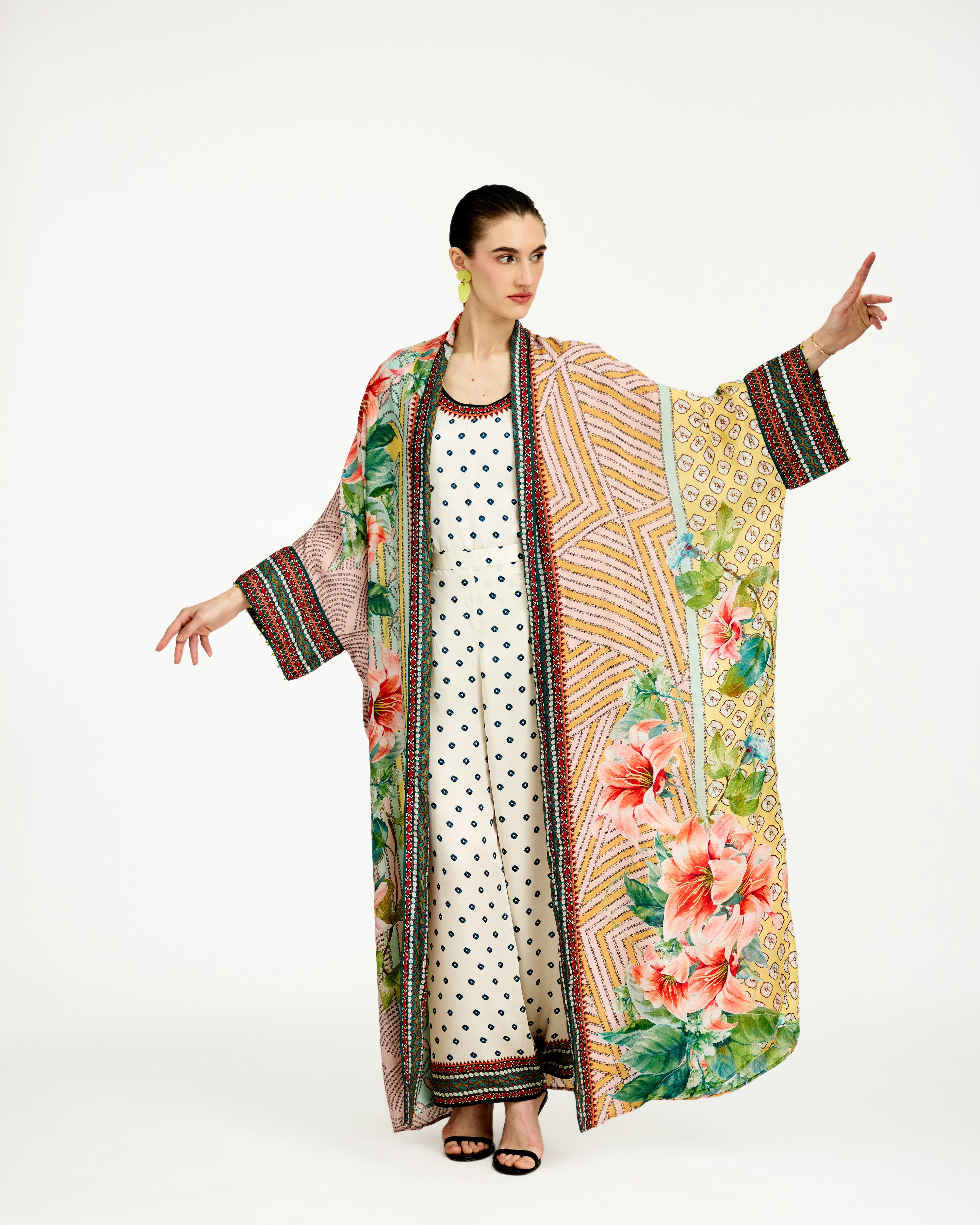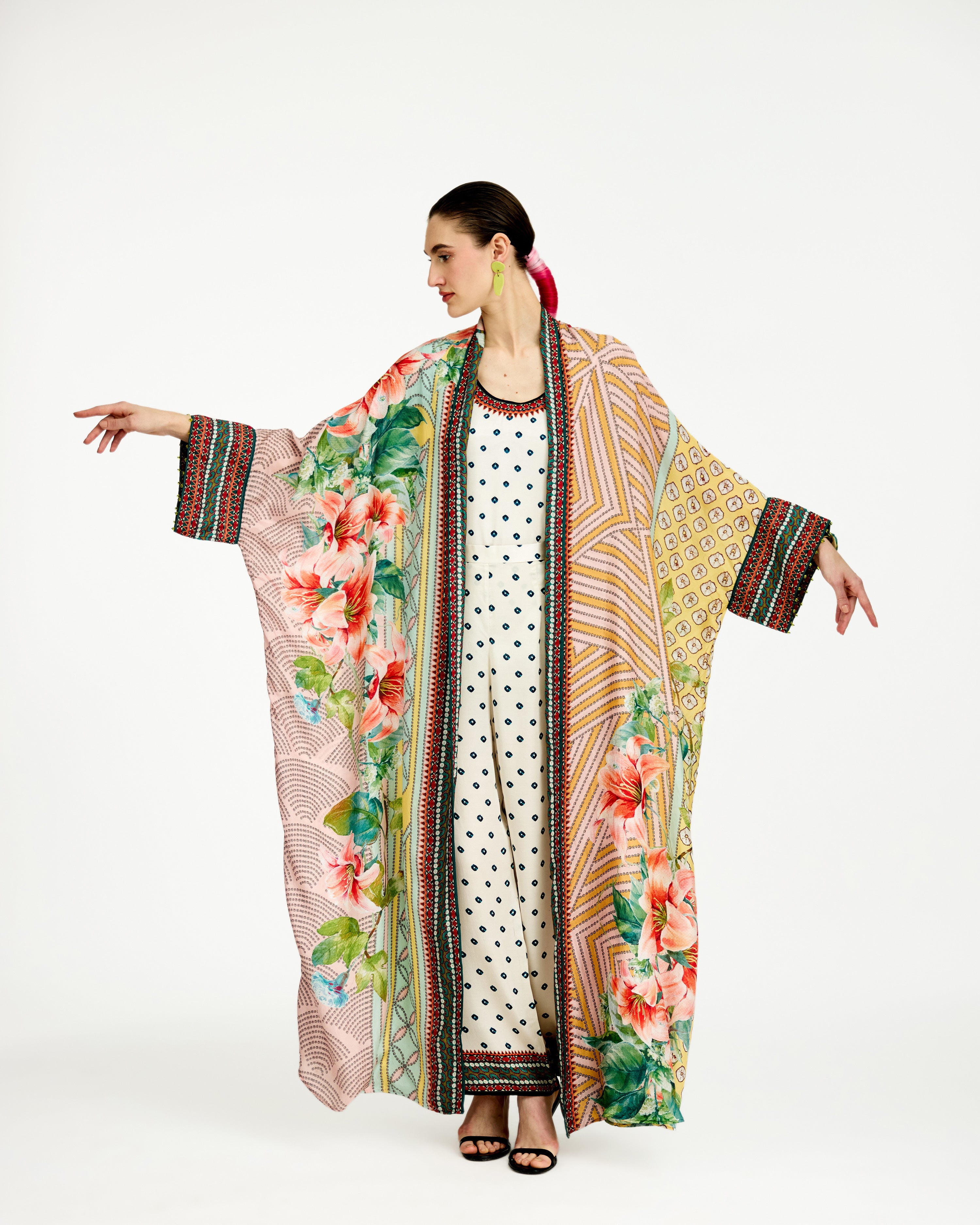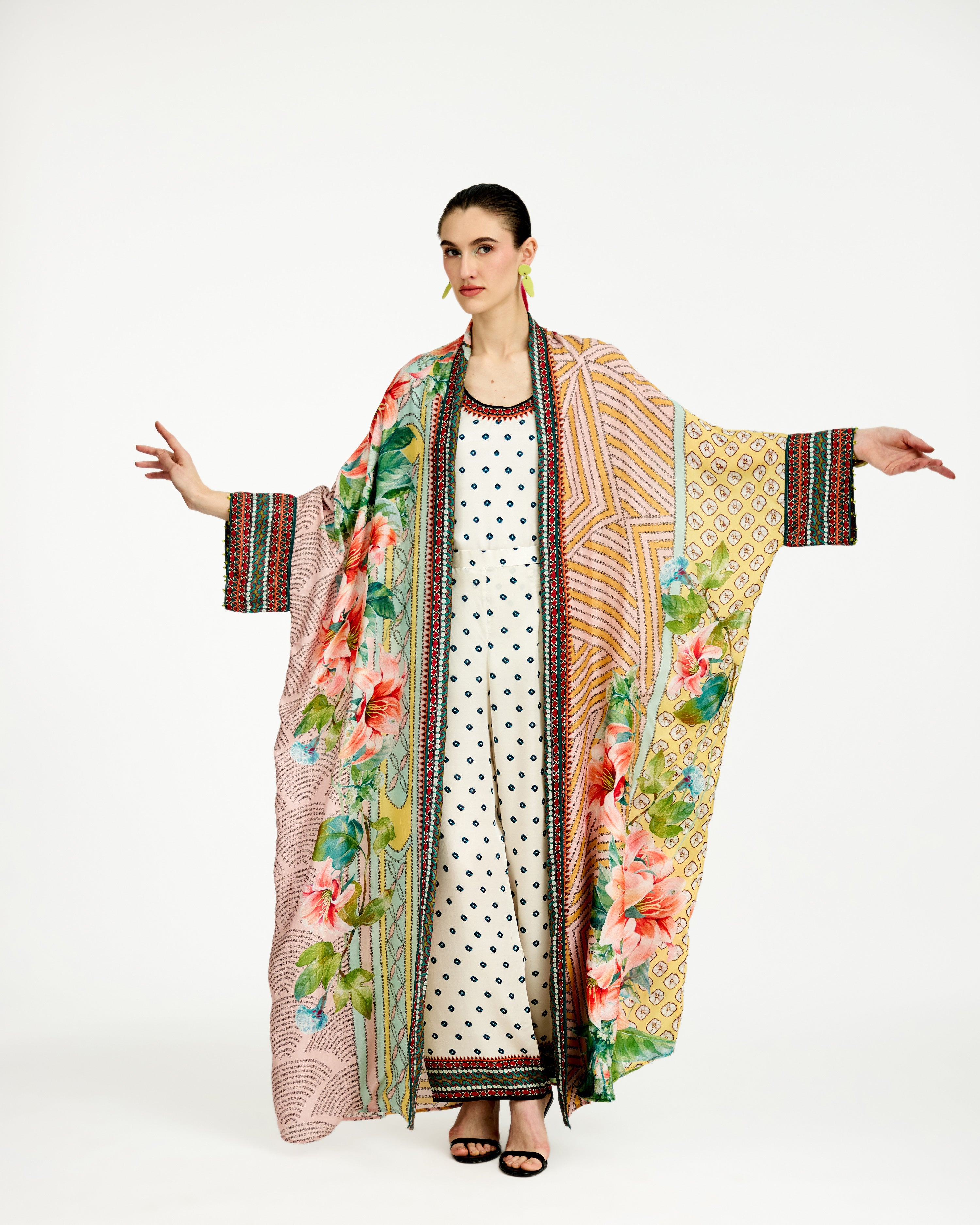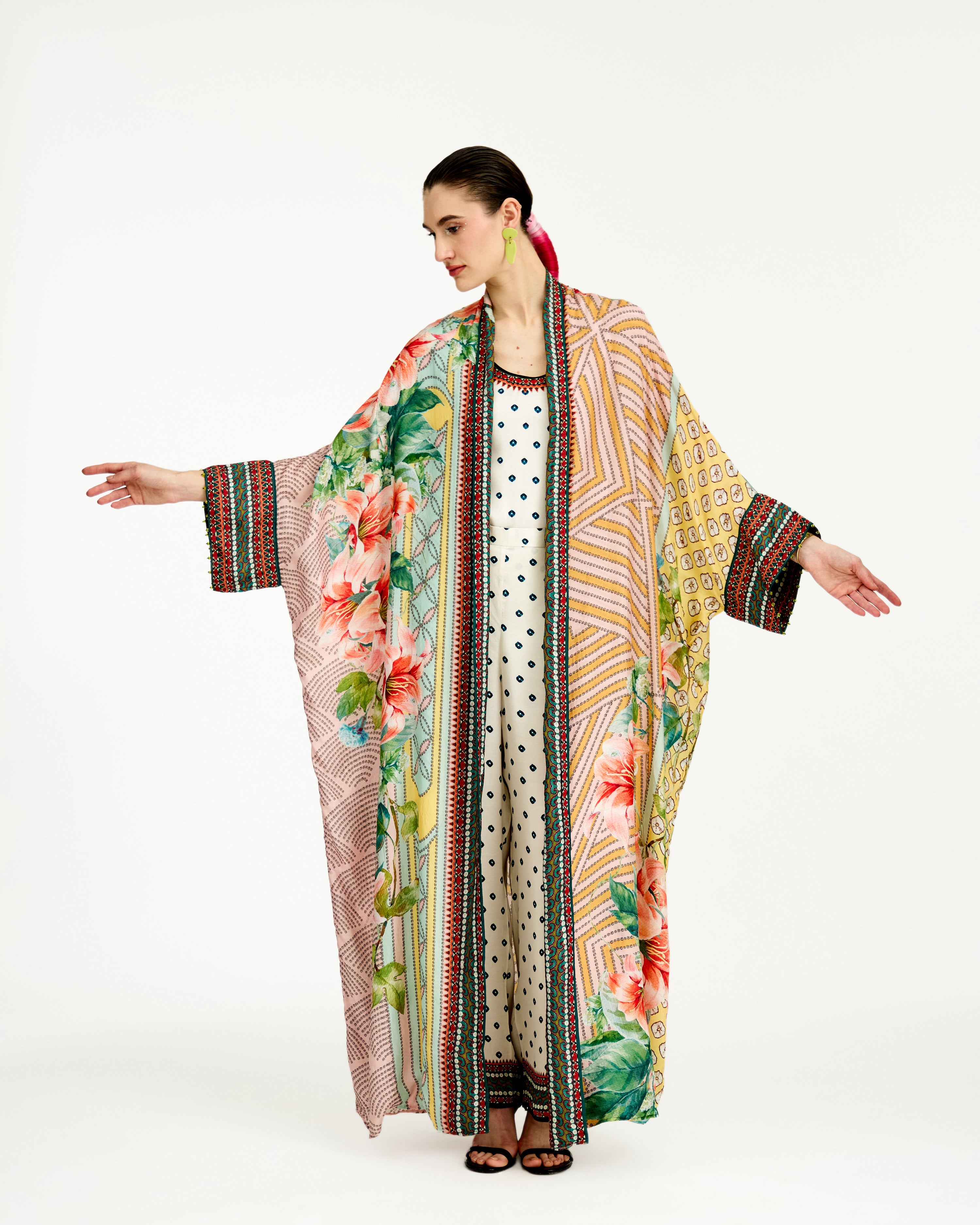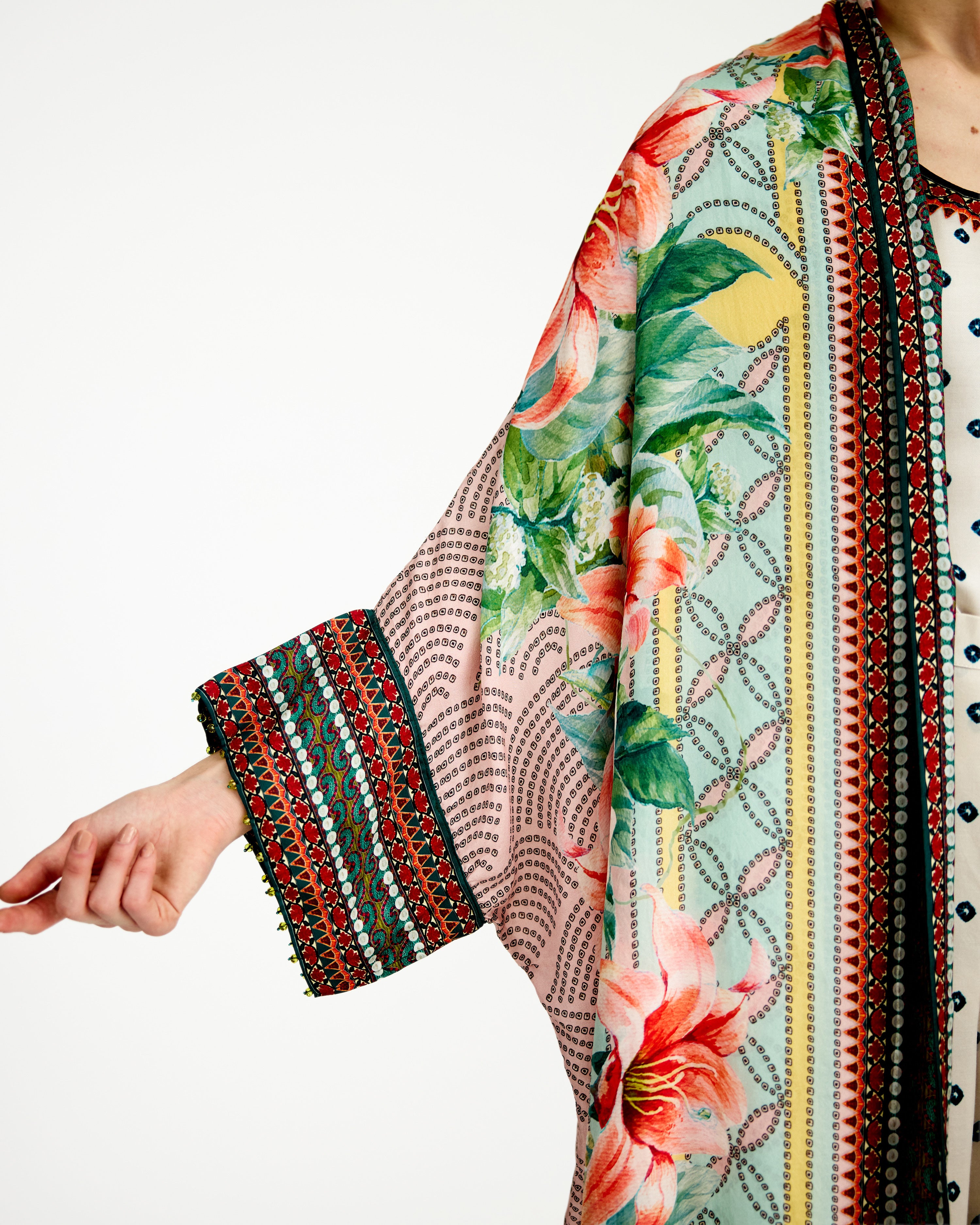 This kimono jacket has straight boxy kimono extended cuffs.