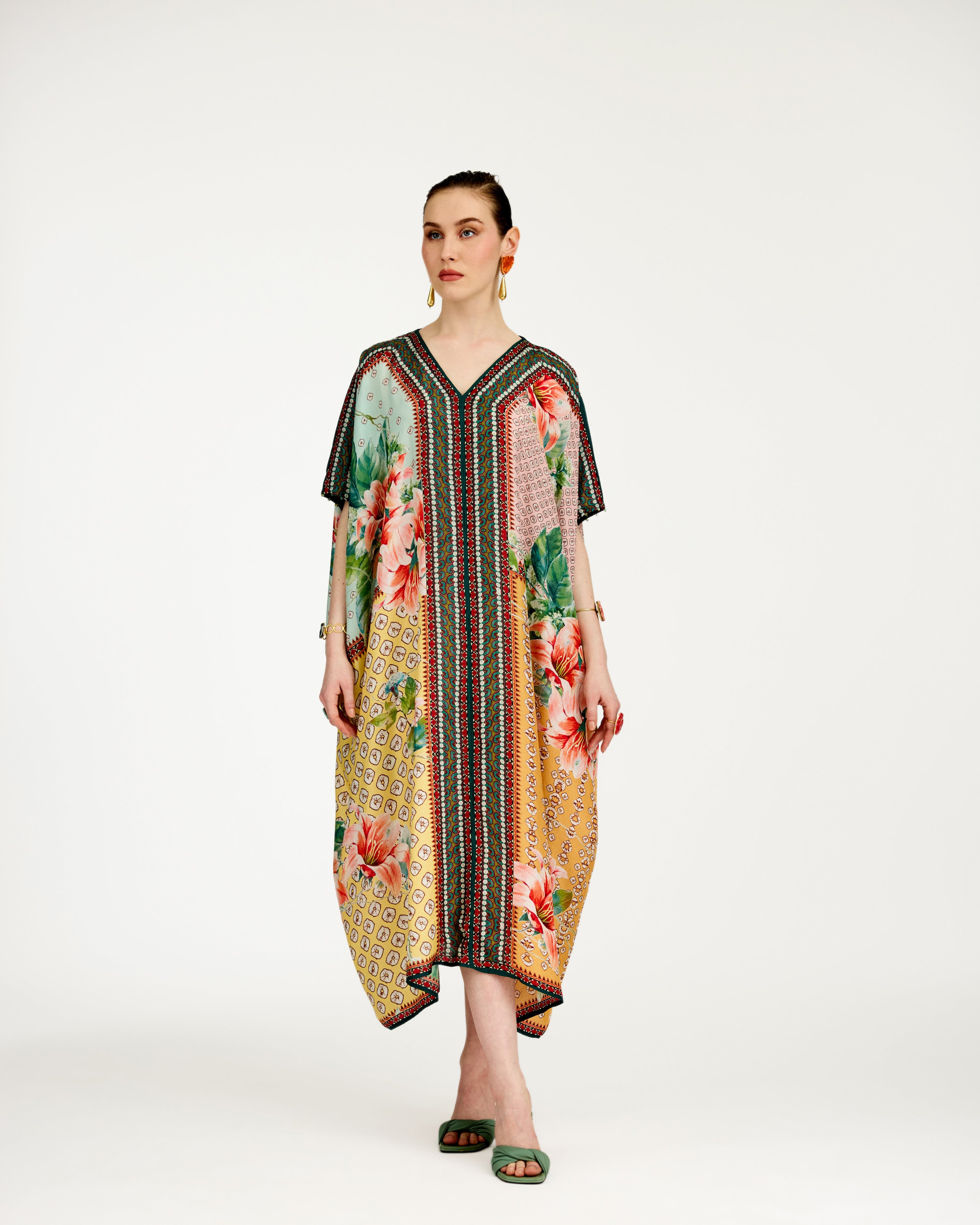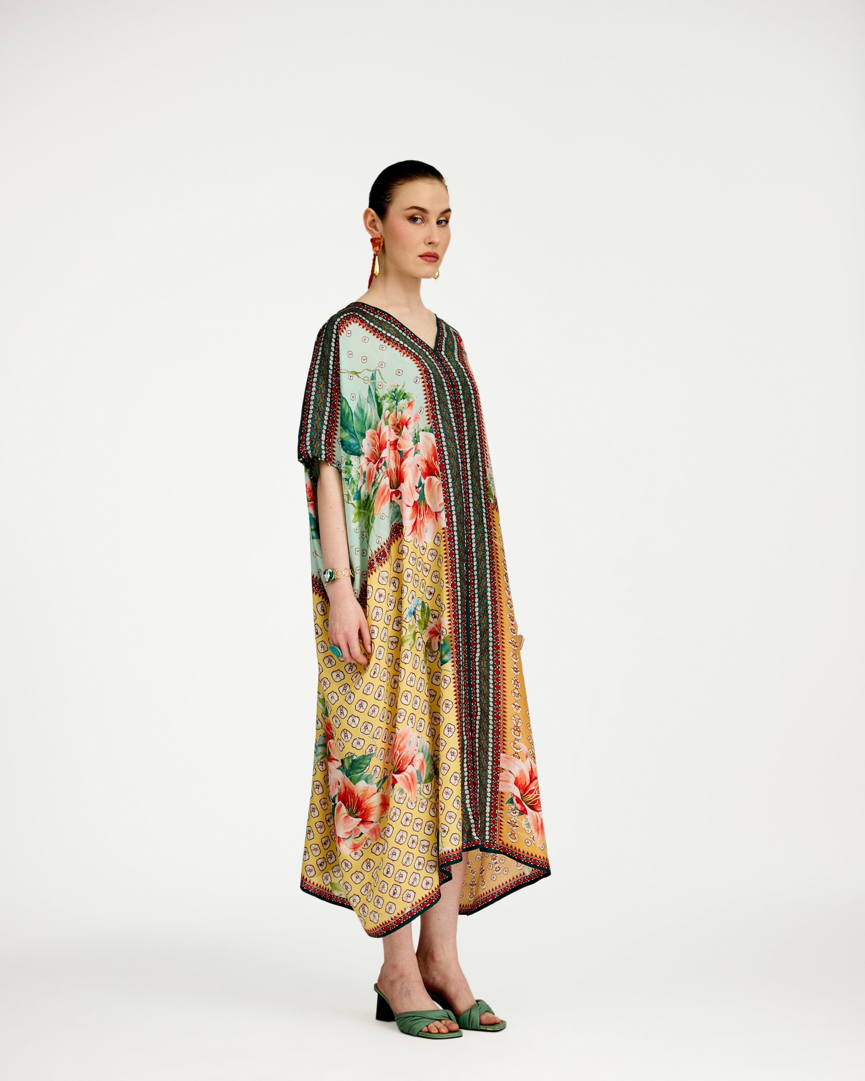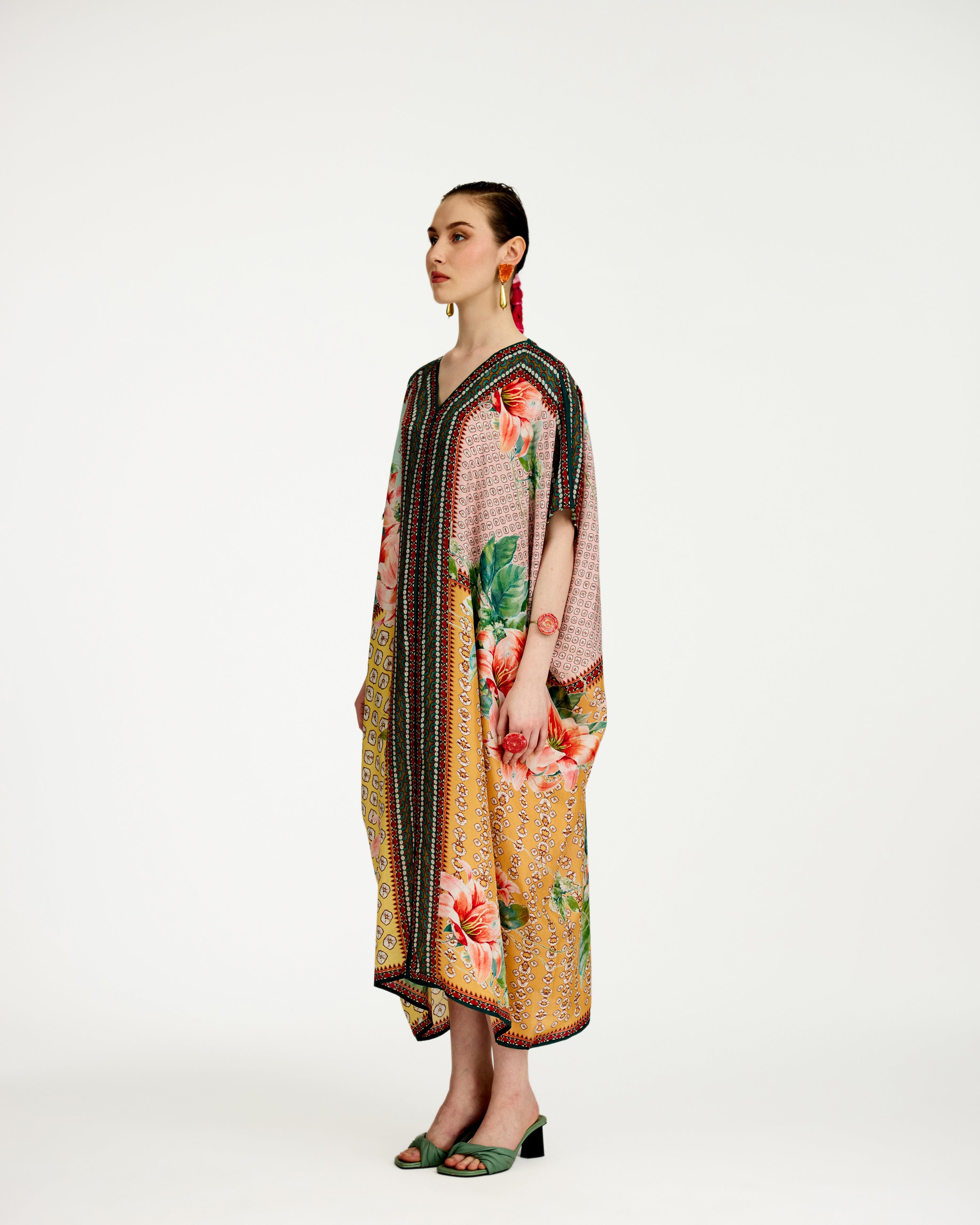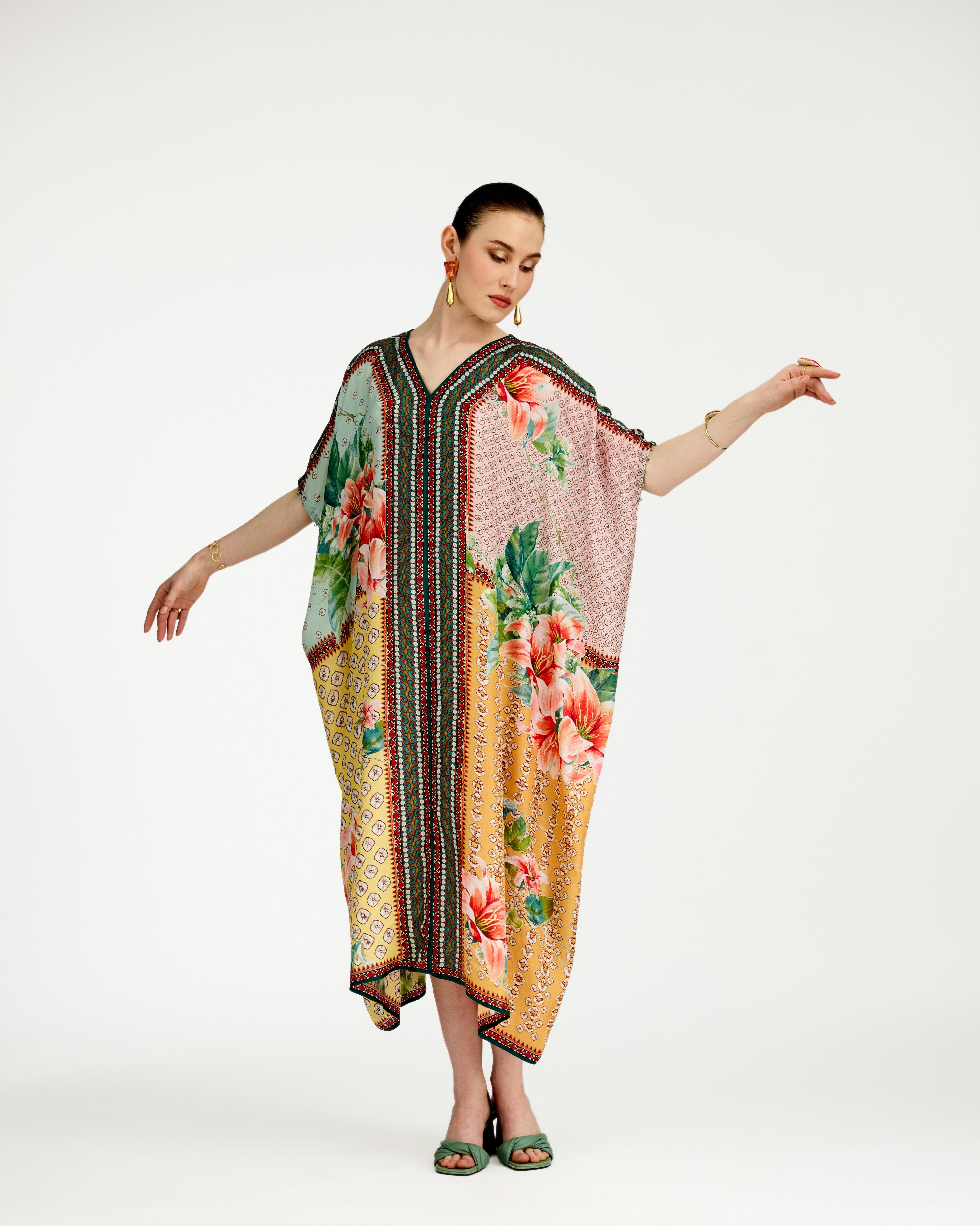 A 'V' neck draped kaftan printed on our soft buttery silk.