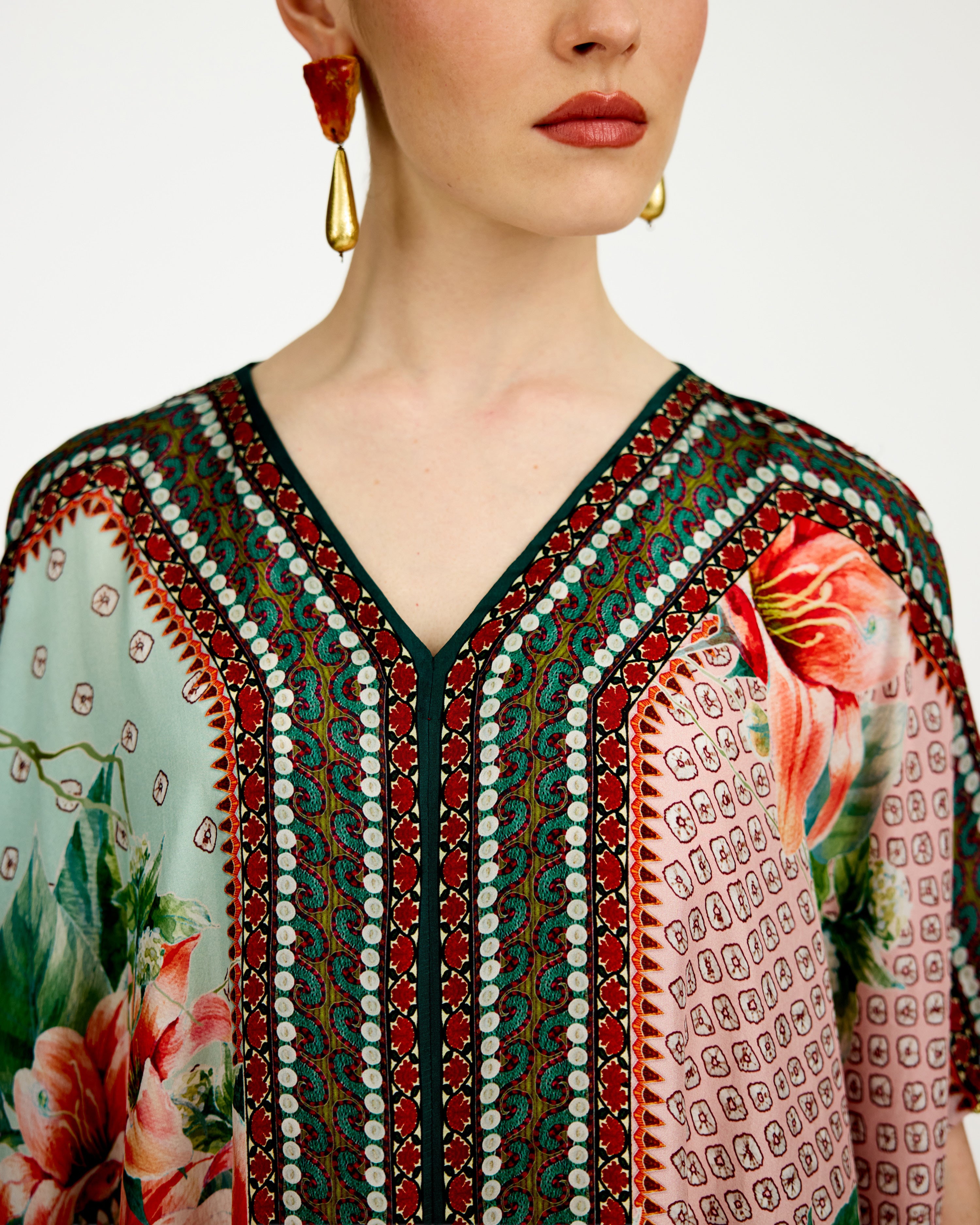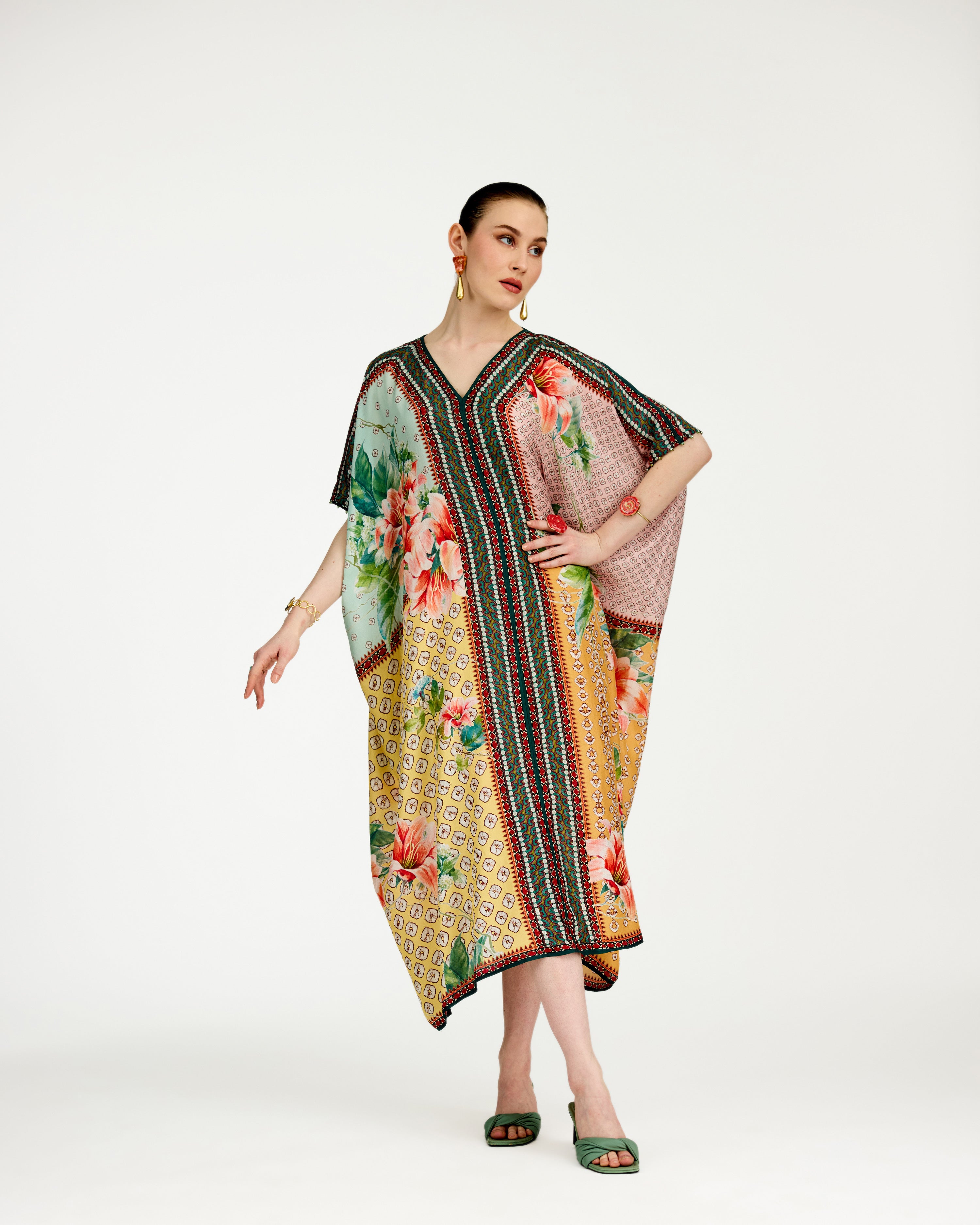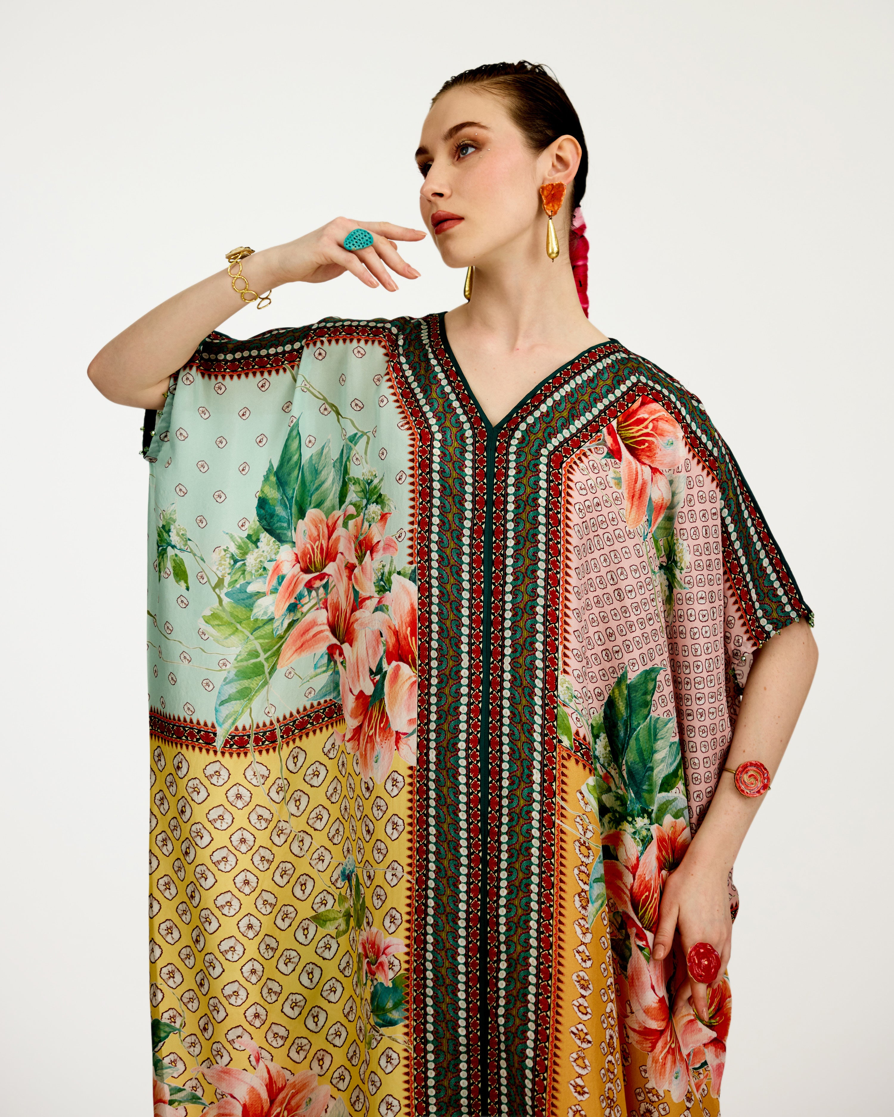 A 'V' neck draped kaftan printed on our soft buttery silk.