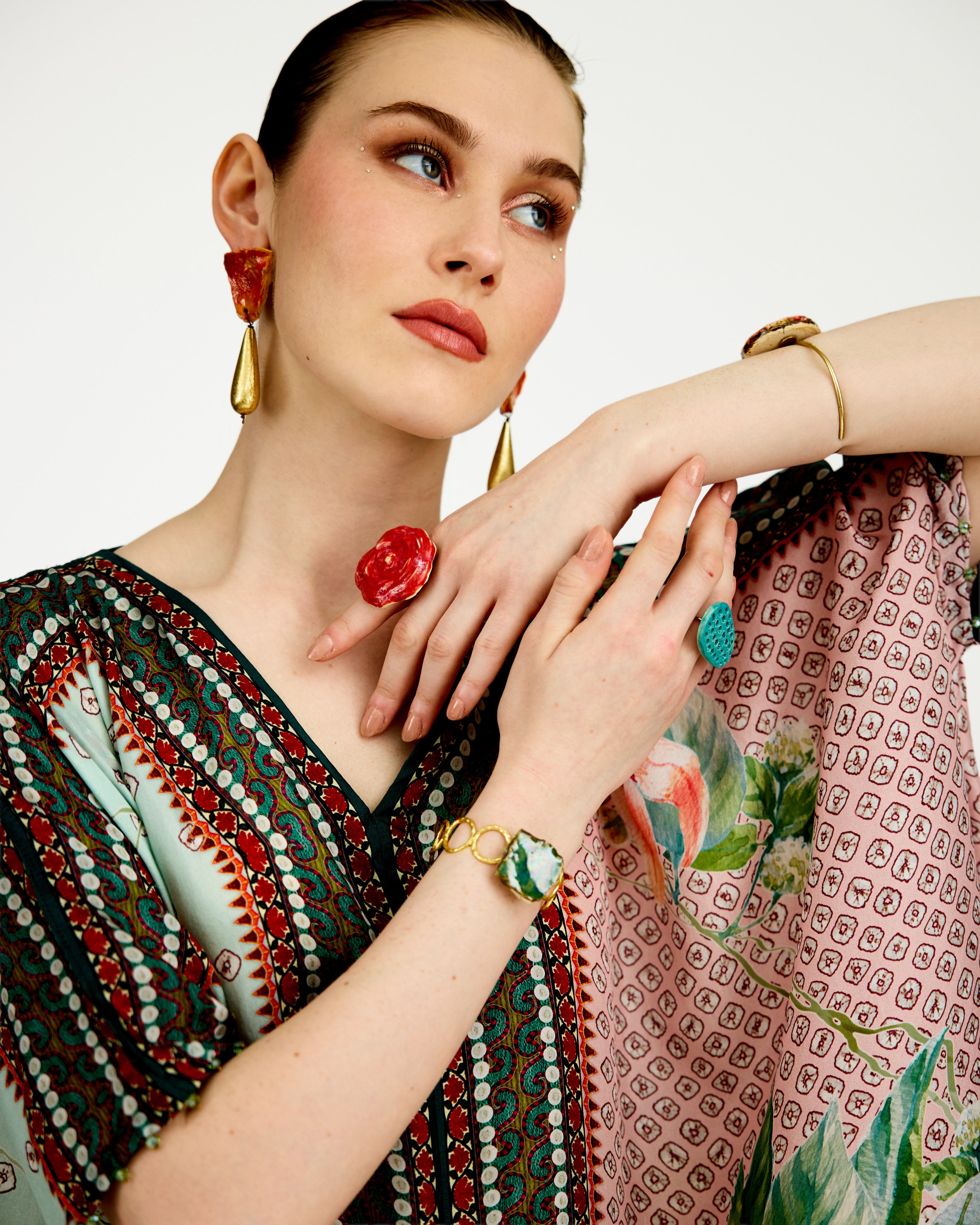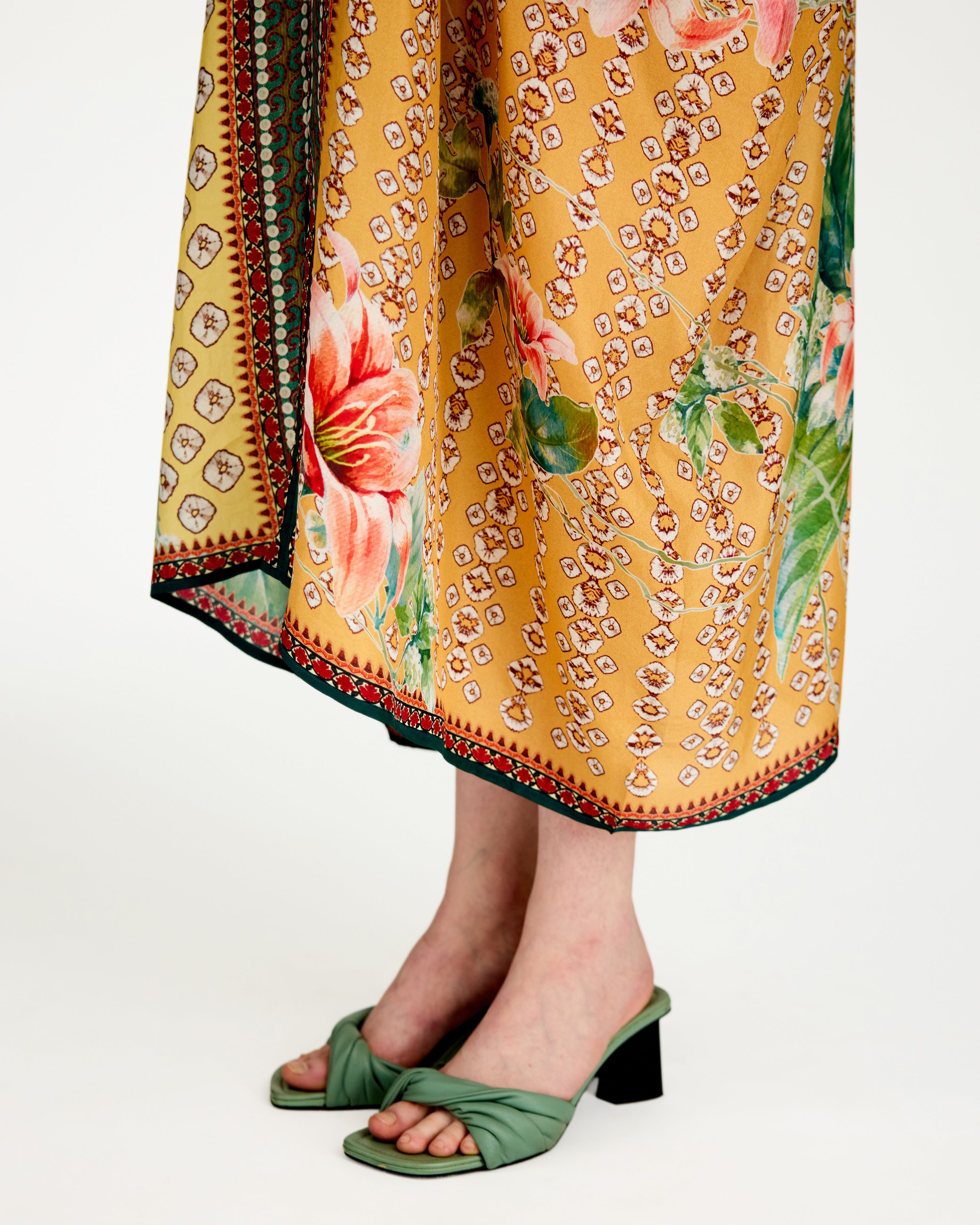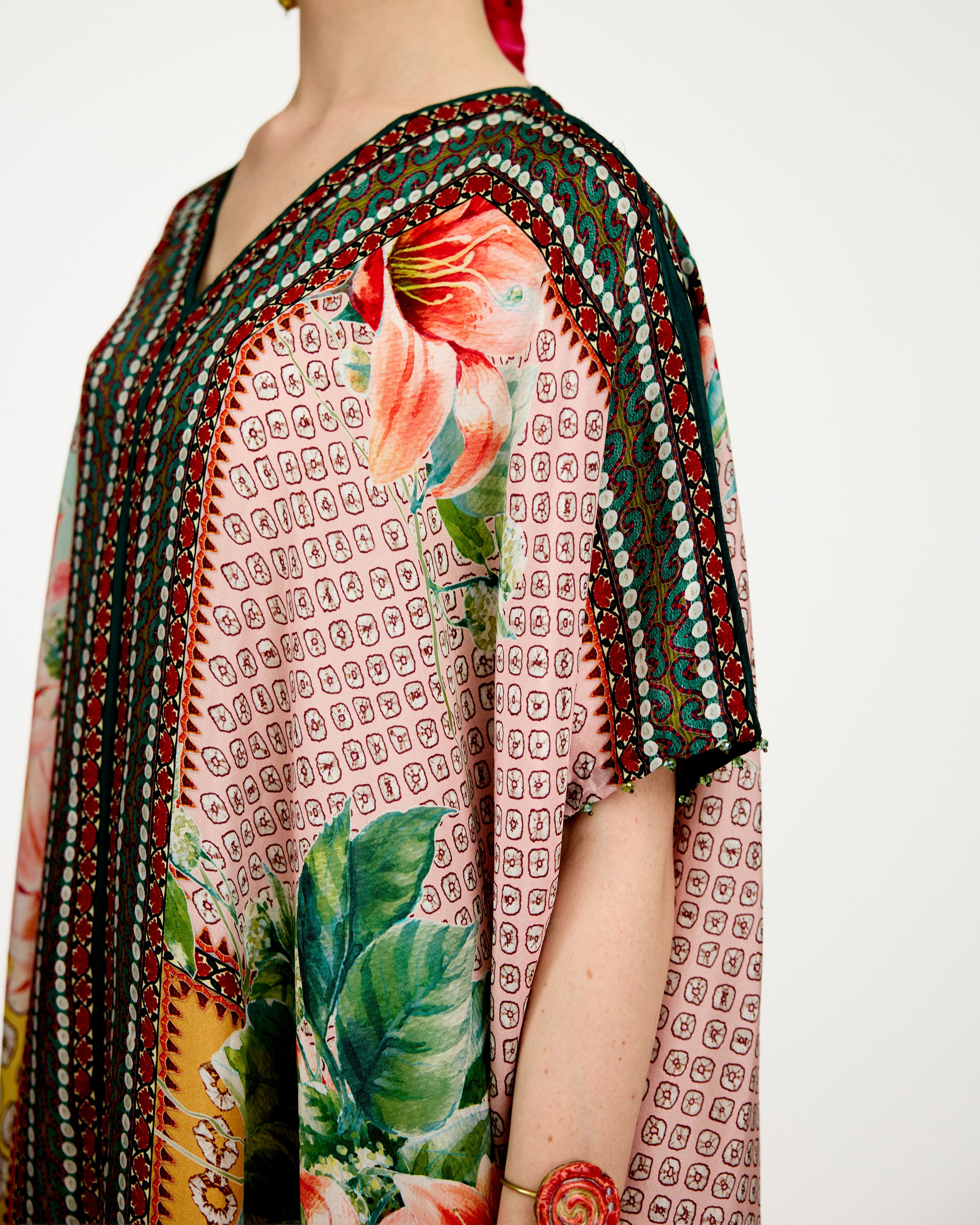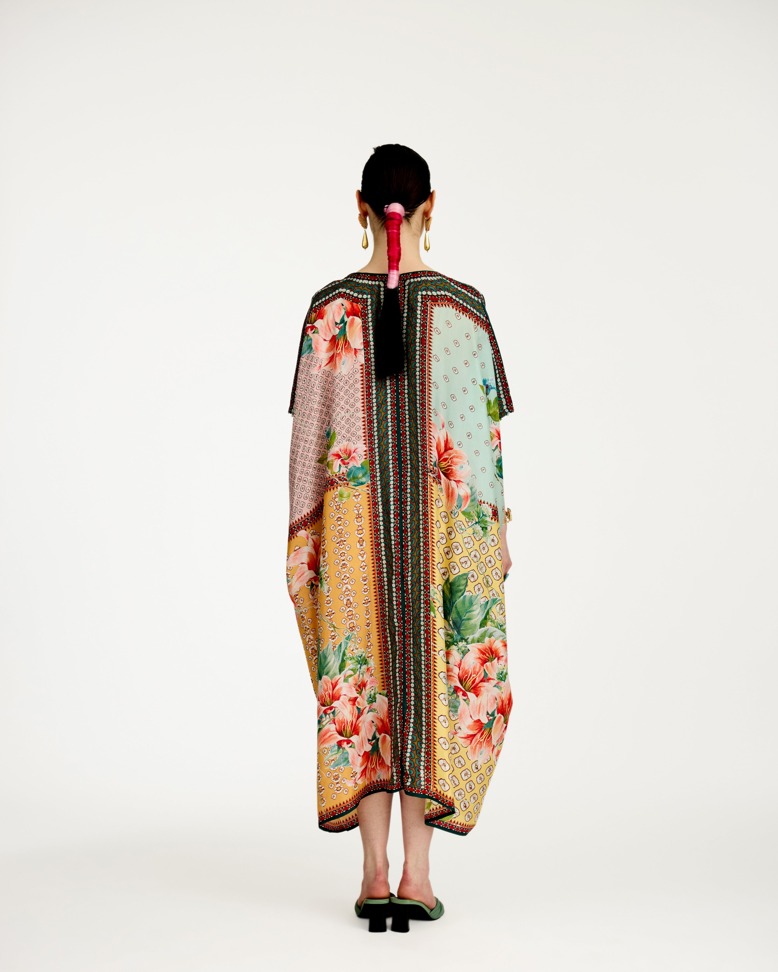 A 'V' neck draped kaftan printed on our soft buttery silk.