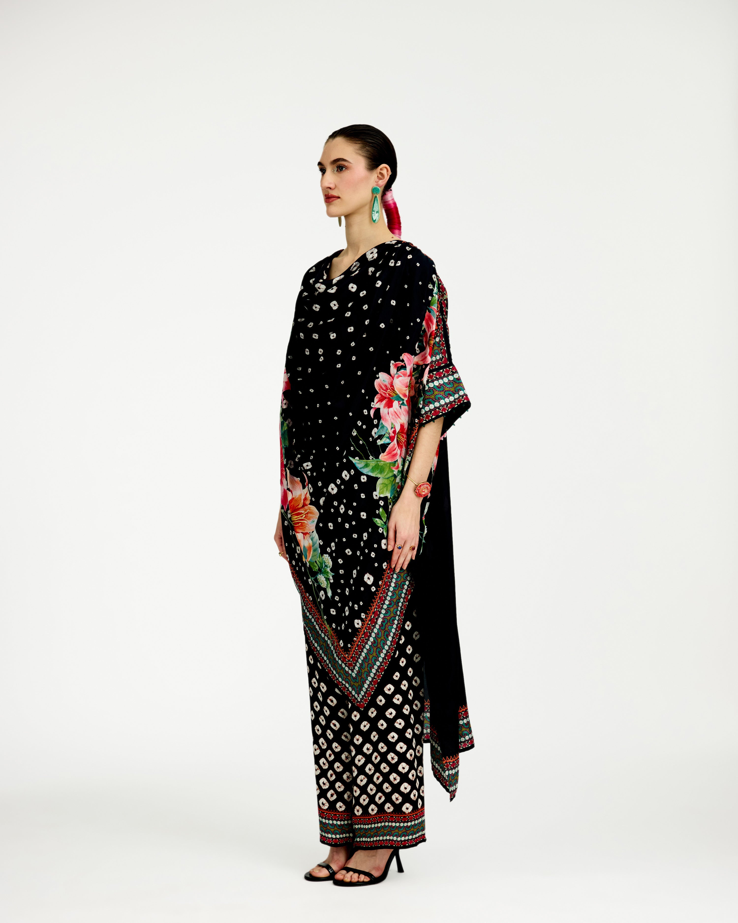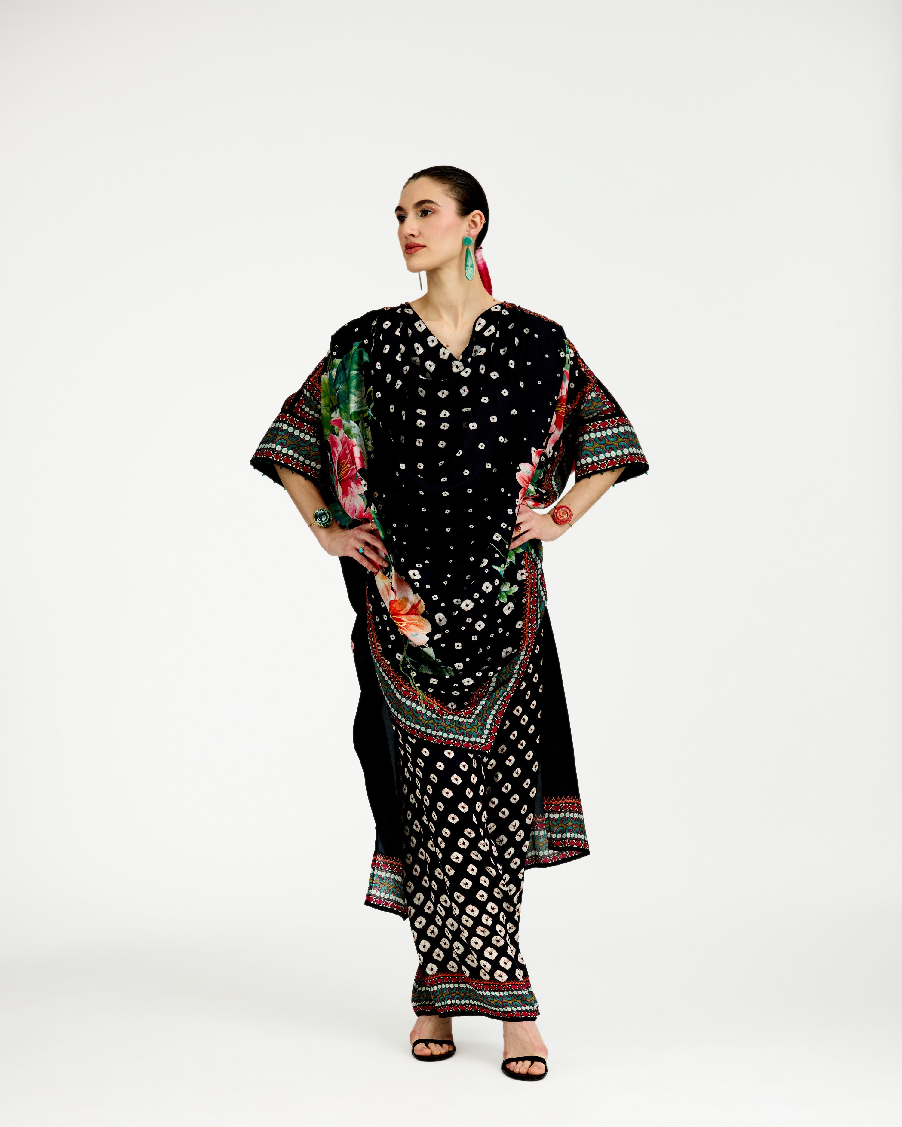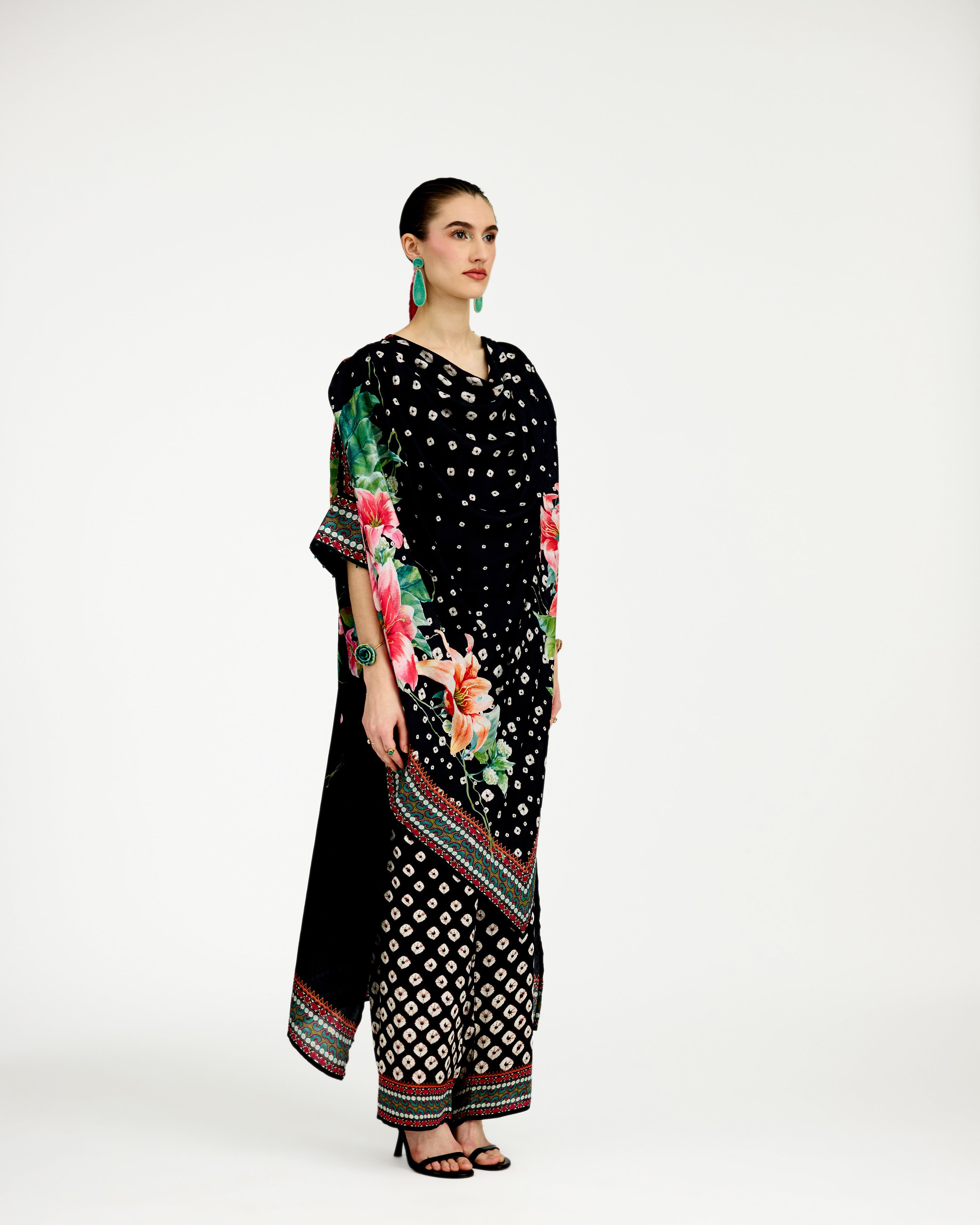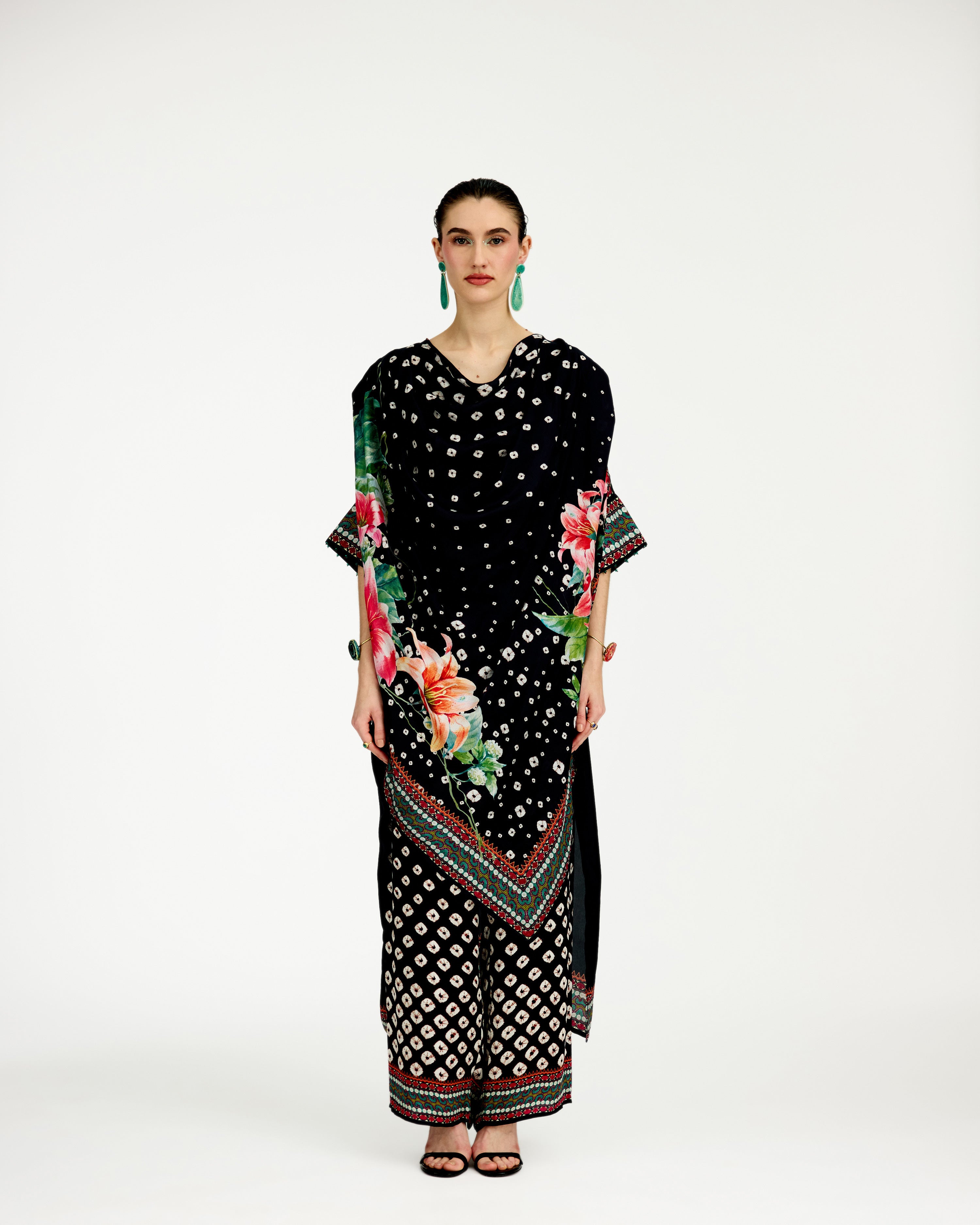 The kaftan tunic has a lovely cowl neckline with drop sleeves and a 'v' hem at the front. The back of the tunic is a straight cut.