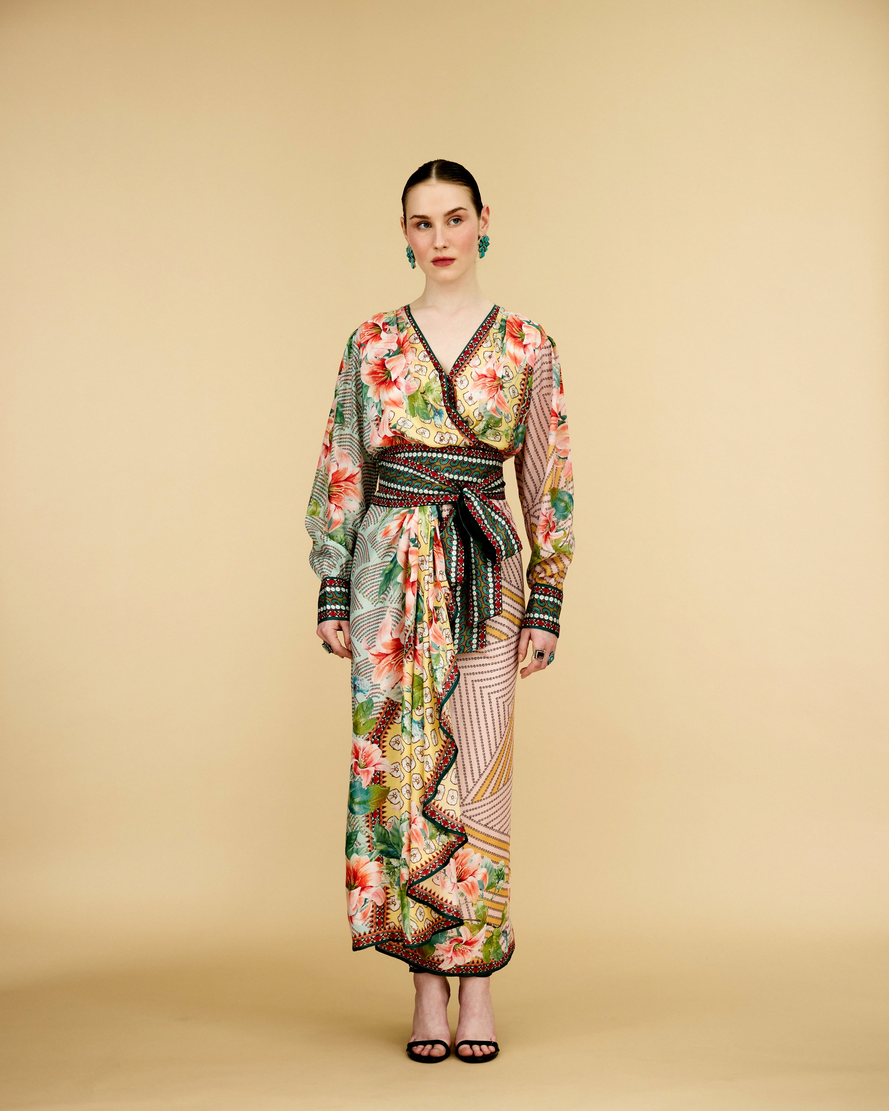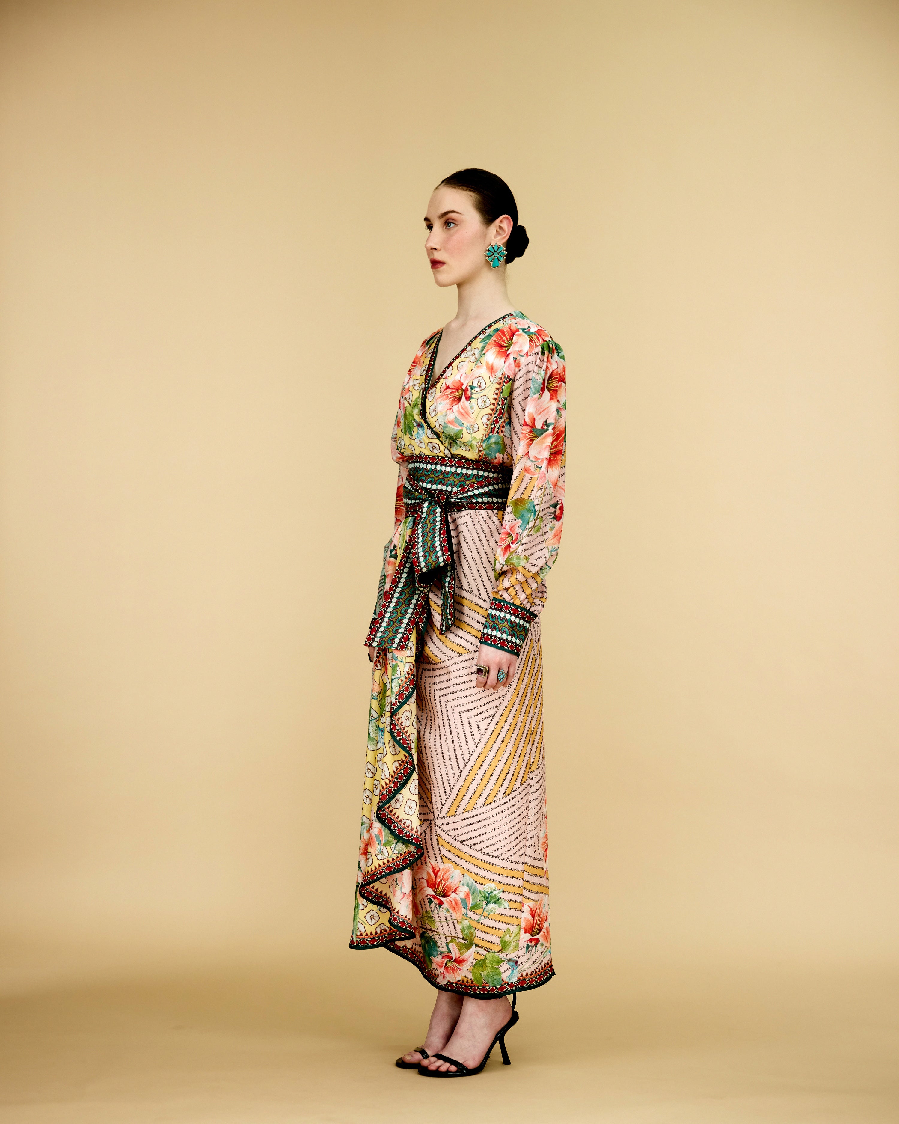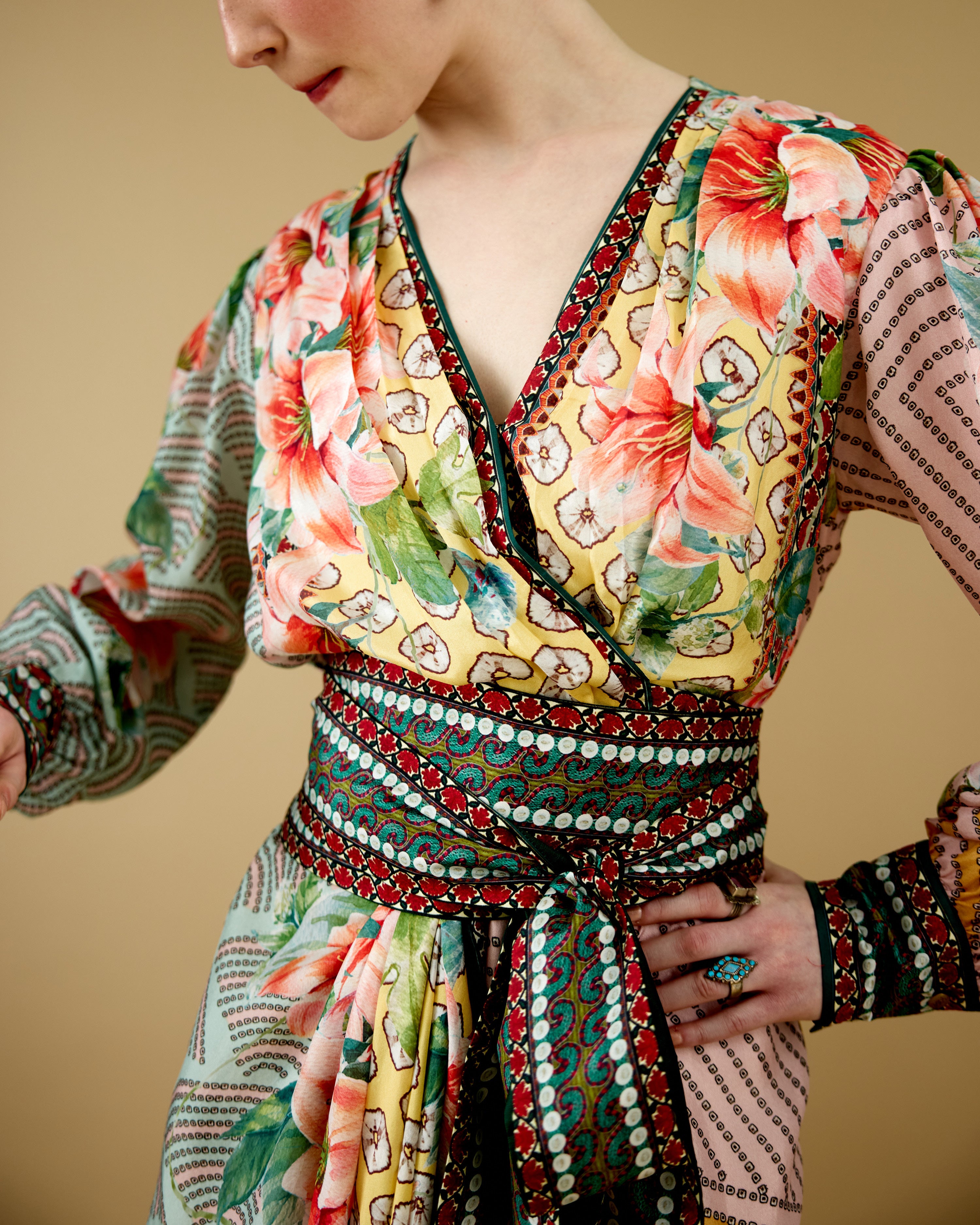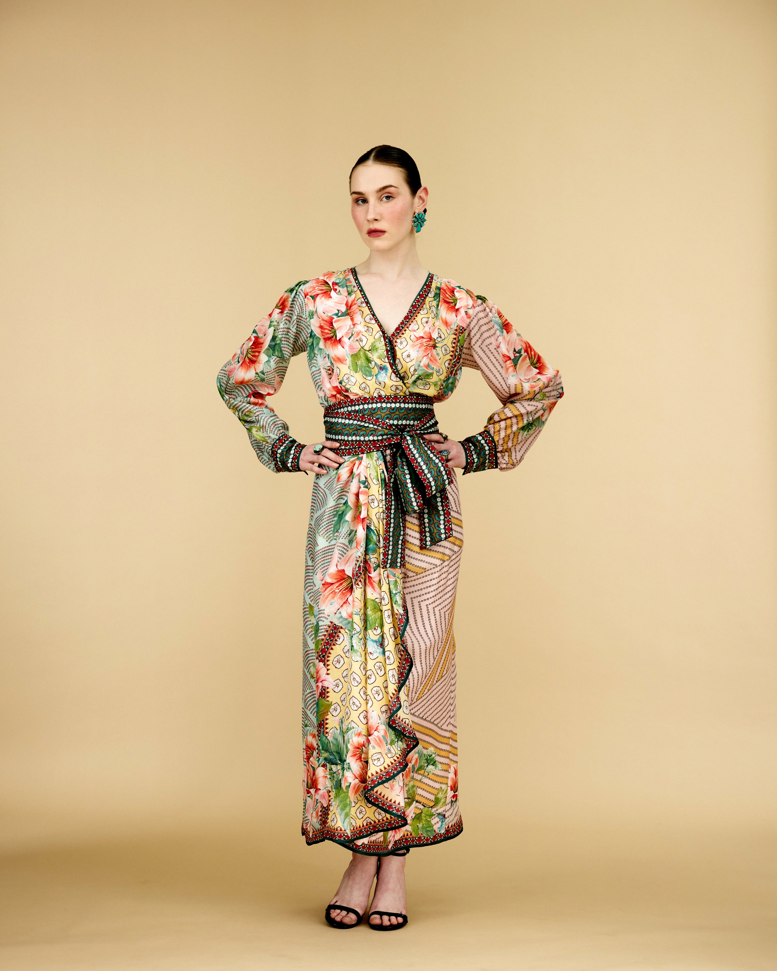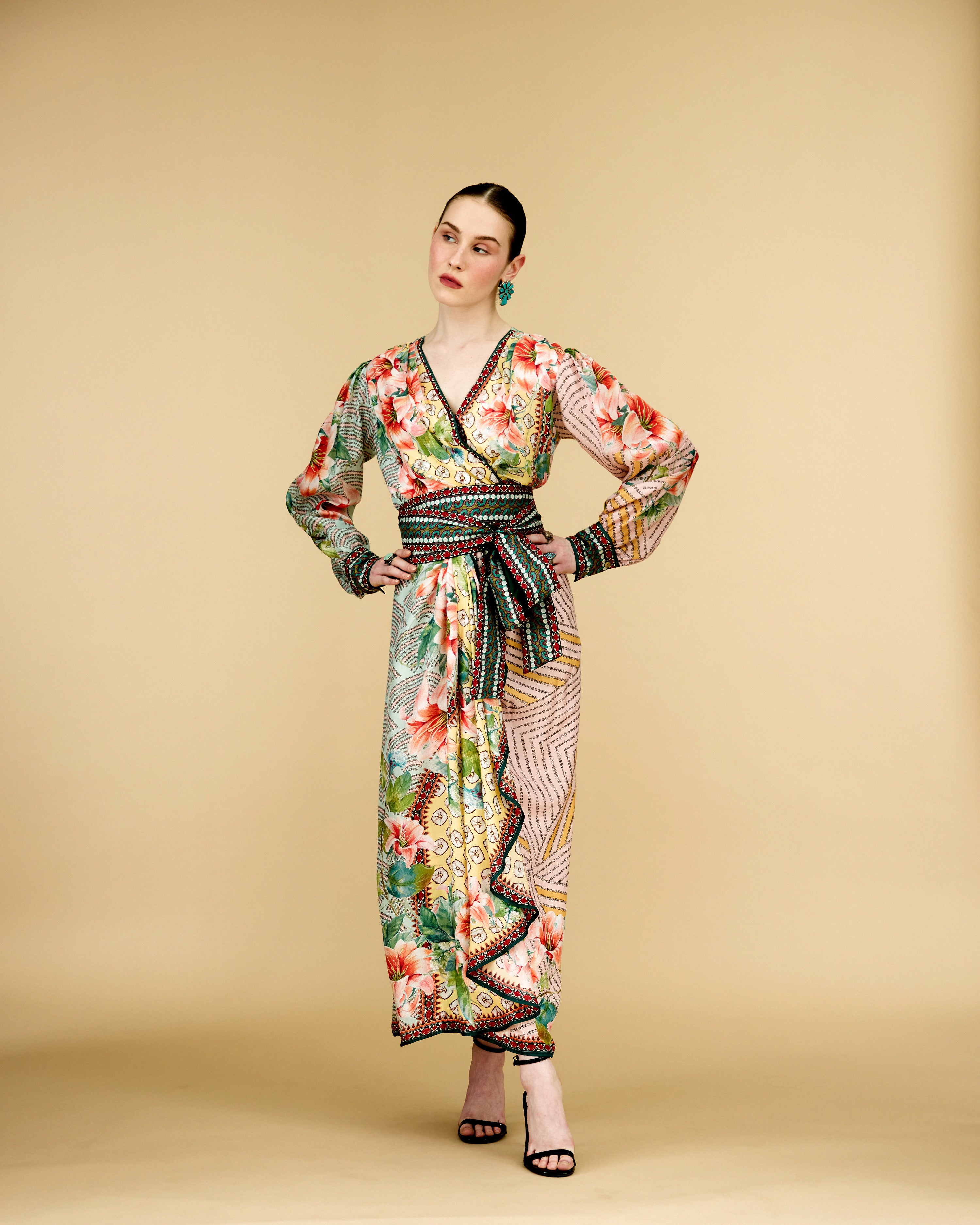 The wrap dress is fully lined in a soft cotton shantoon to match.