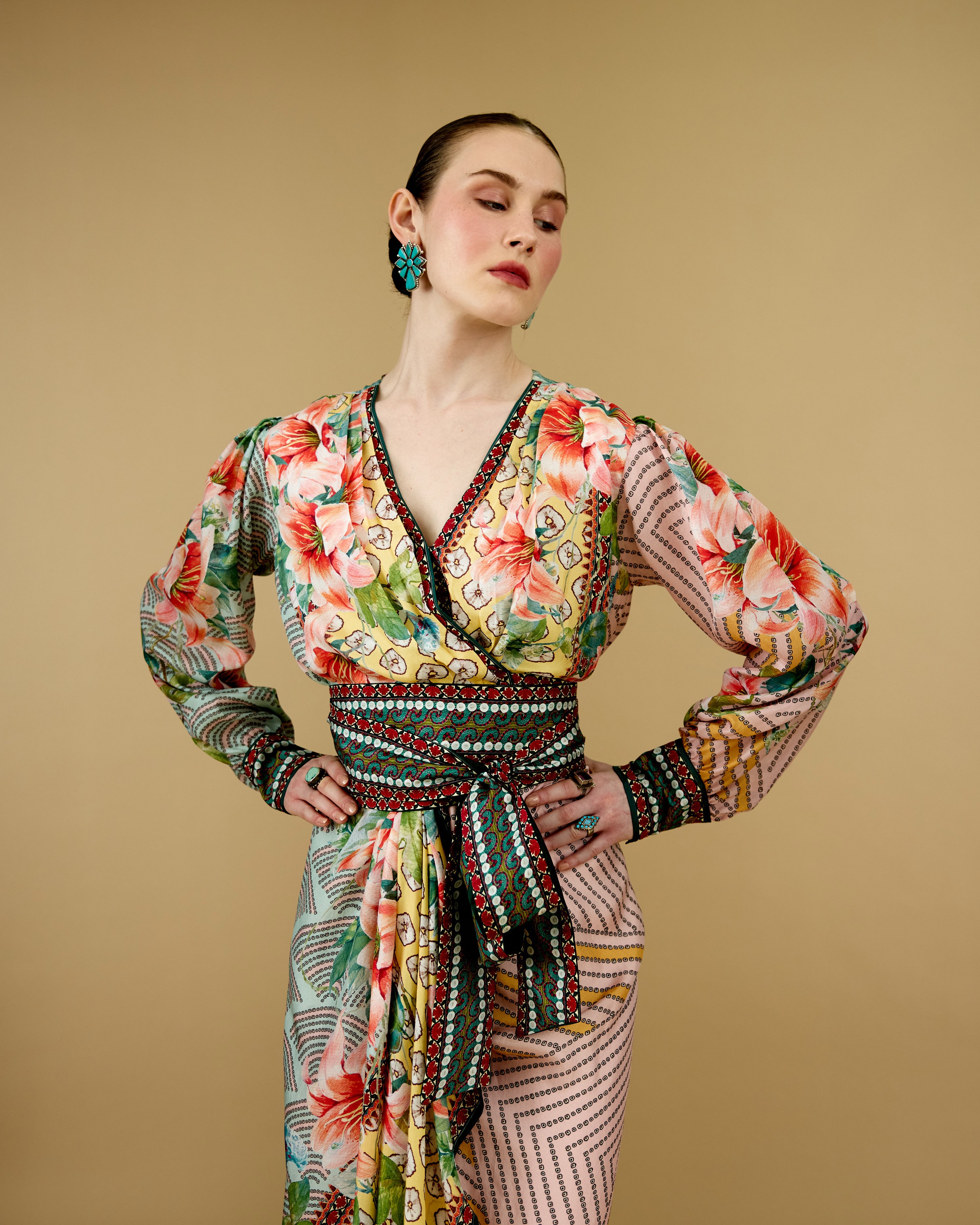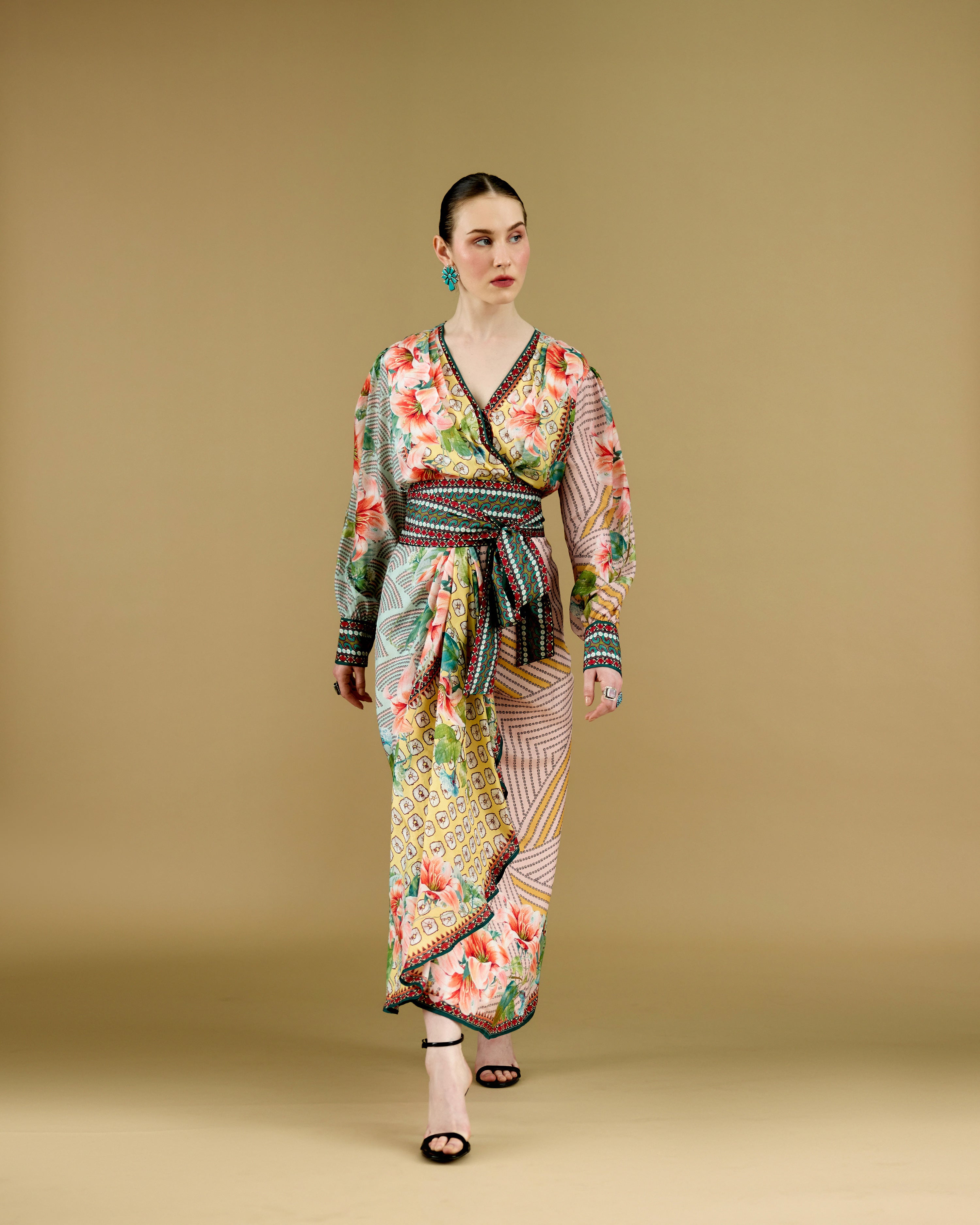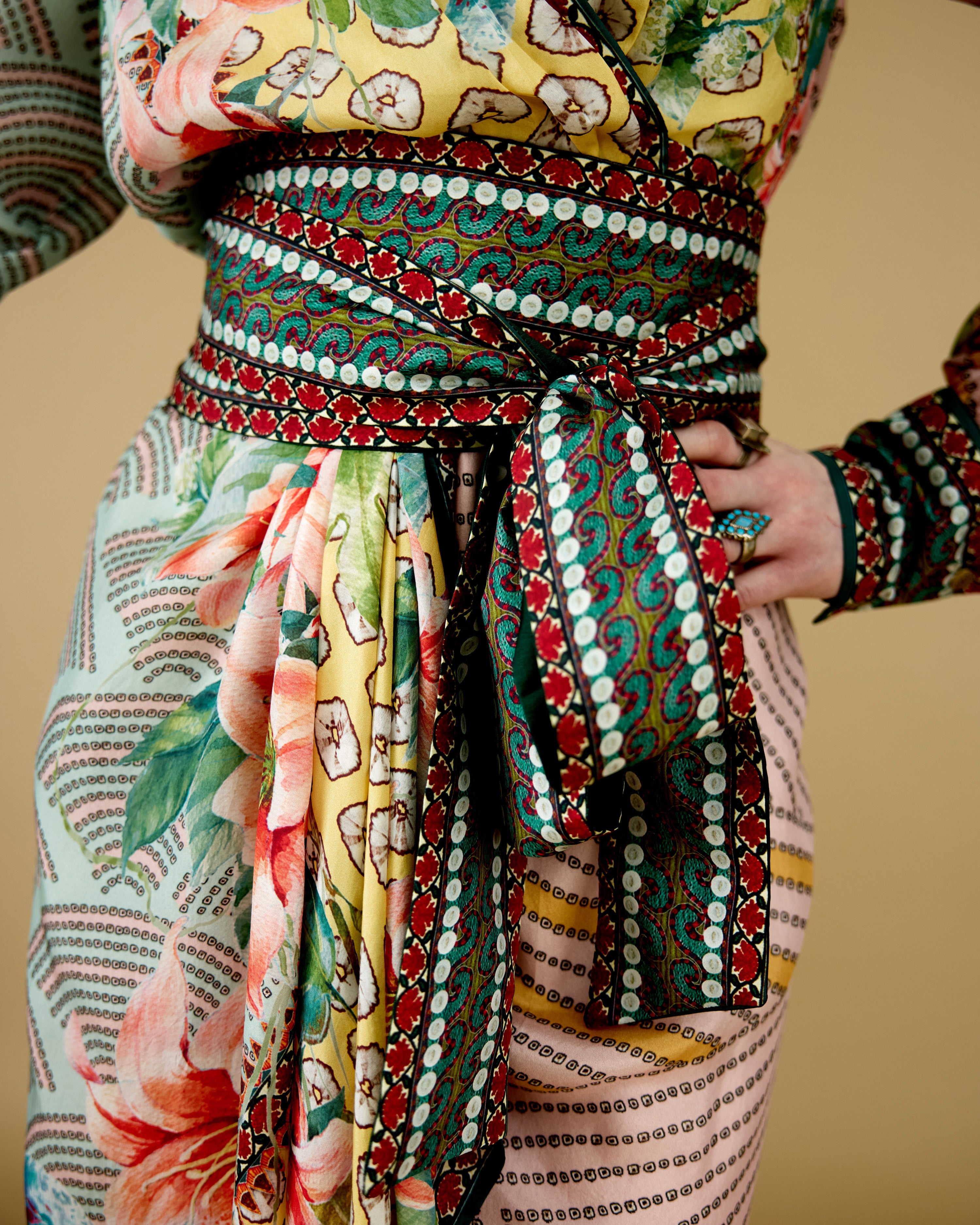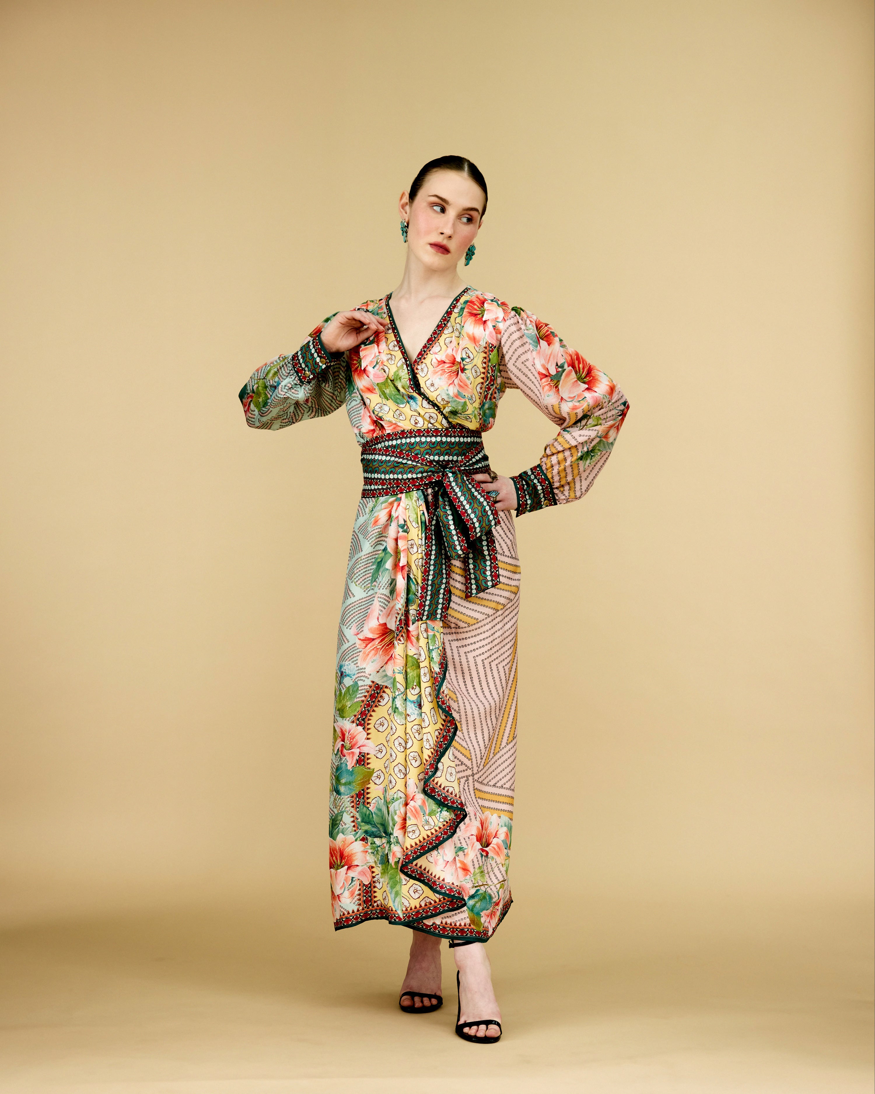 The wrap dress is fully lined in a soft cotton shantoon to match.