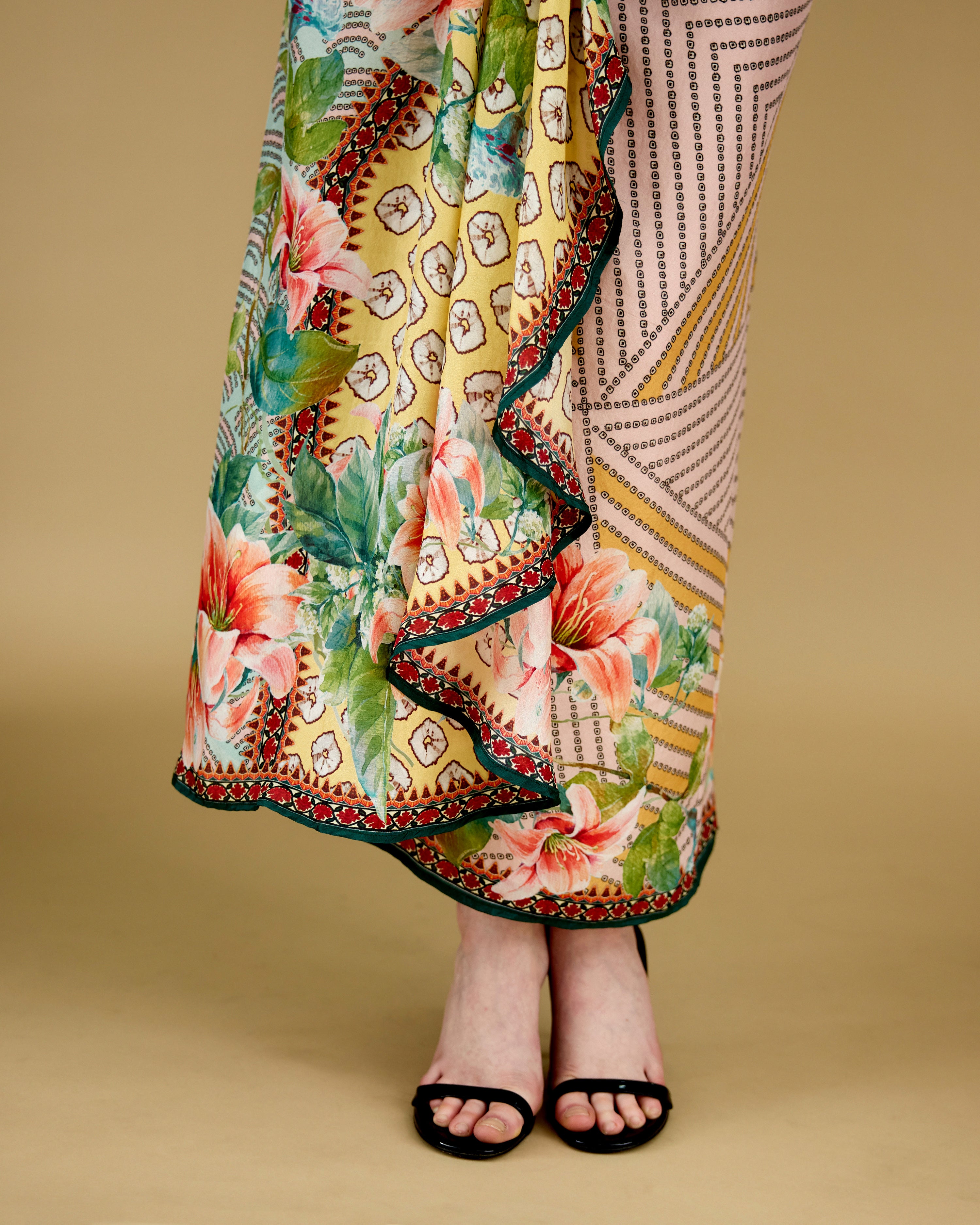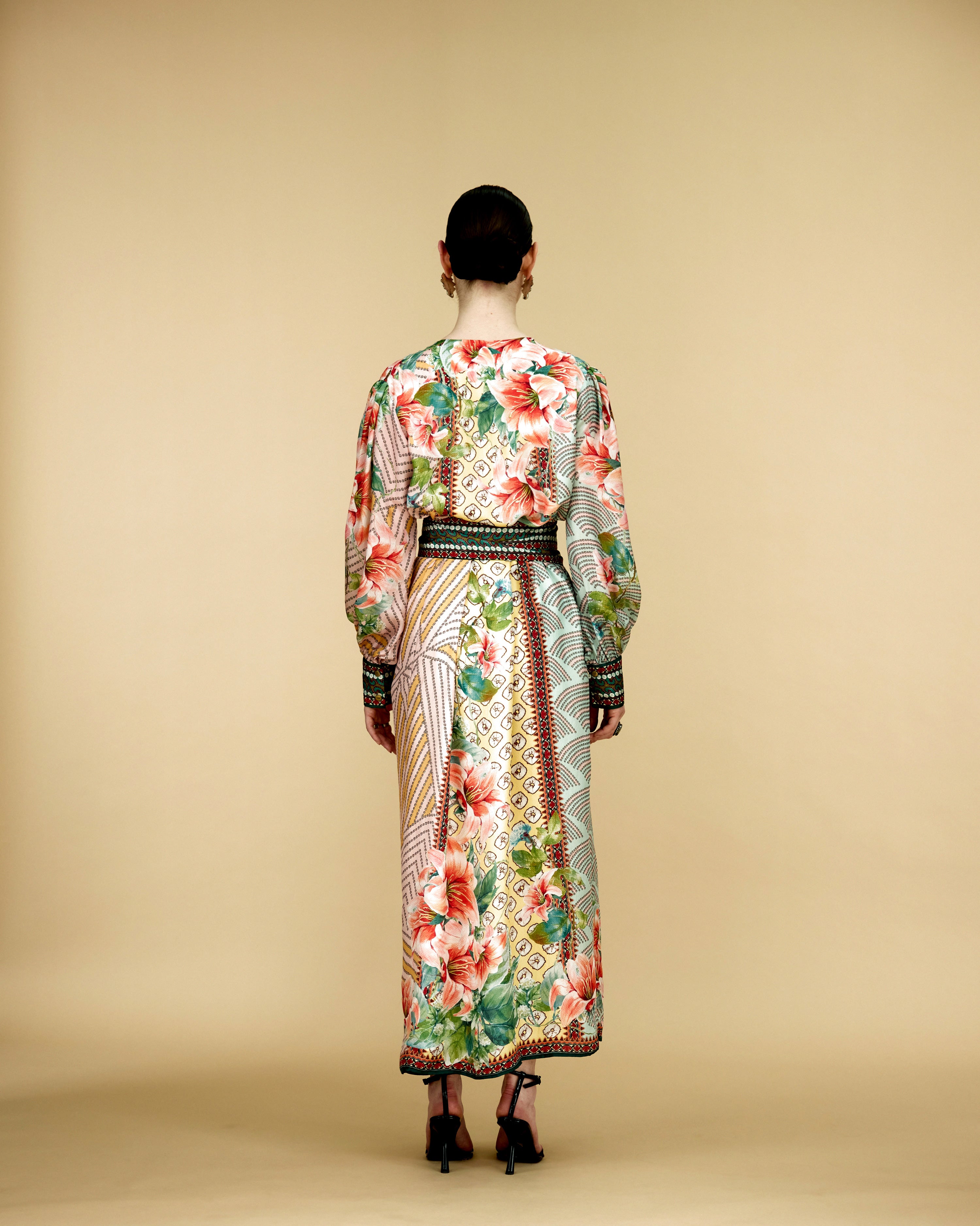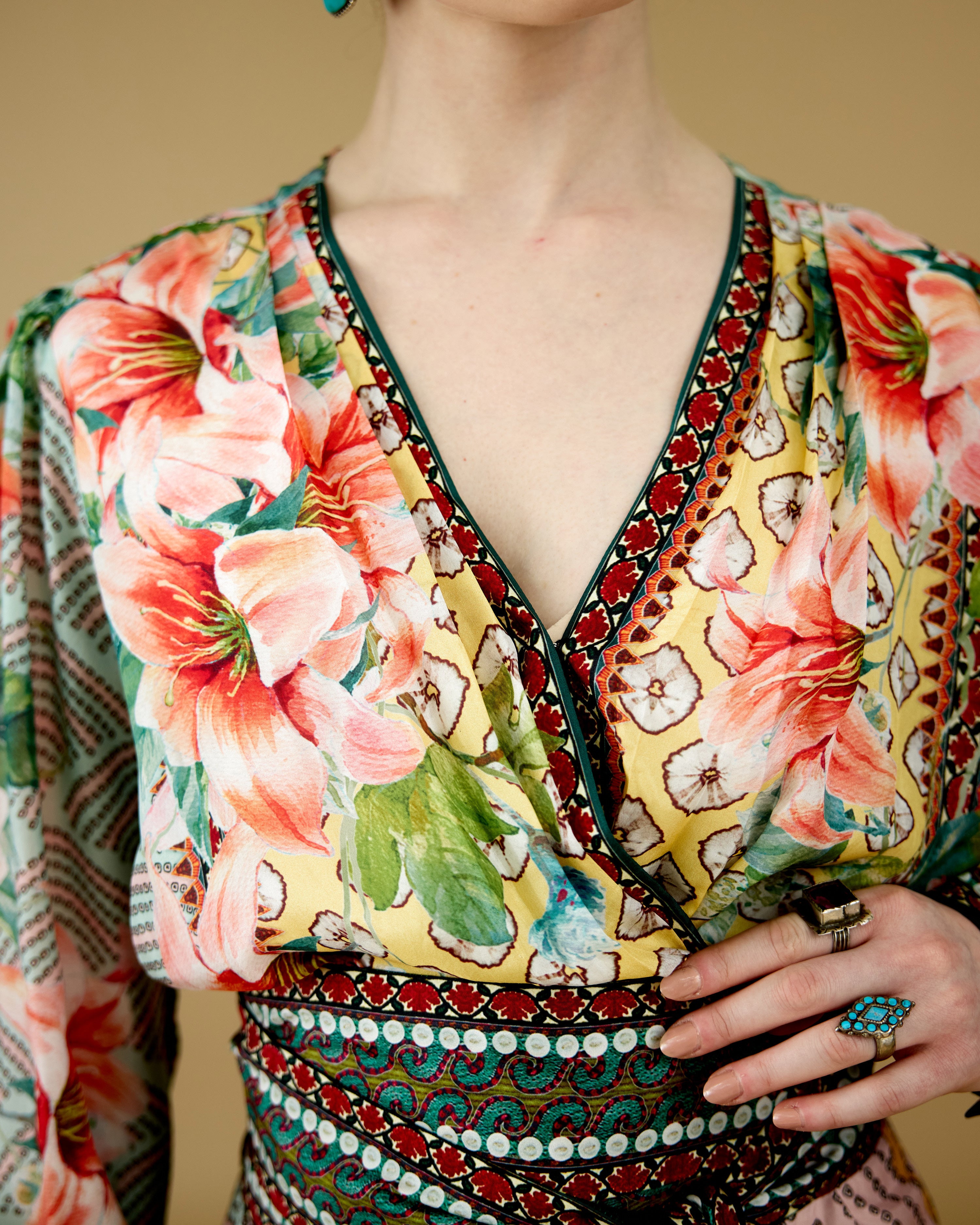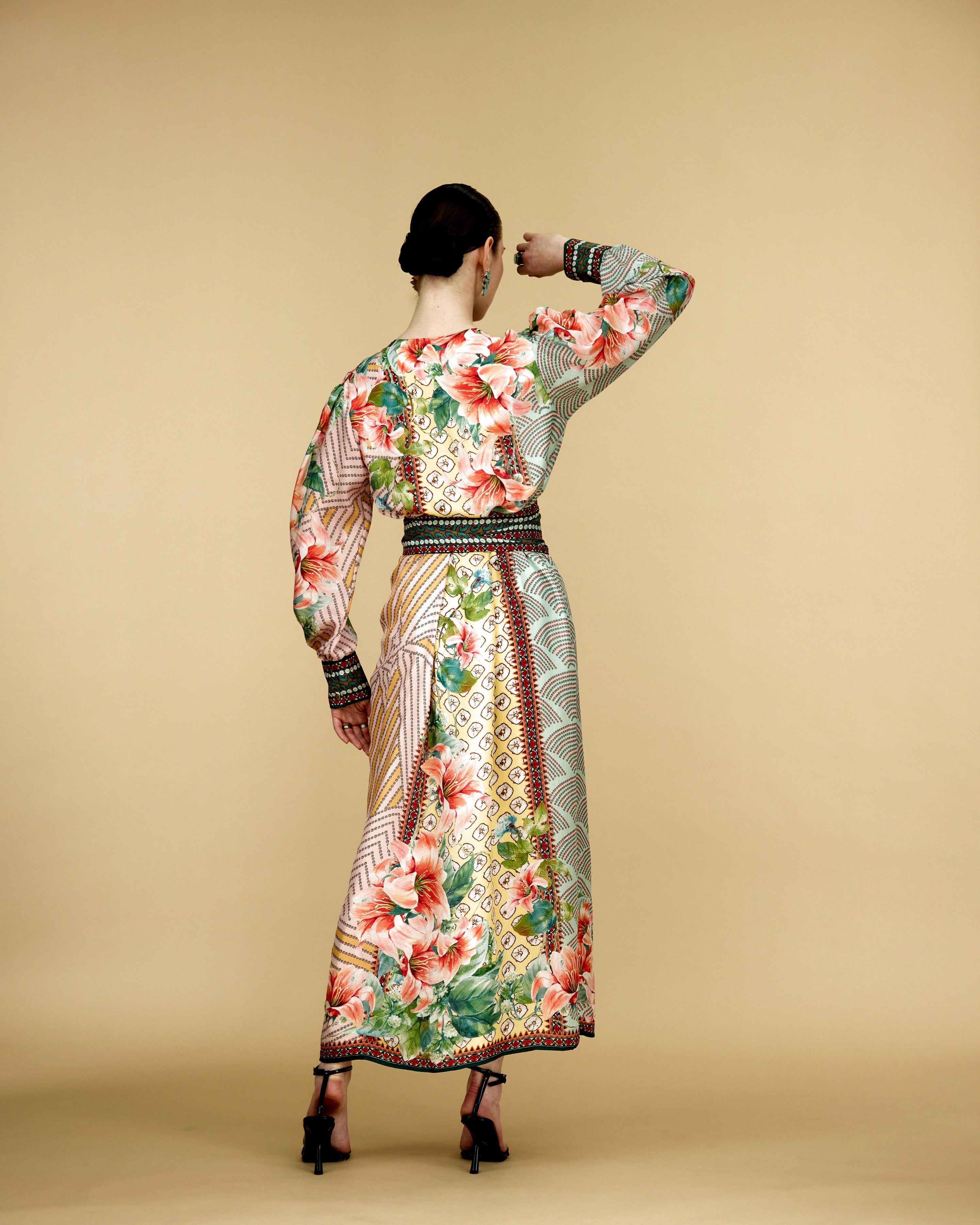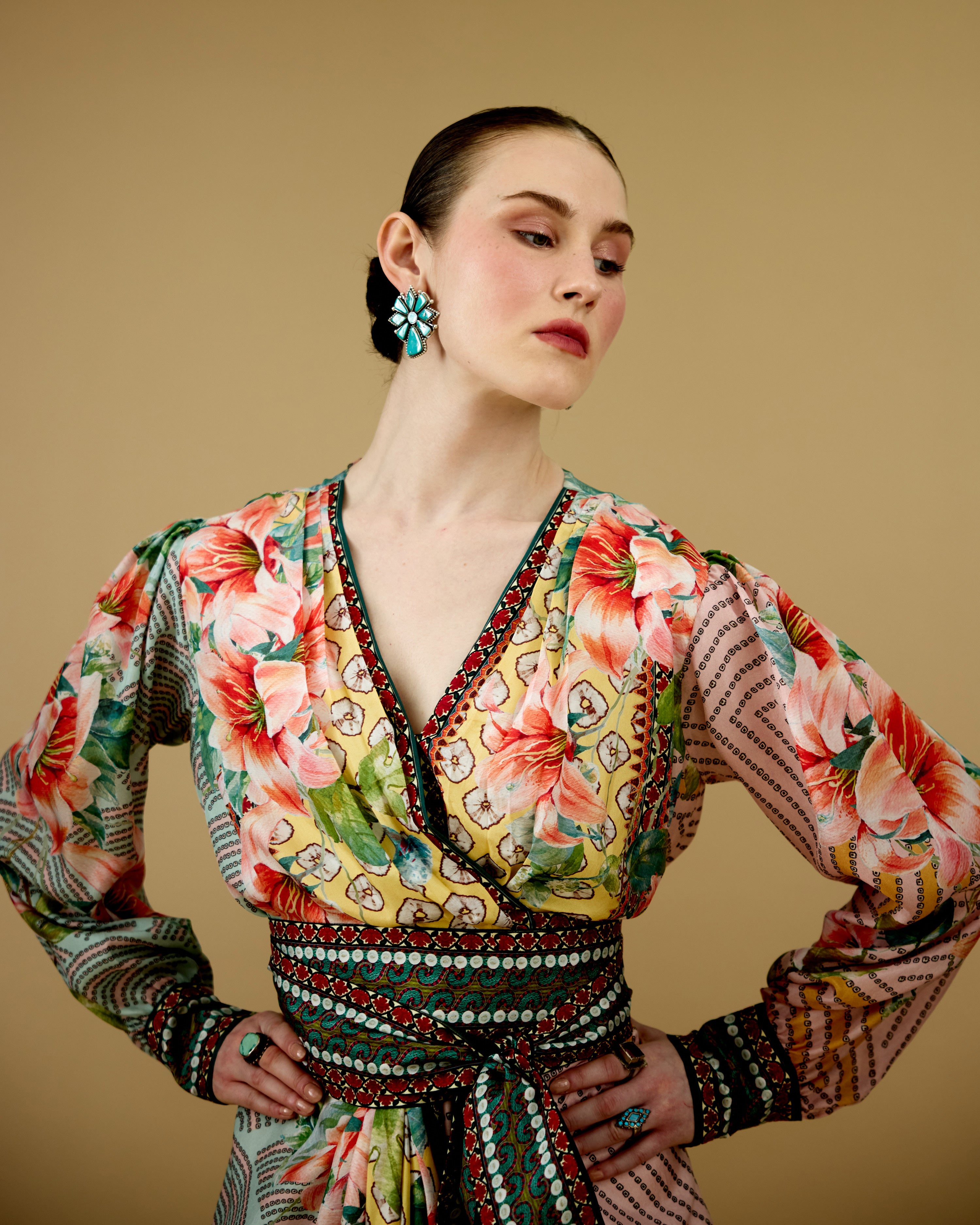 The wrap dress is fully lined in a soft cotton shantoon to match.