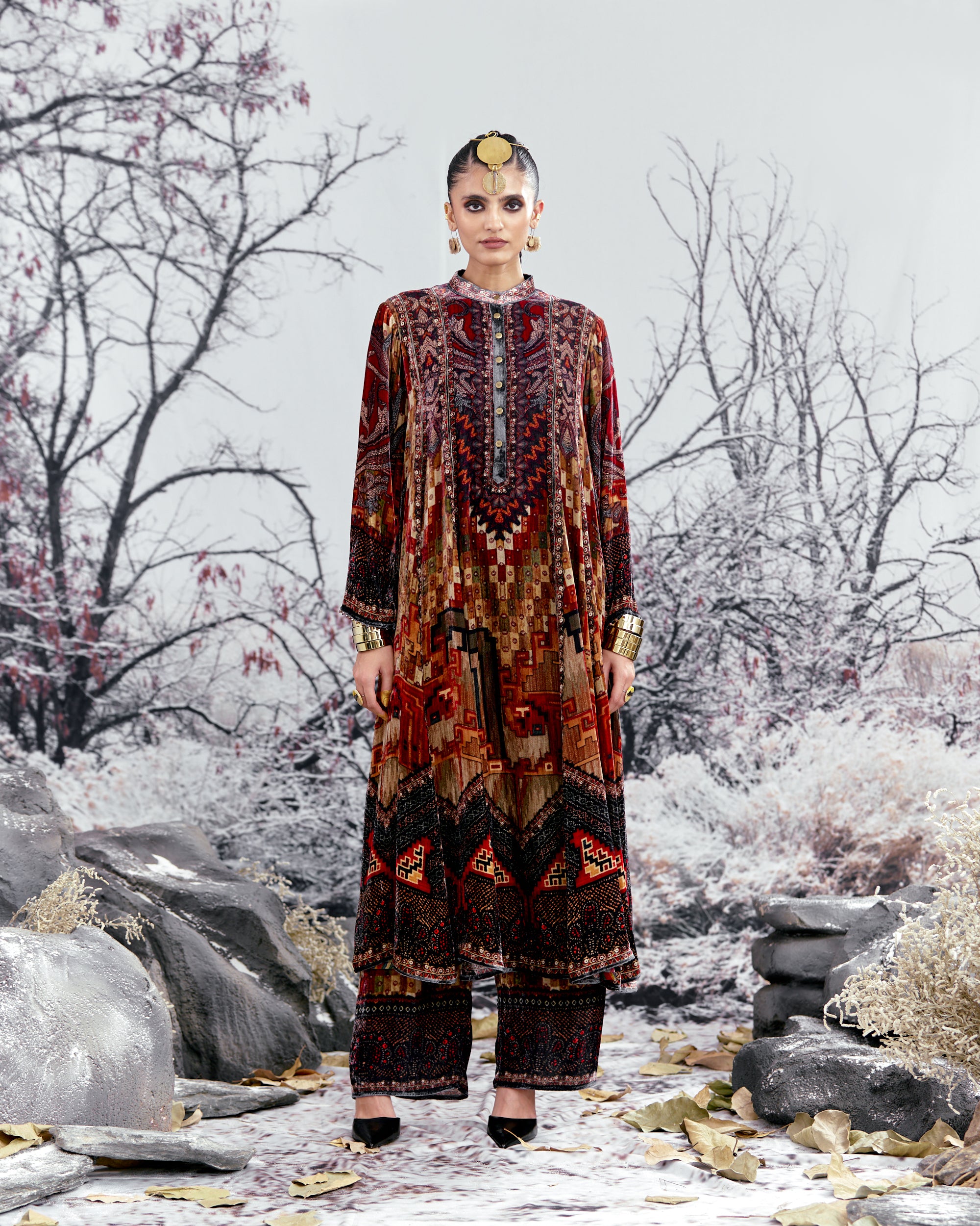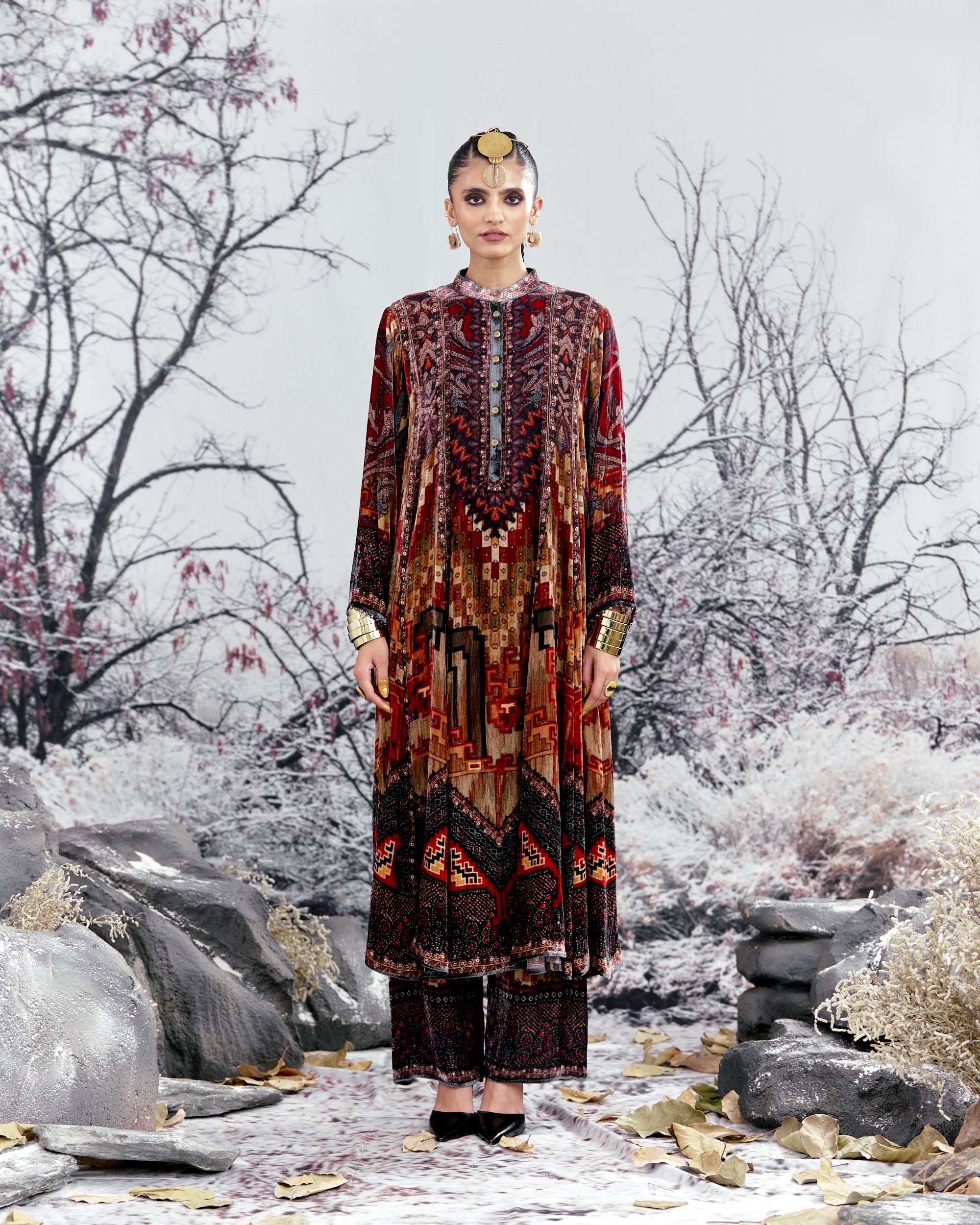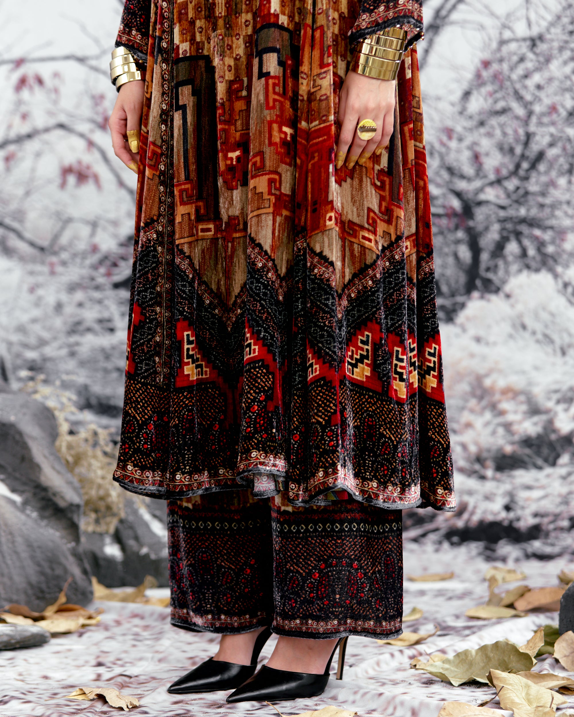 The Anarkali/tunic also comes with a matching pair of printed palazzo pants with a coordinating border at the bottom hem which completes the look for this chic ensemble.