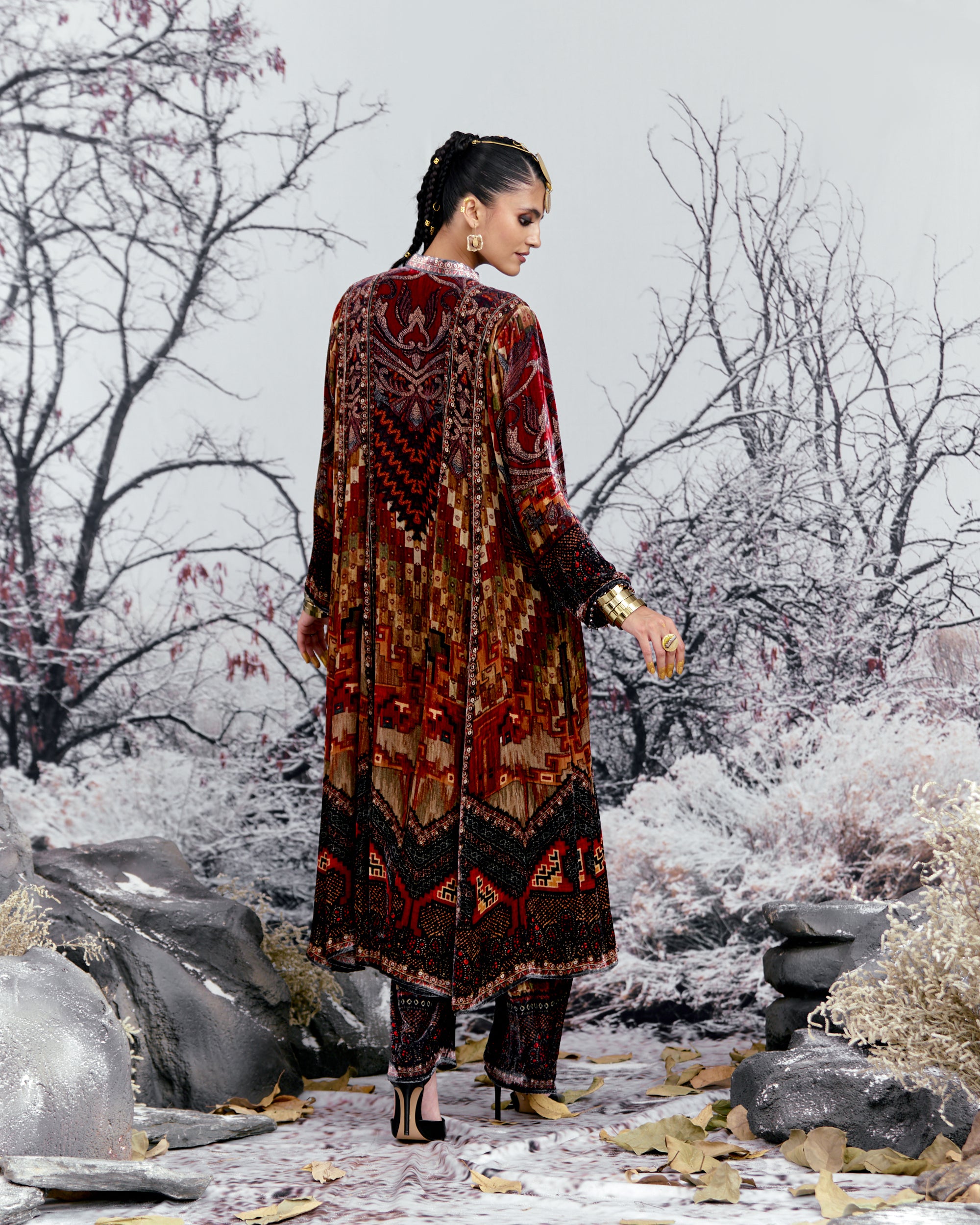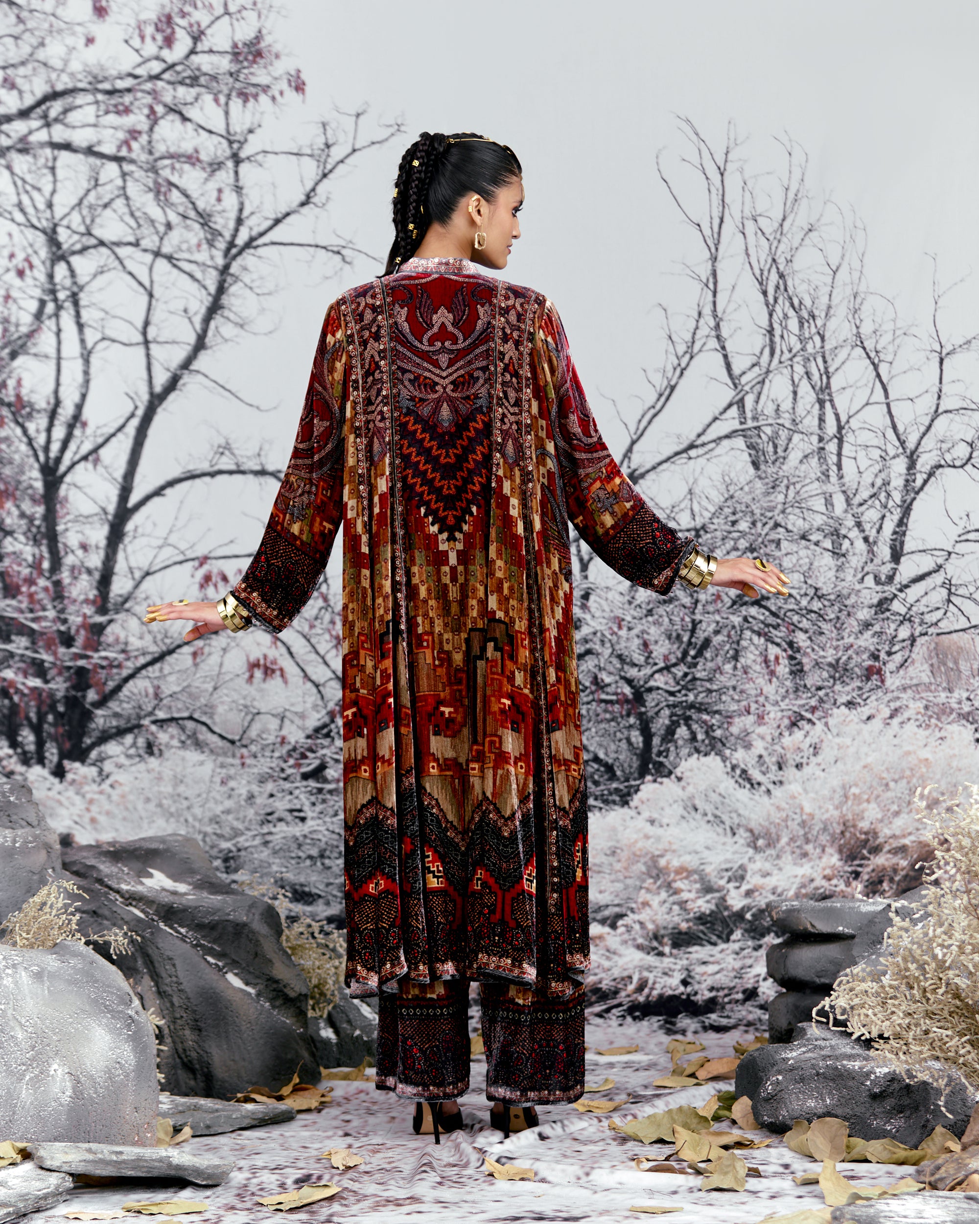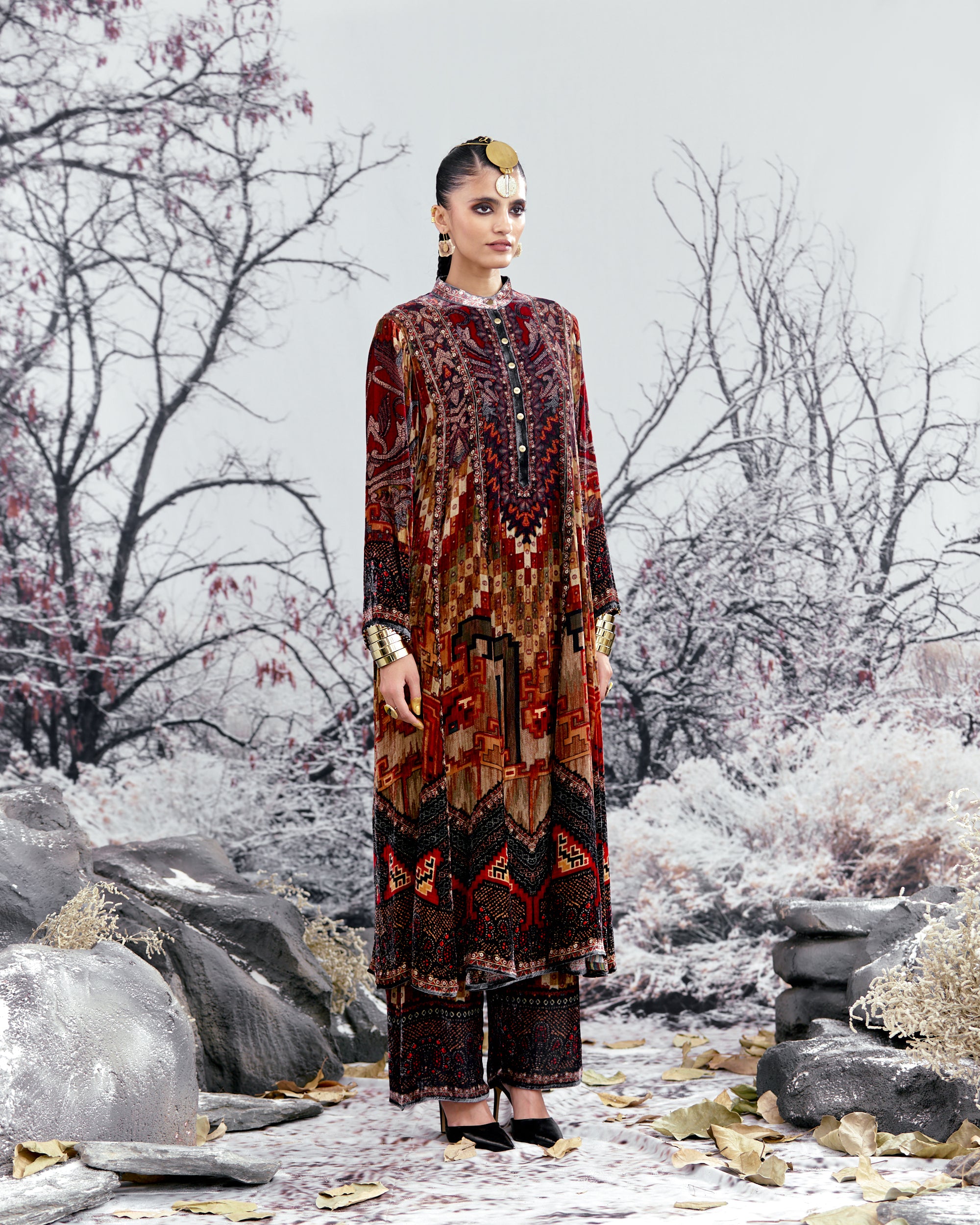 The Anarkali/tunic also comes with a matching pair of printed palazzo pants with a coordinating border at the bottom hem which completes the look for this chic ensemble.