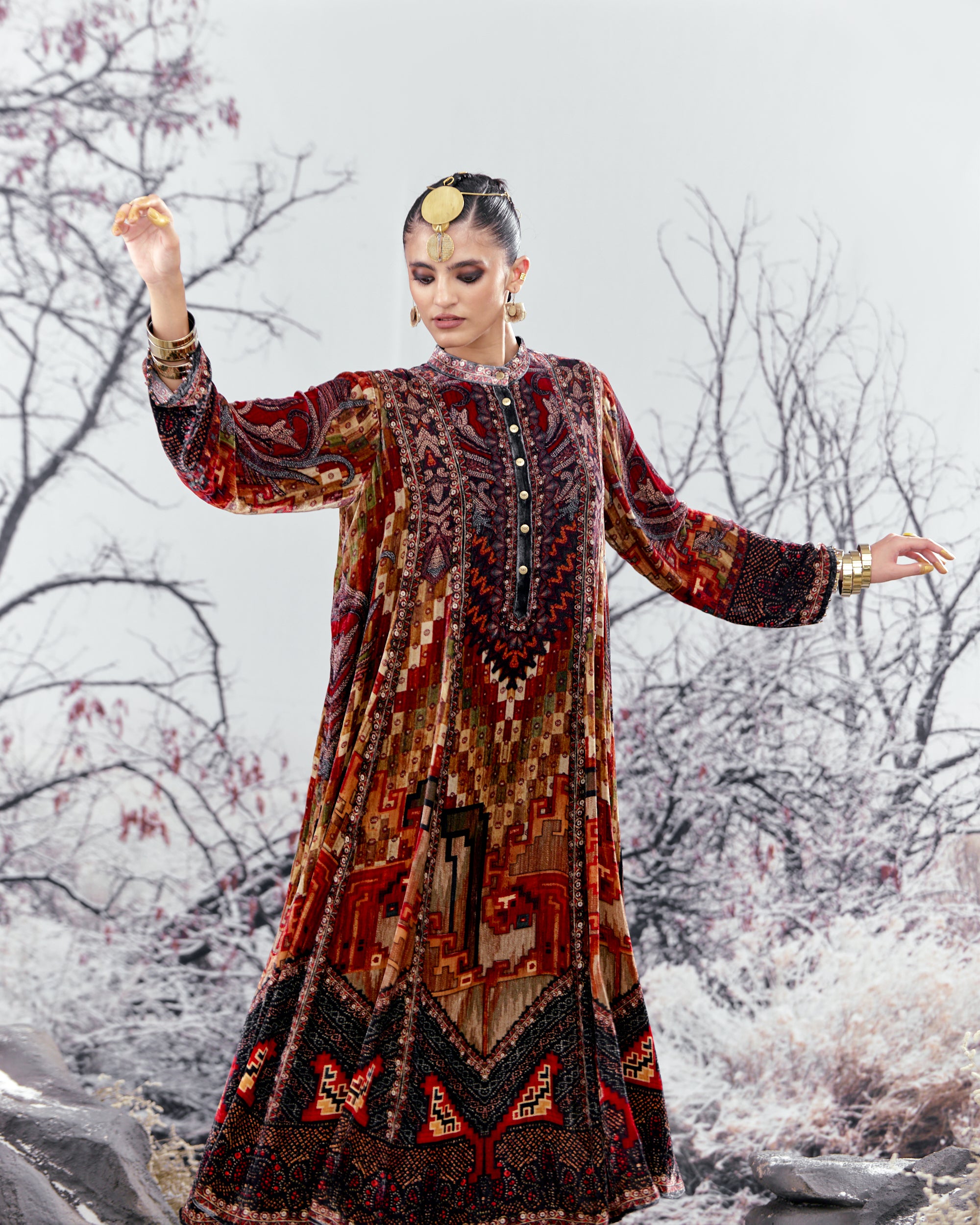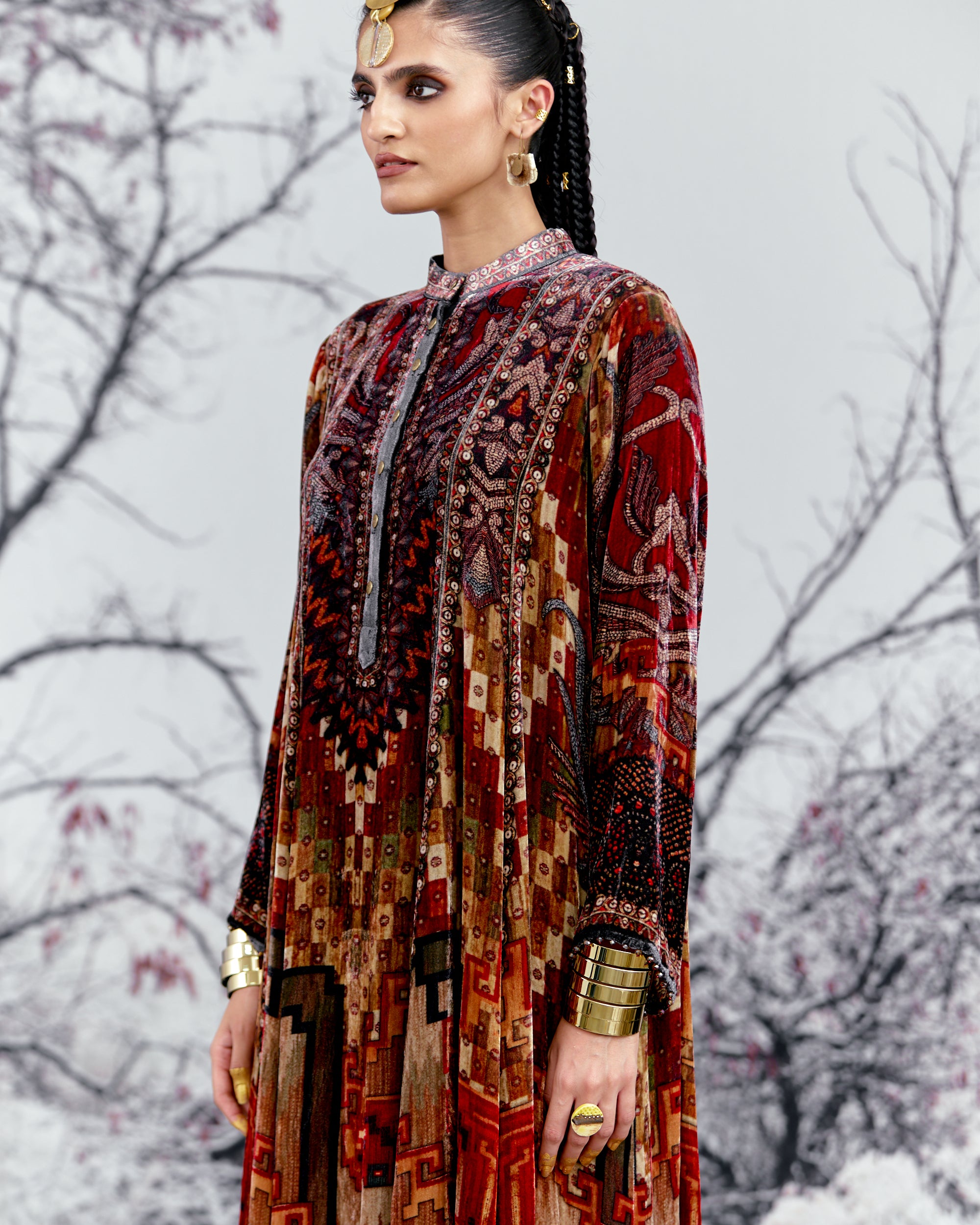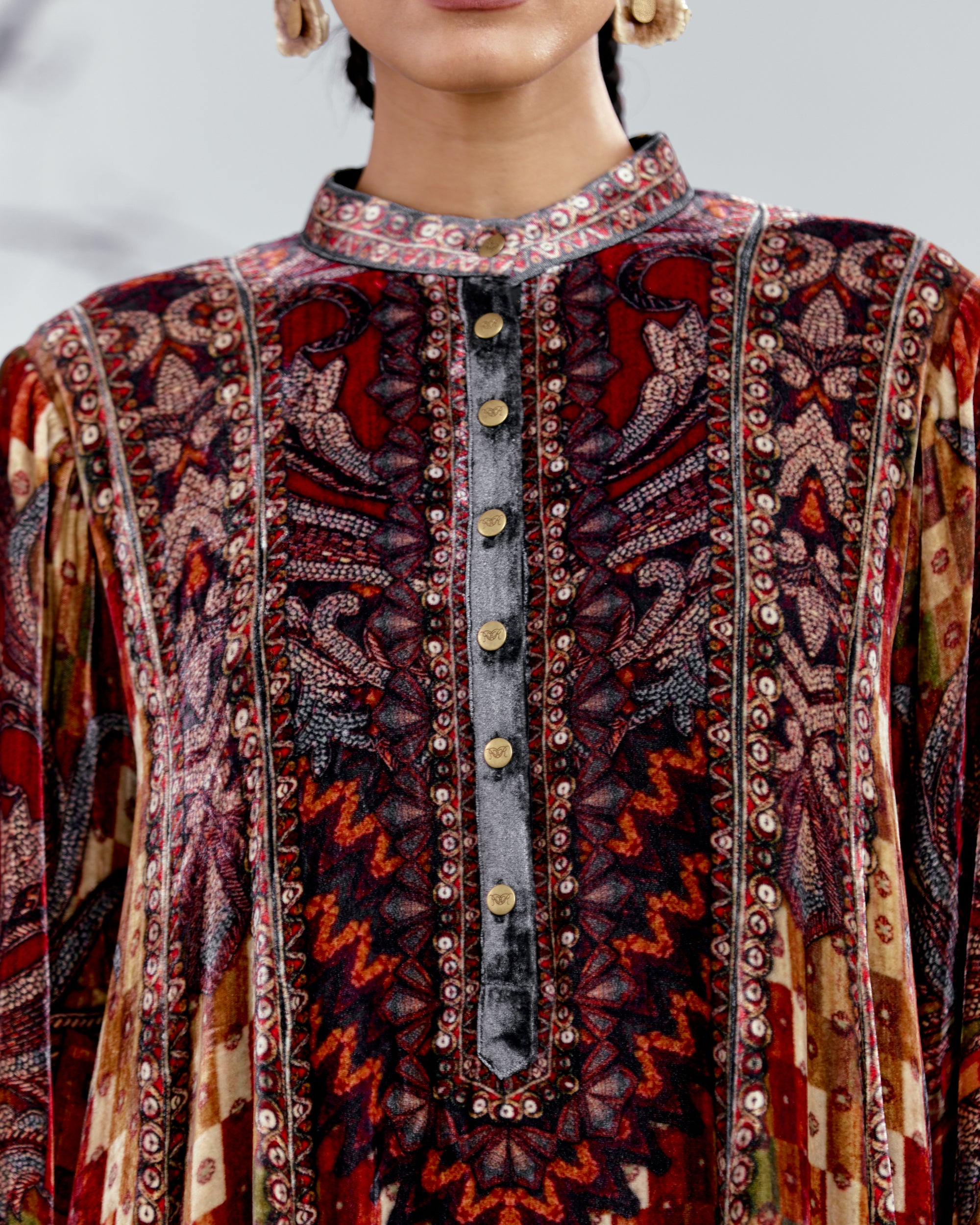 The comfortable 'A' line Anarkali panelled dress/tunic has a mandarin collar with a button front placket and full length sleeves.
