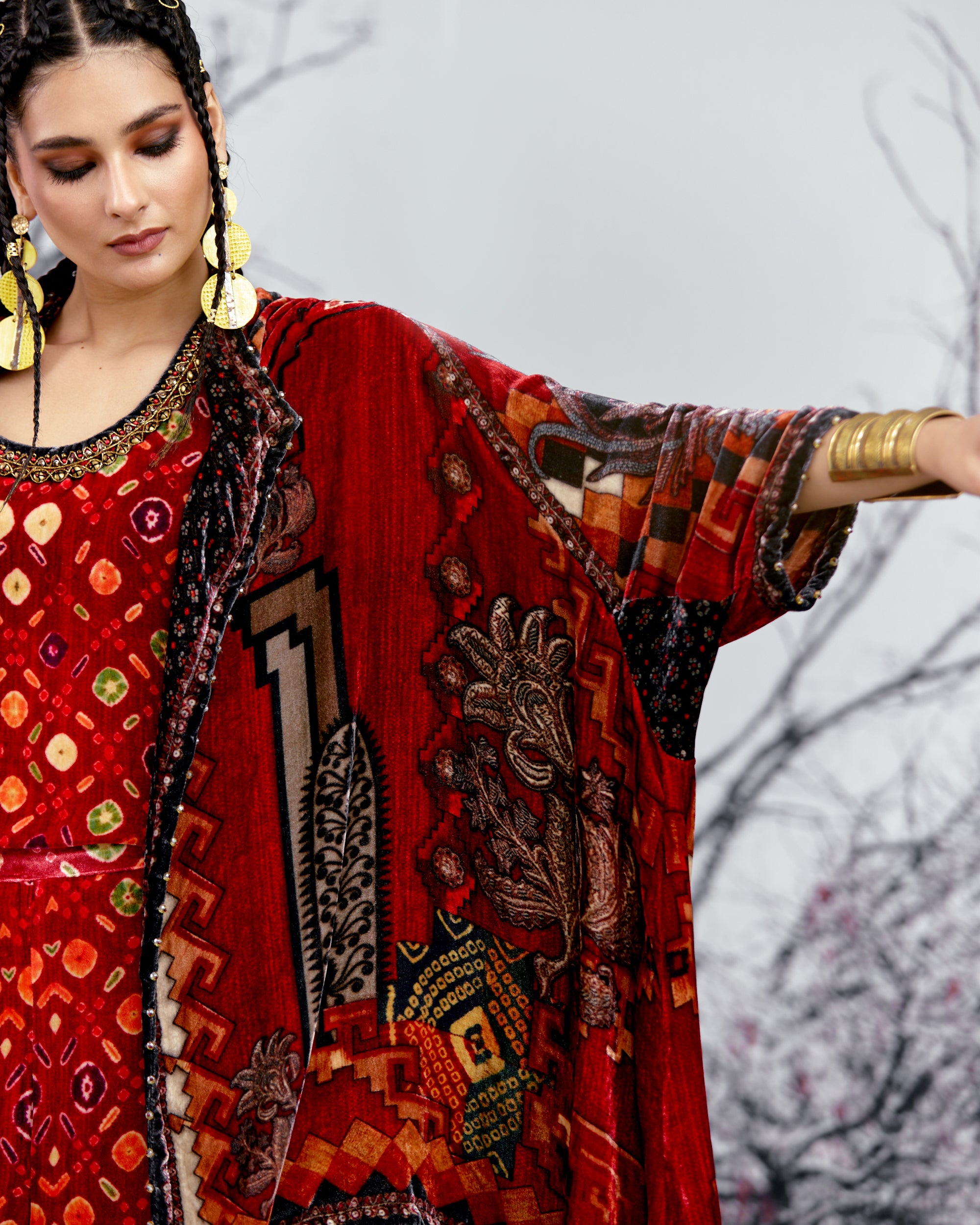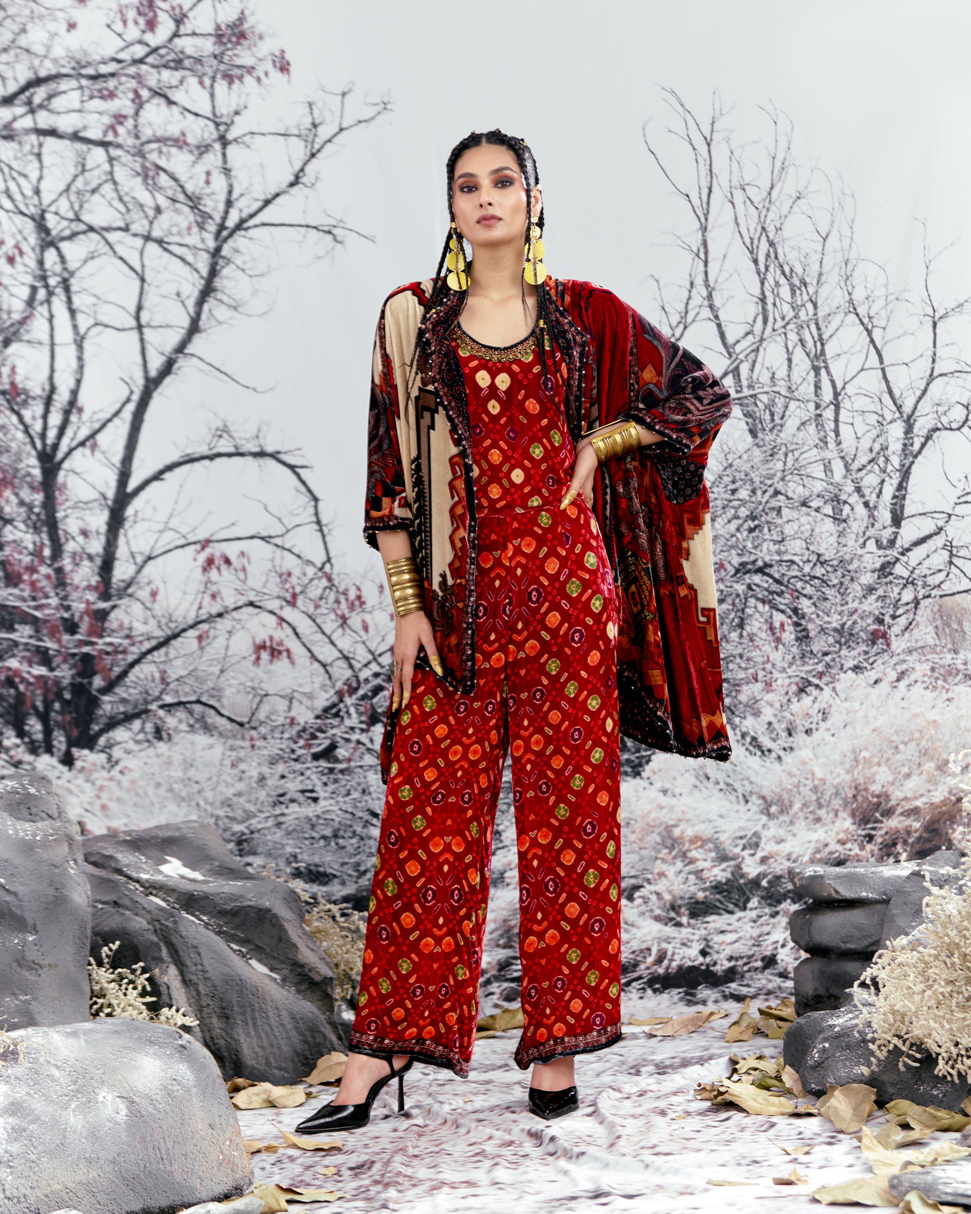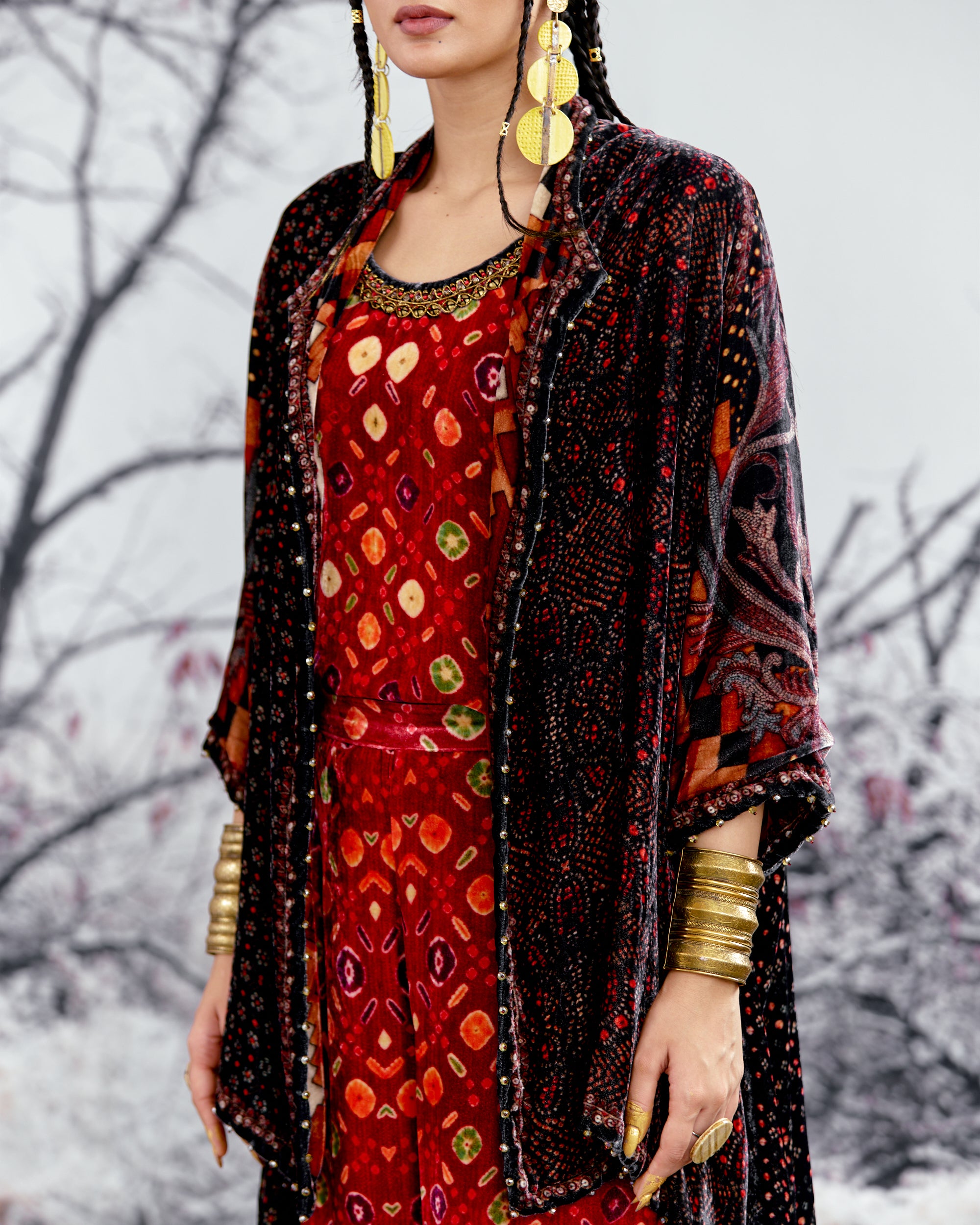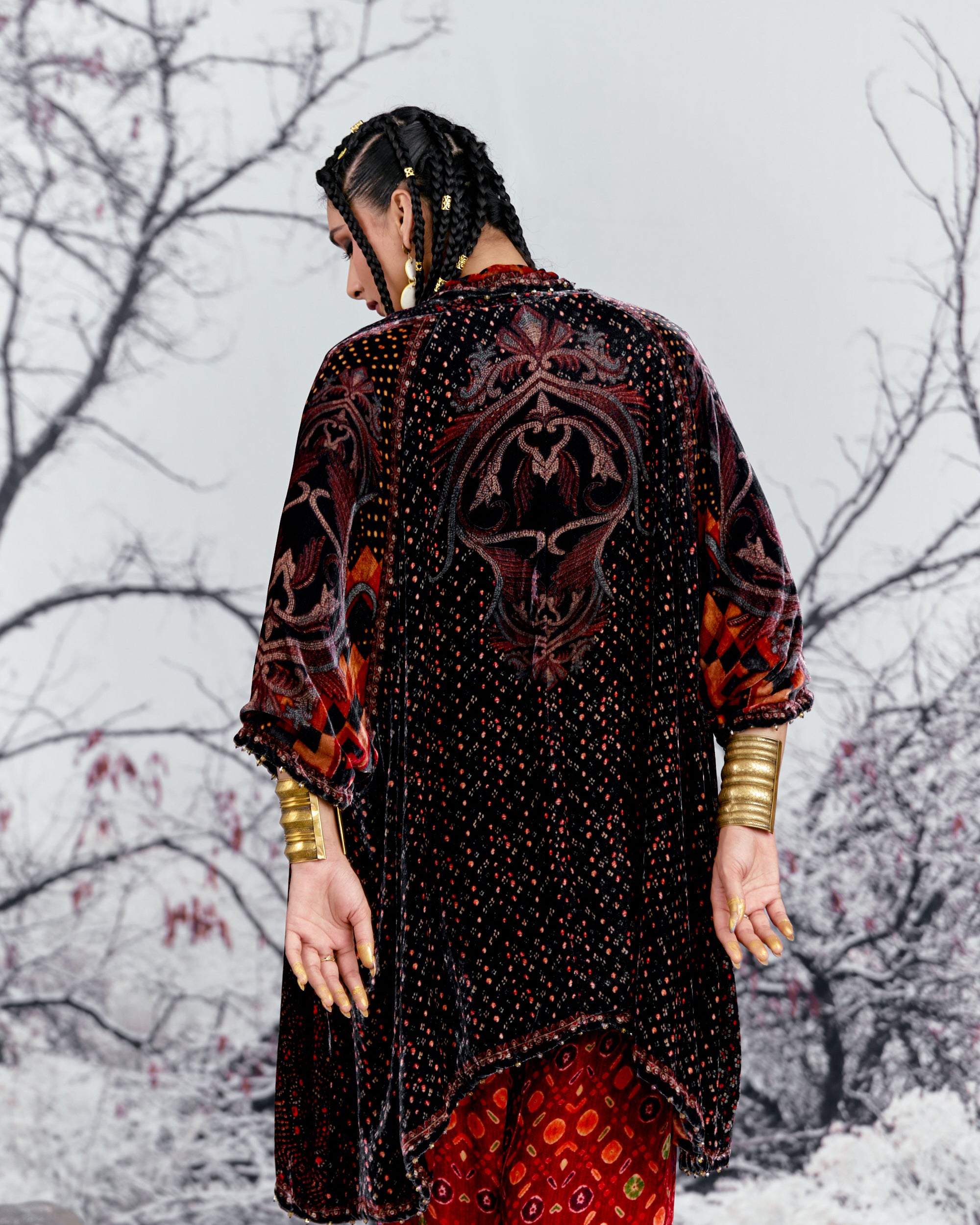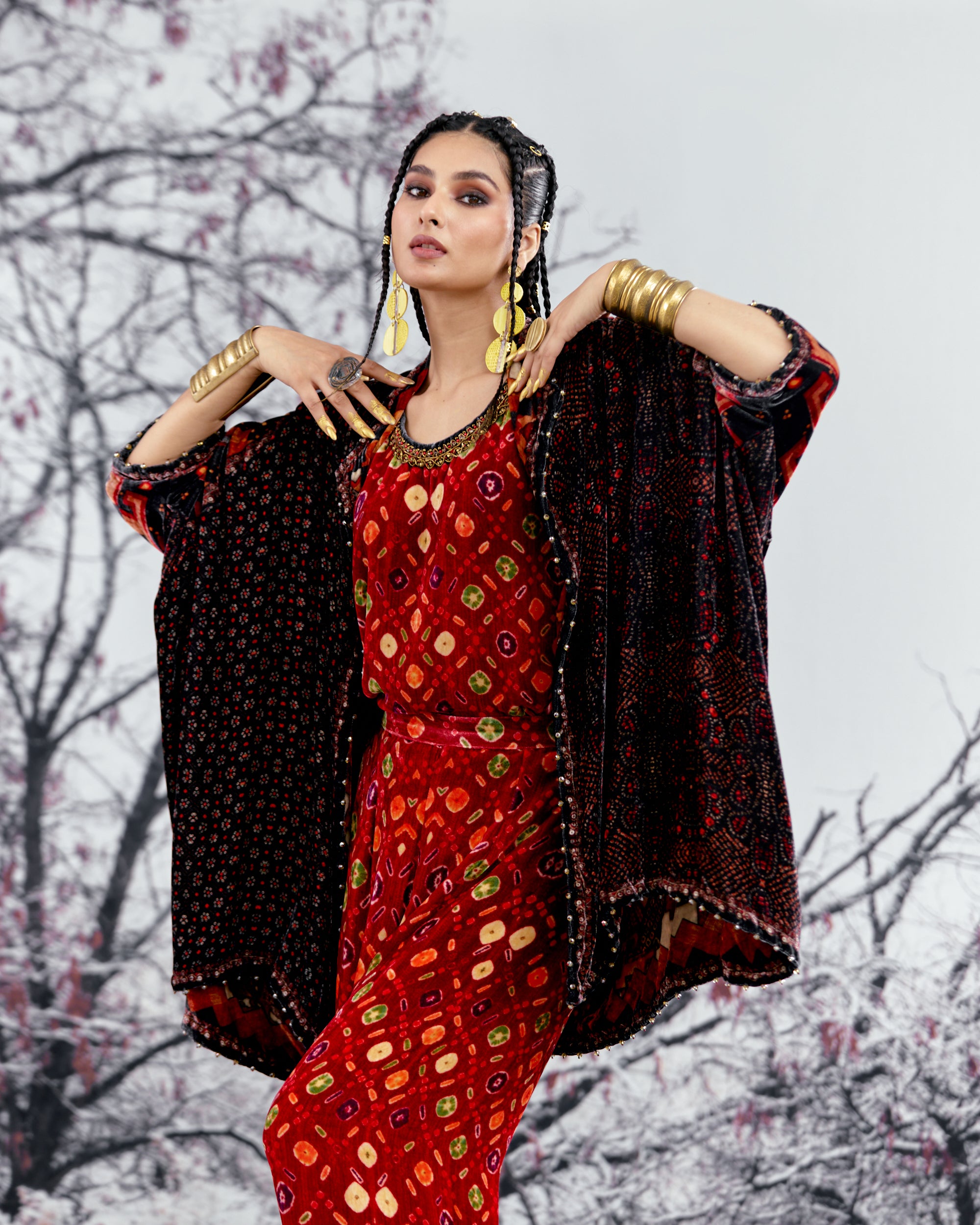 The Adhira draped coverup is a free size open jacket that is also reversible with a contrast coordinating print inside out.