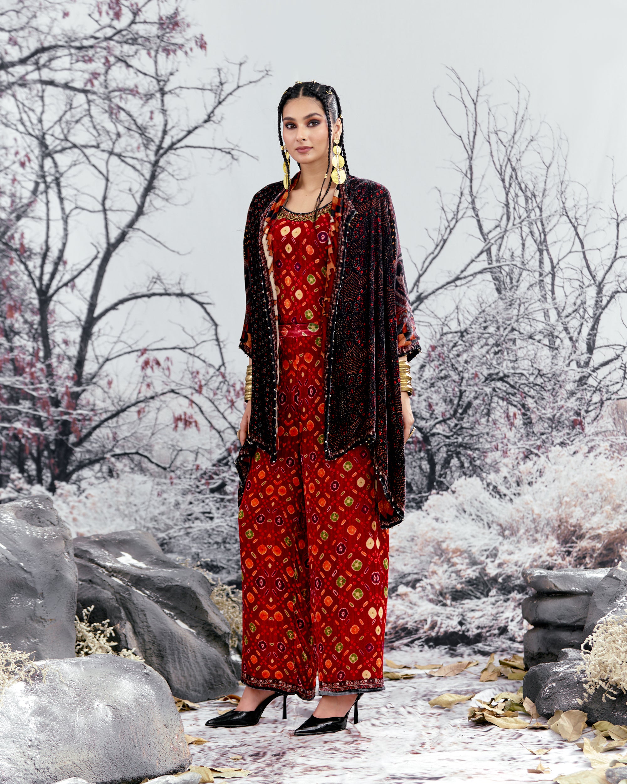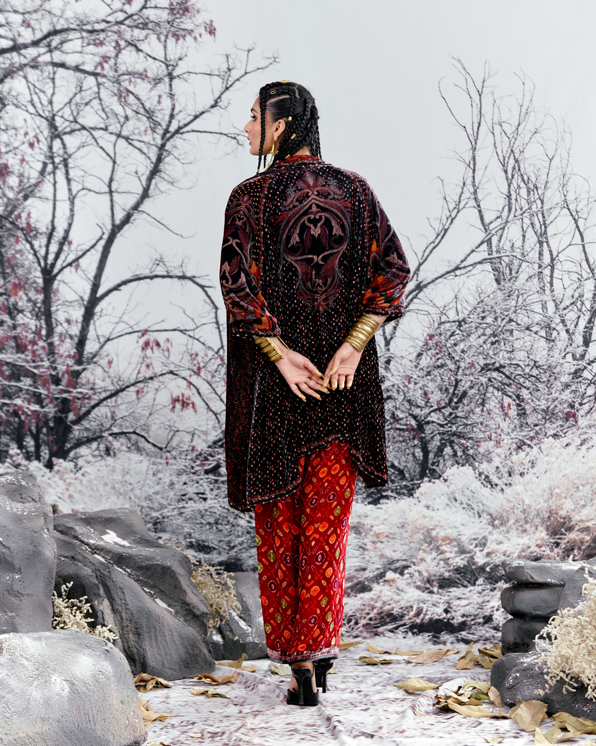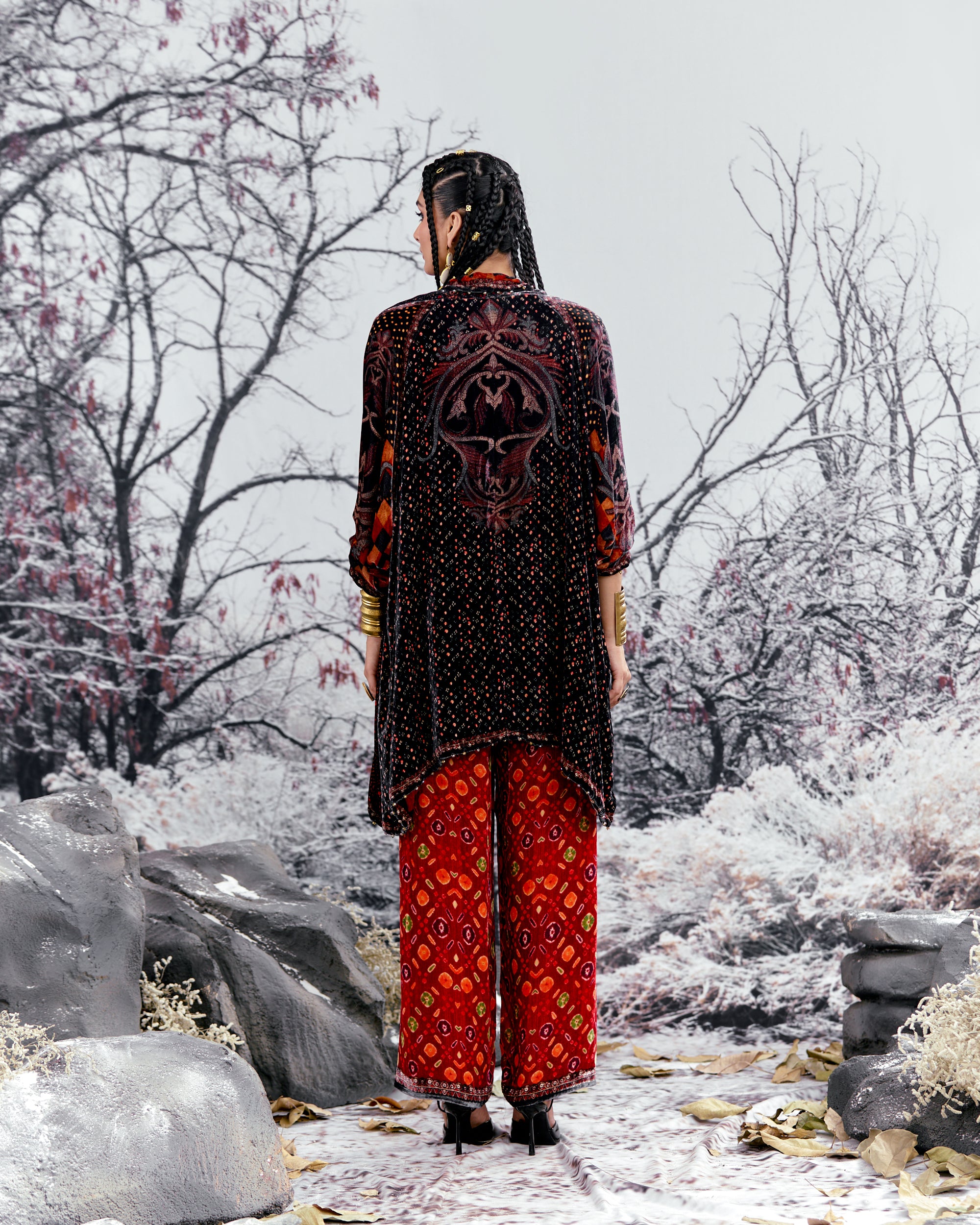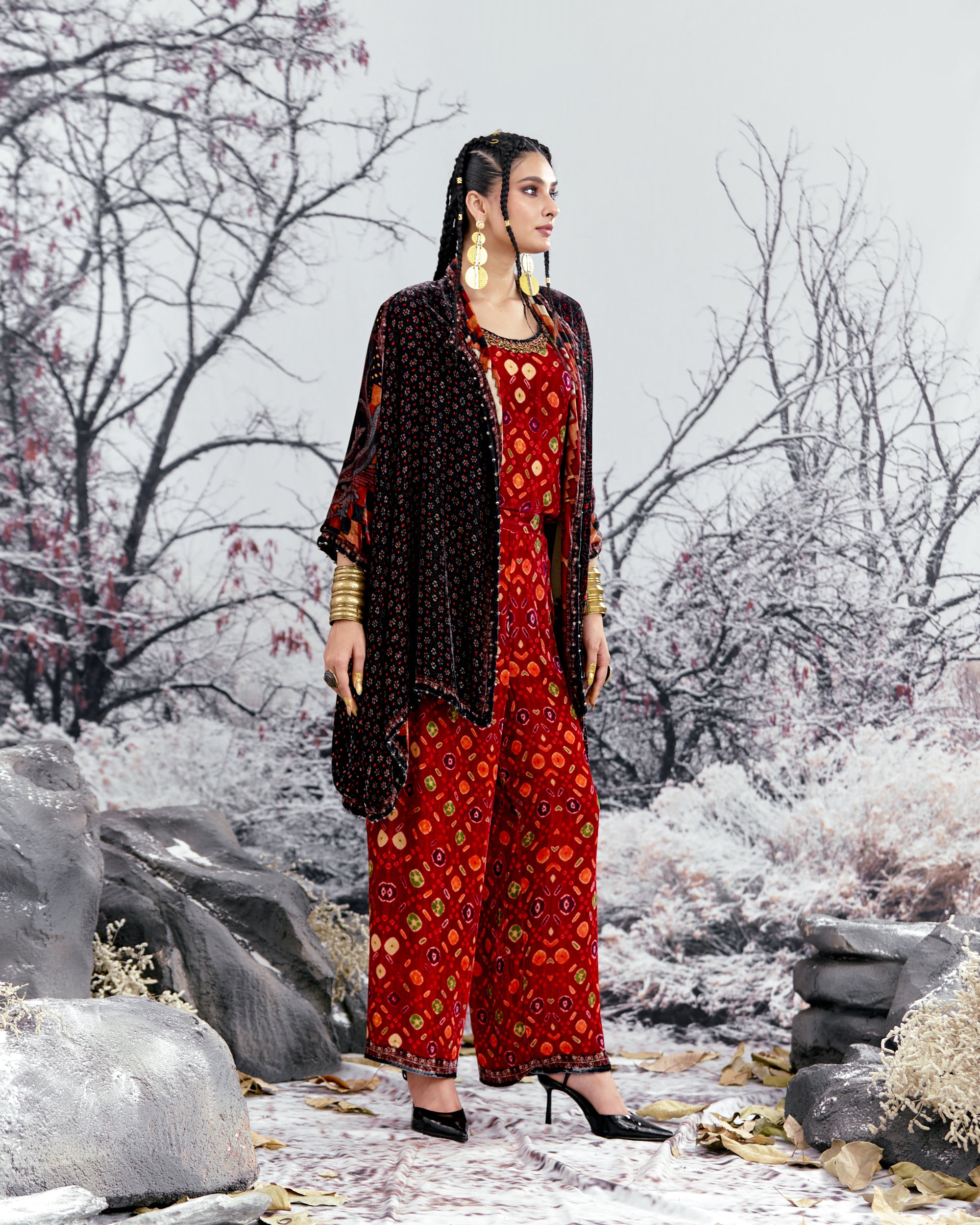 The Adhira draped coverup is a free size open jacket that is also reversible with a contrast coordinating print inside out.