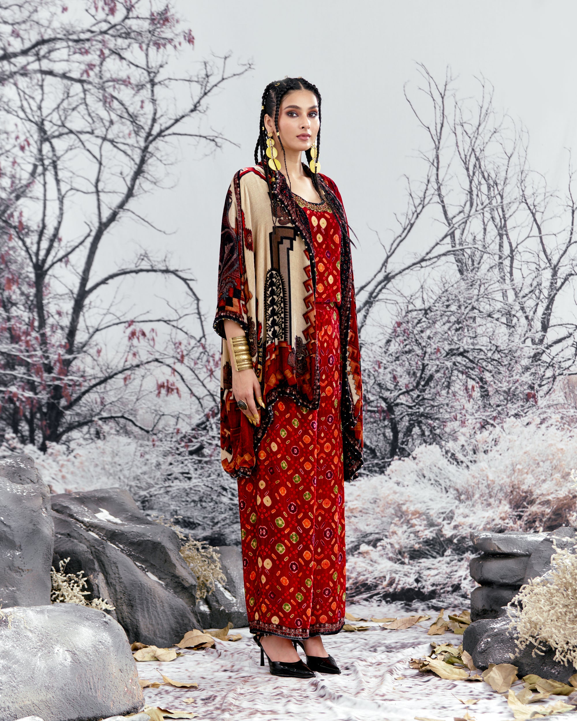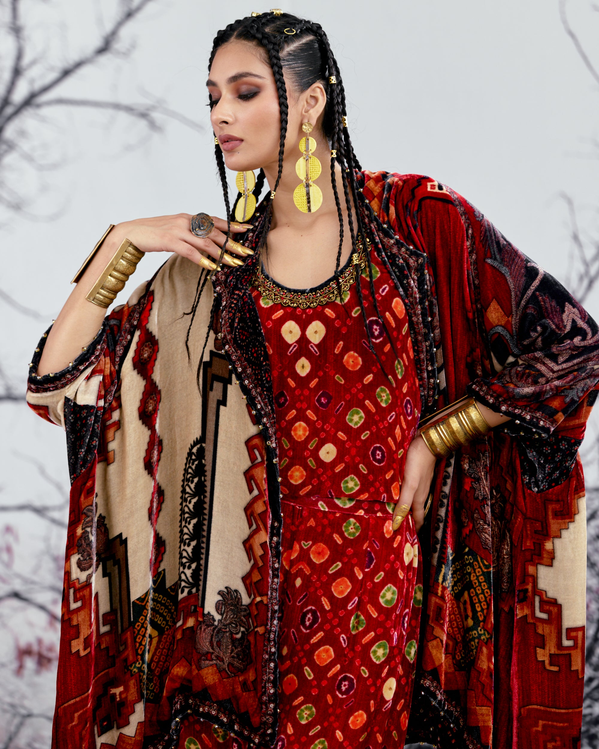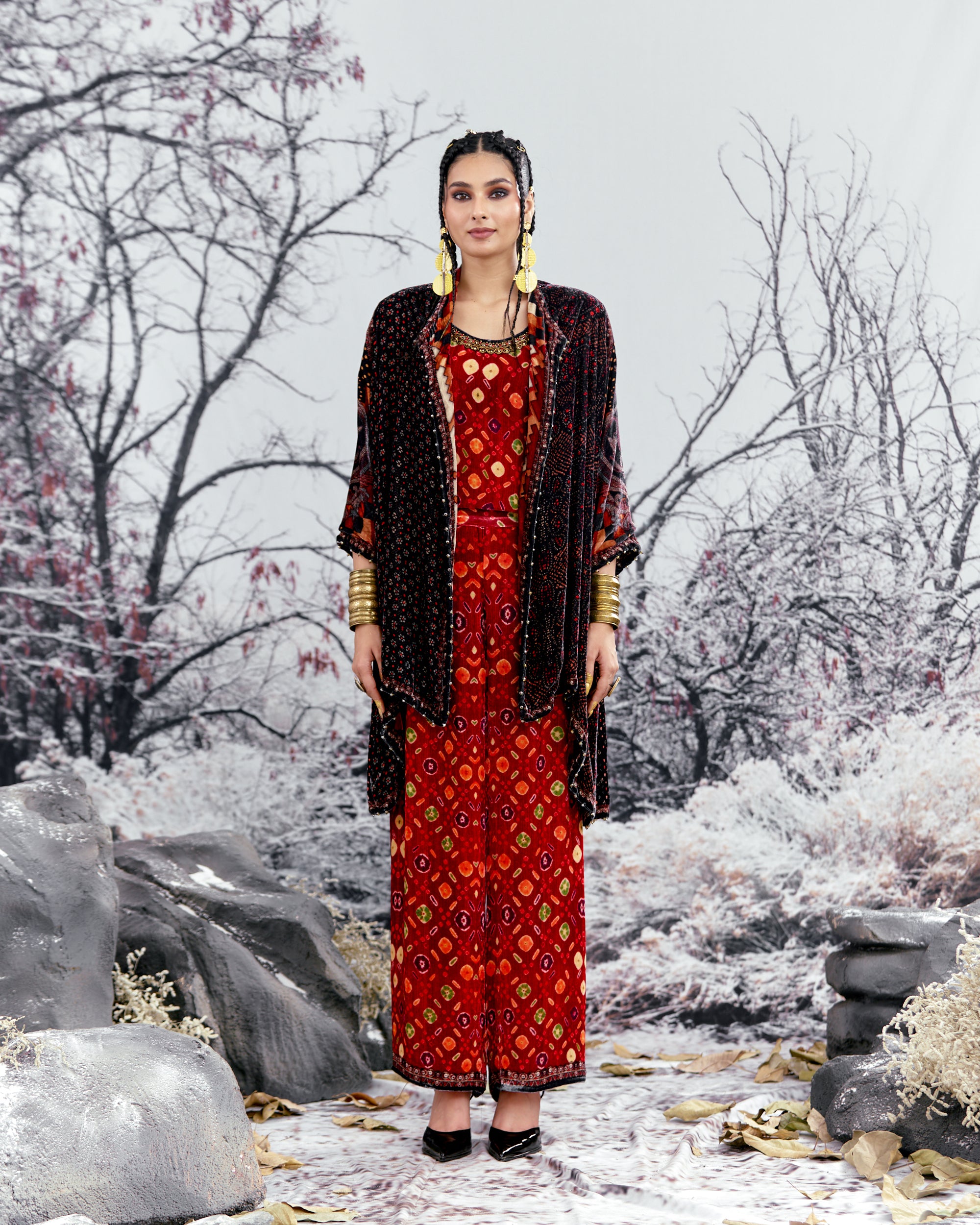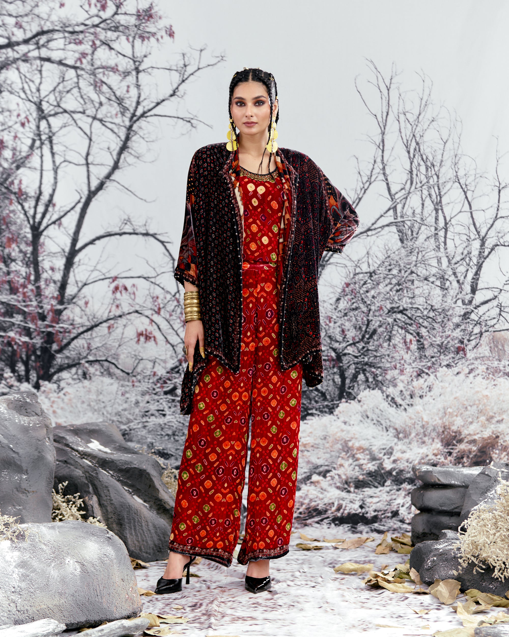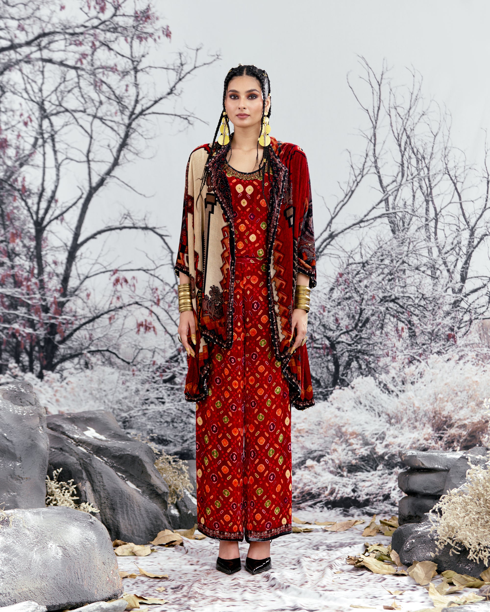 The Adhira draped coverup is a free size open jacket that is also reversible with a contrast coordinating print inside out.