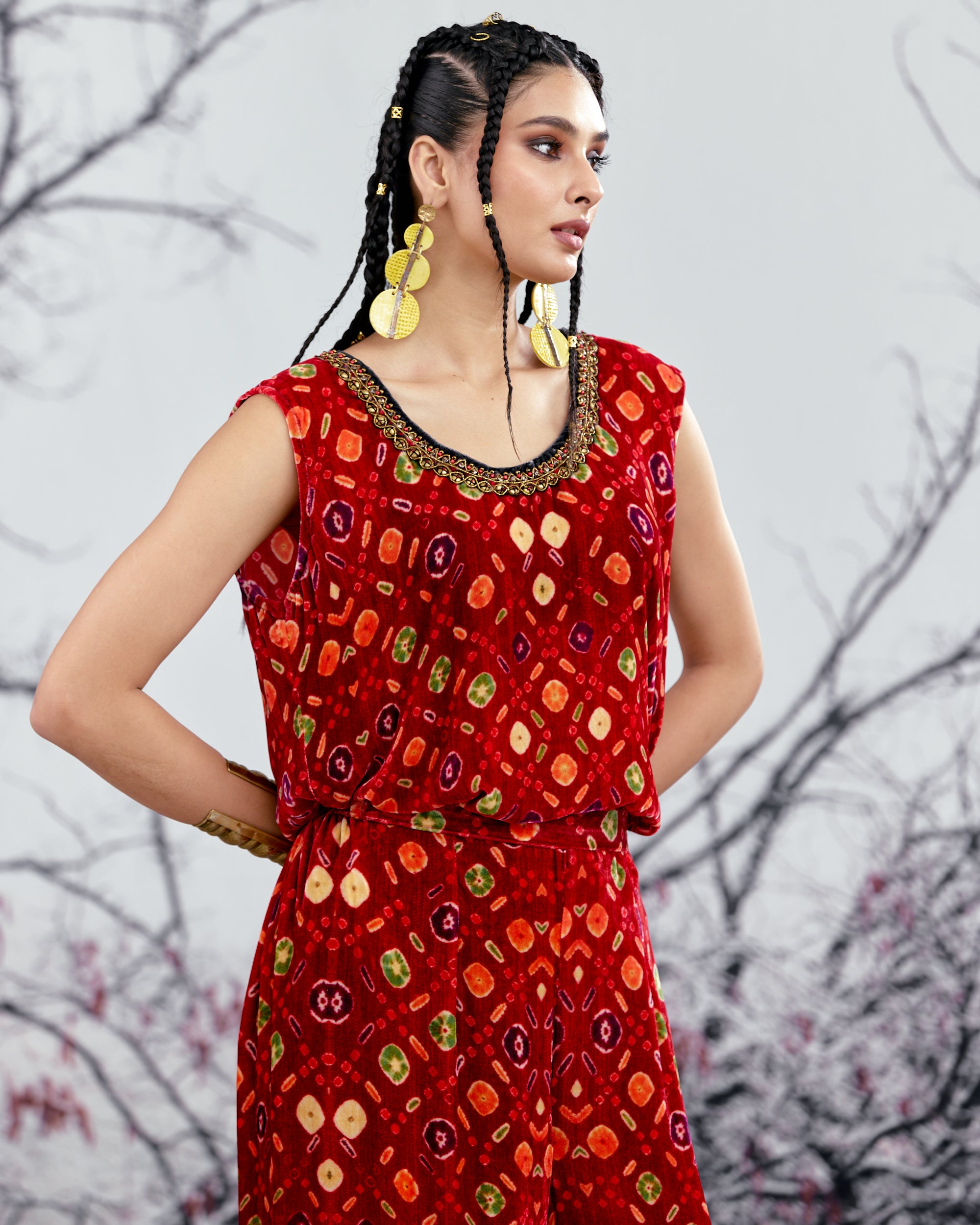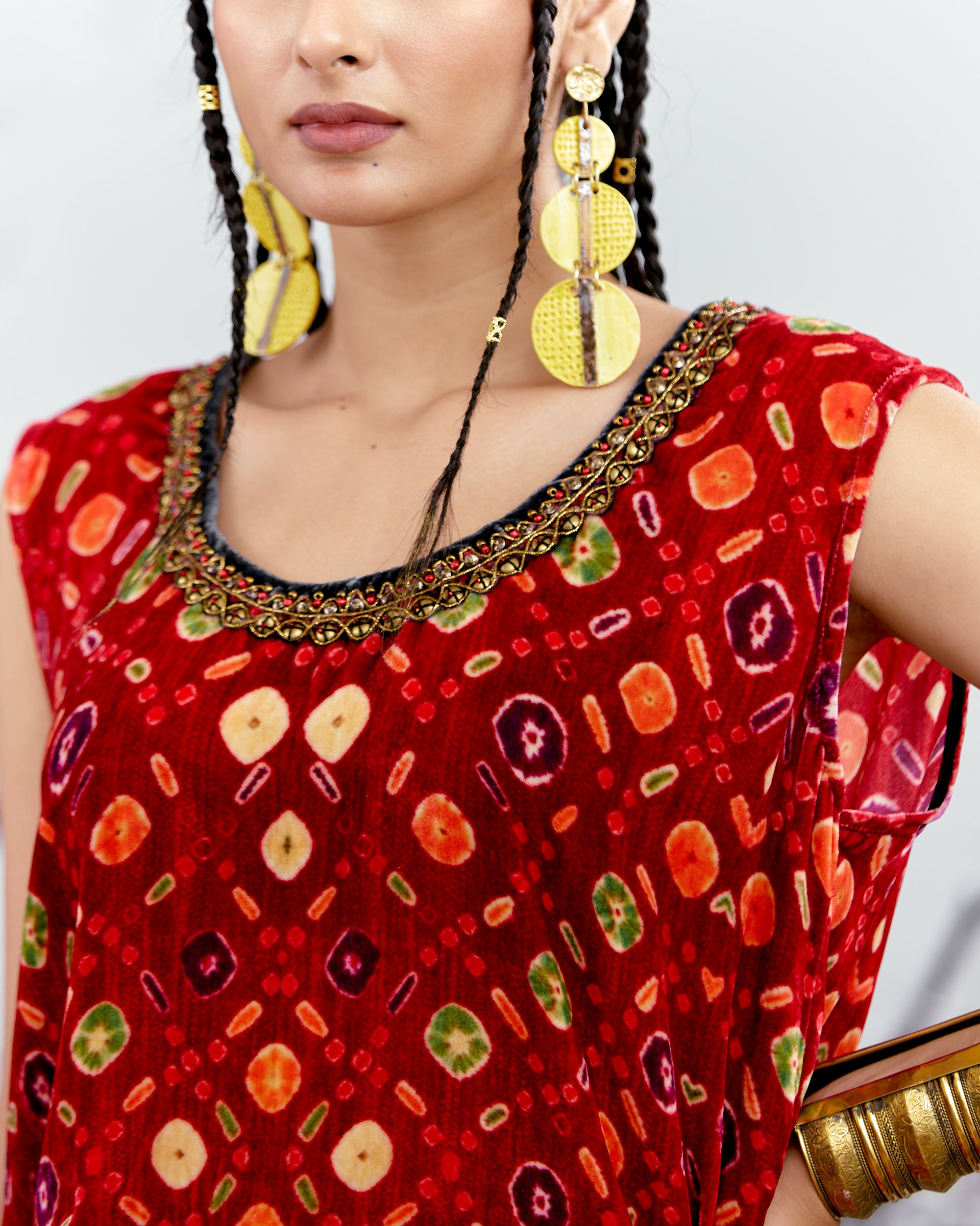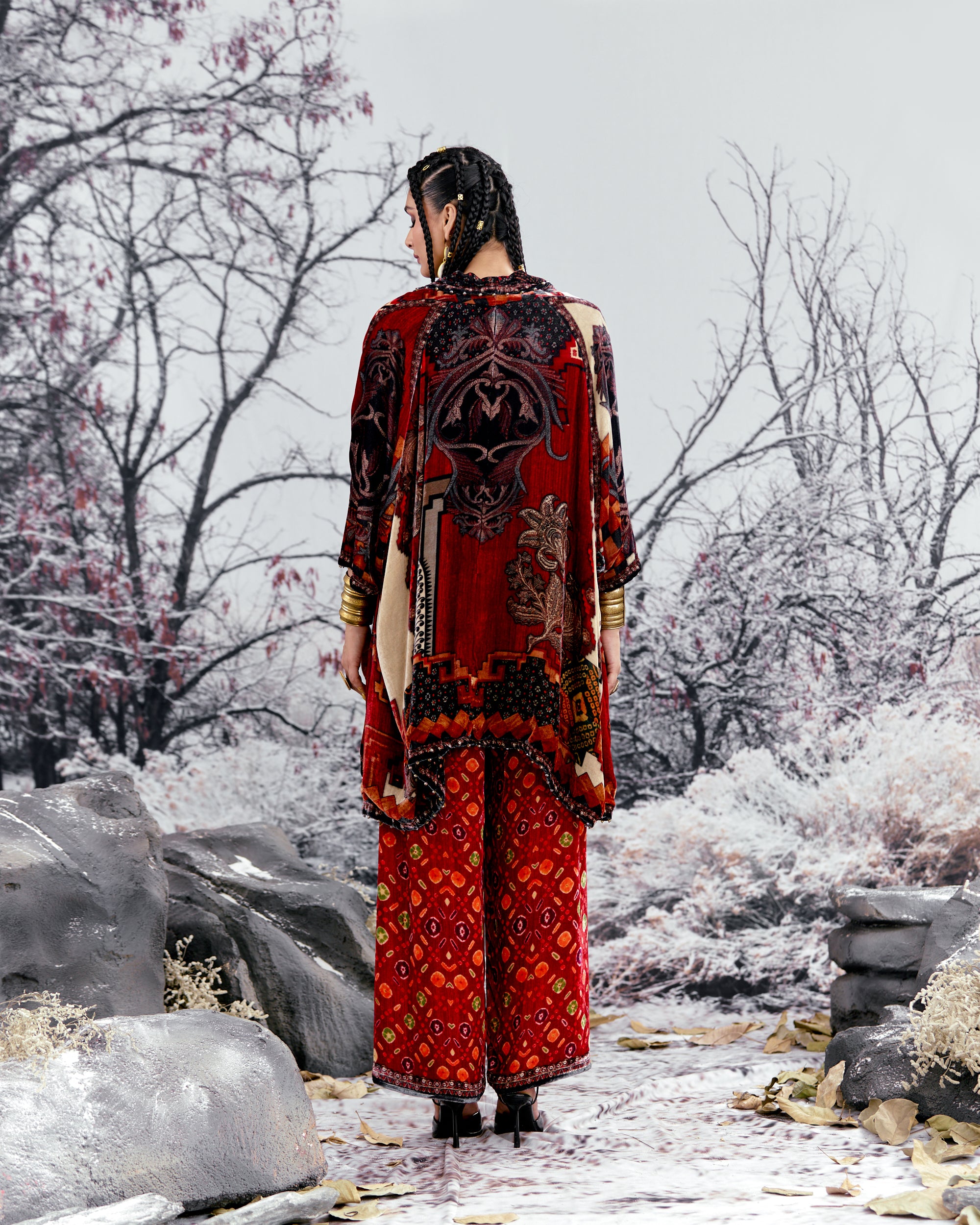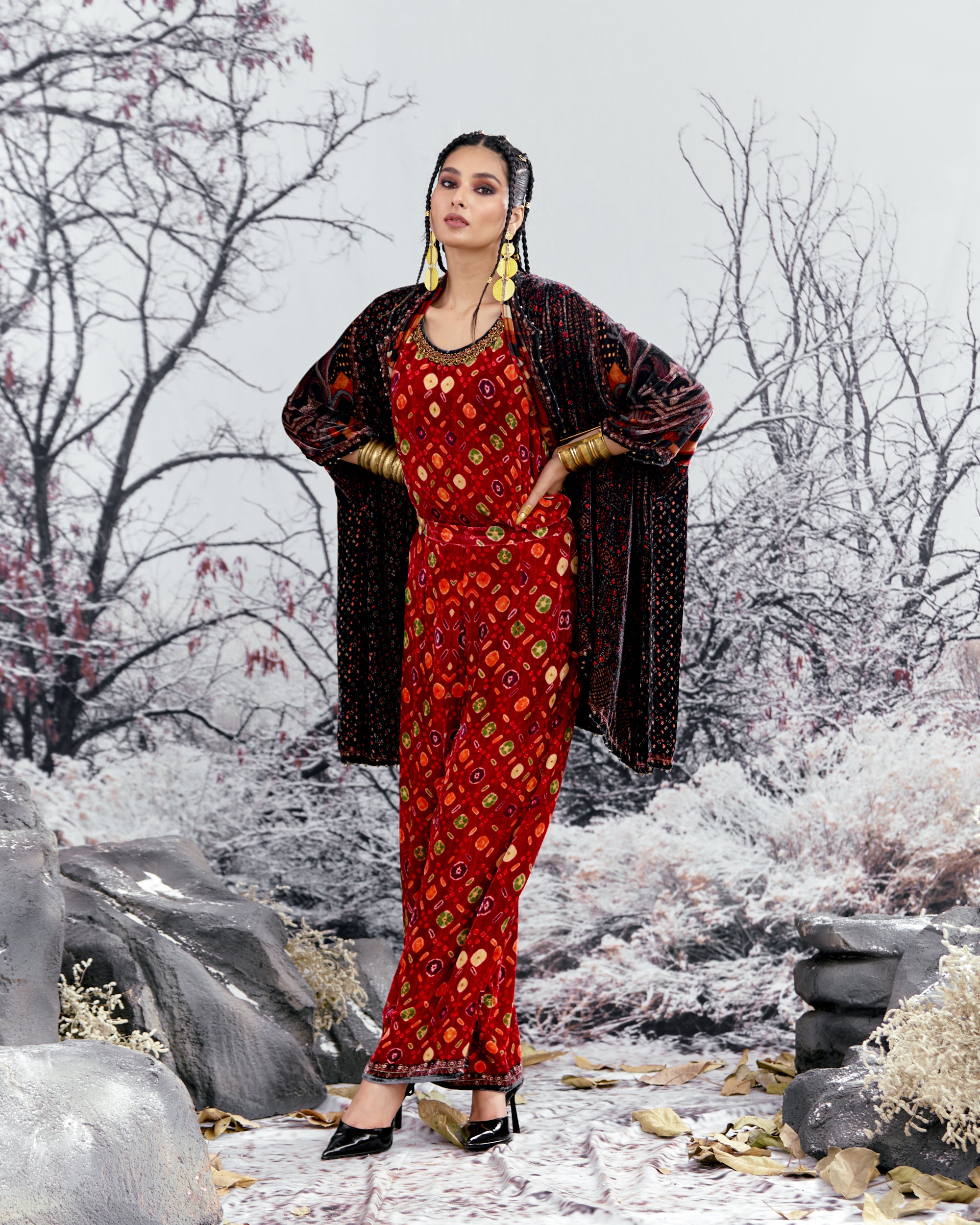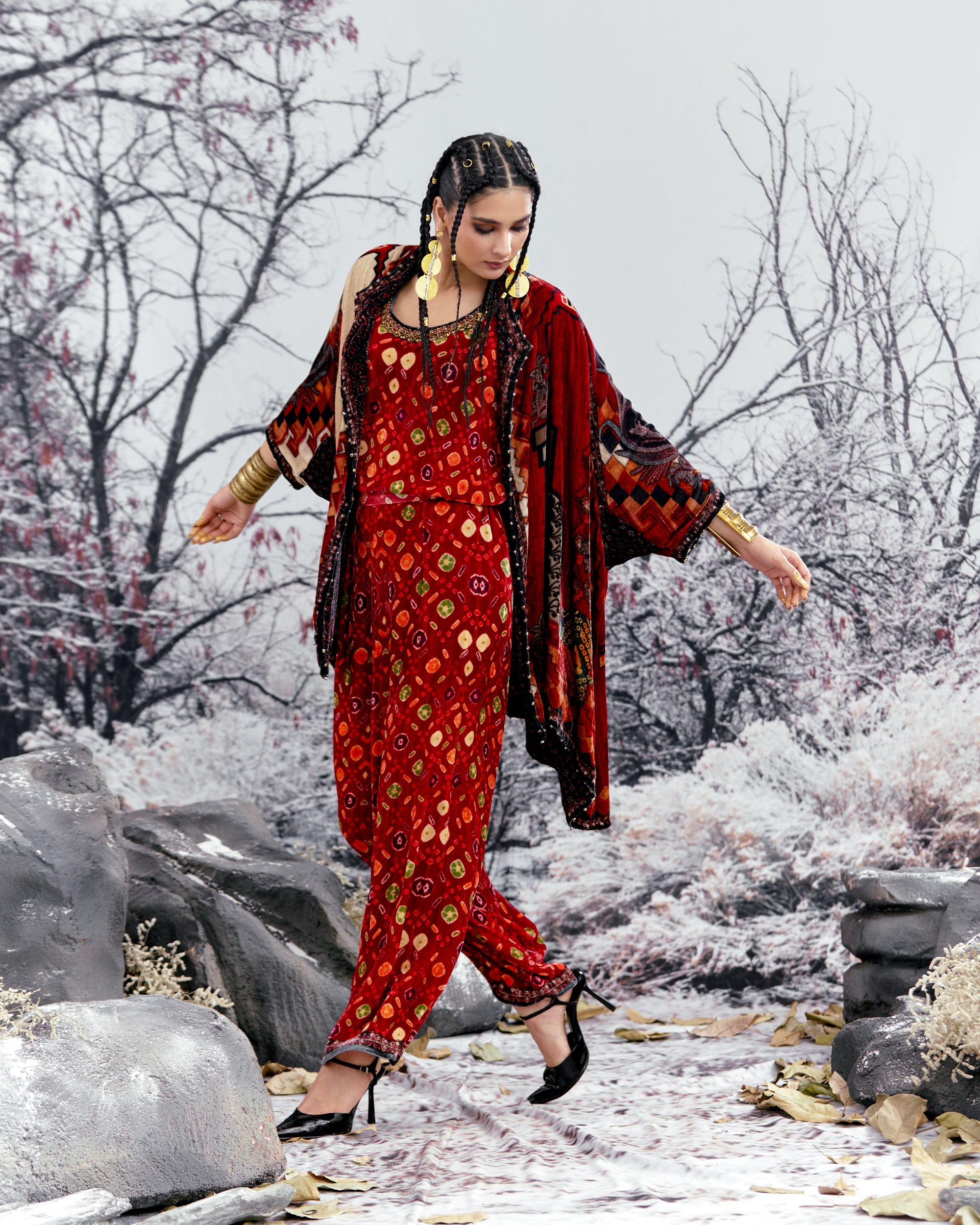The Adhira draped coverup is a free size open jacket that is also reversible with a contrast coordinating print inside out.