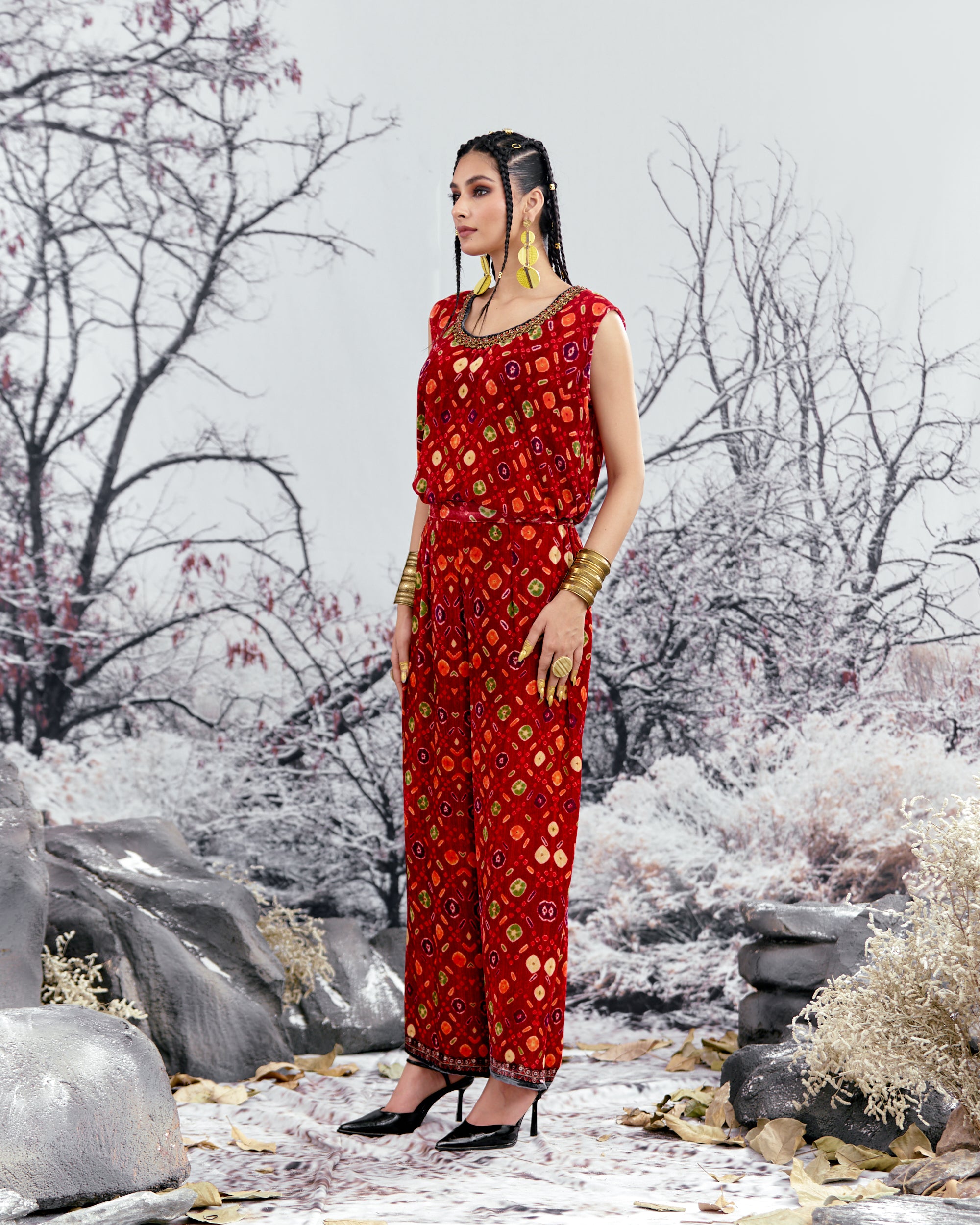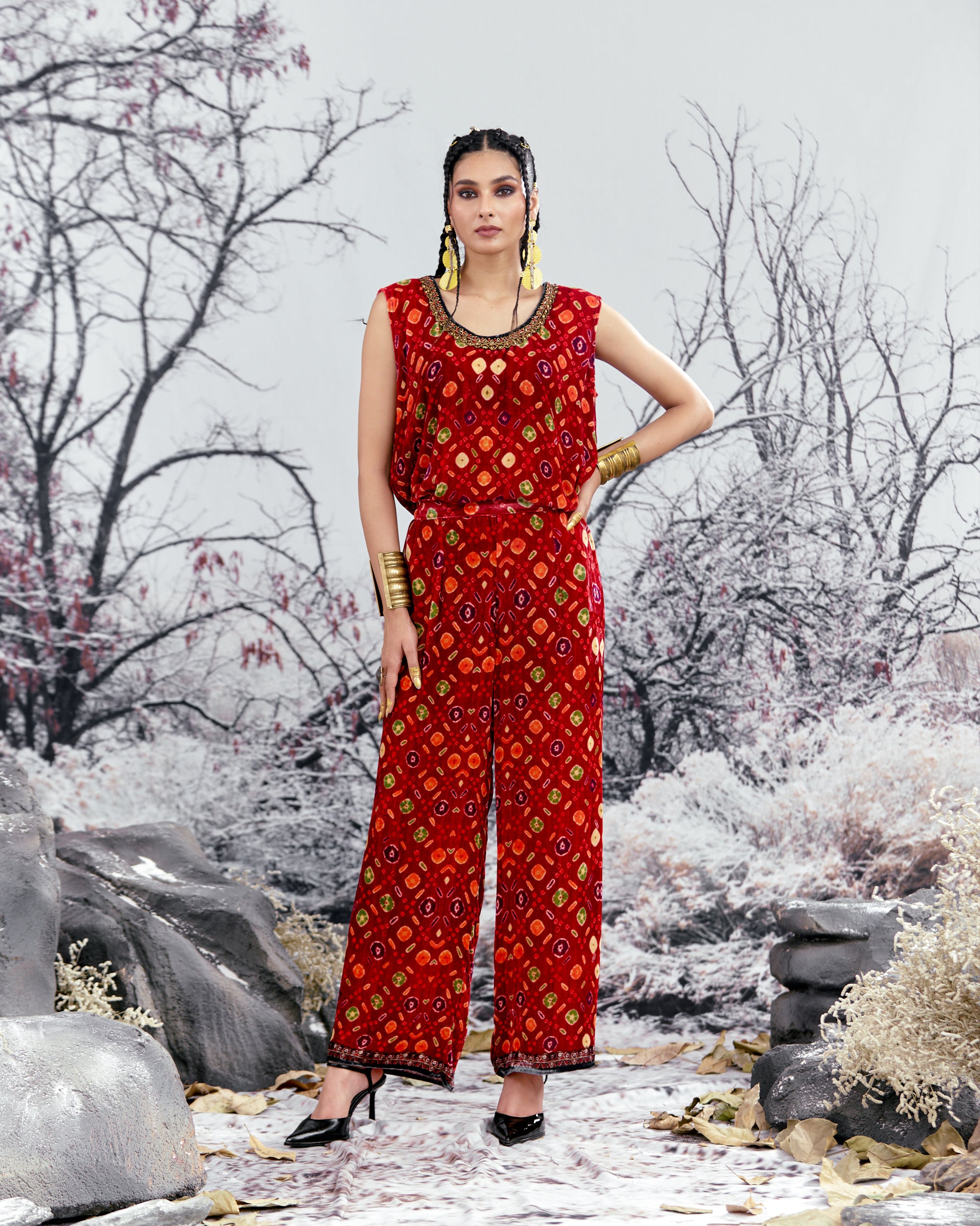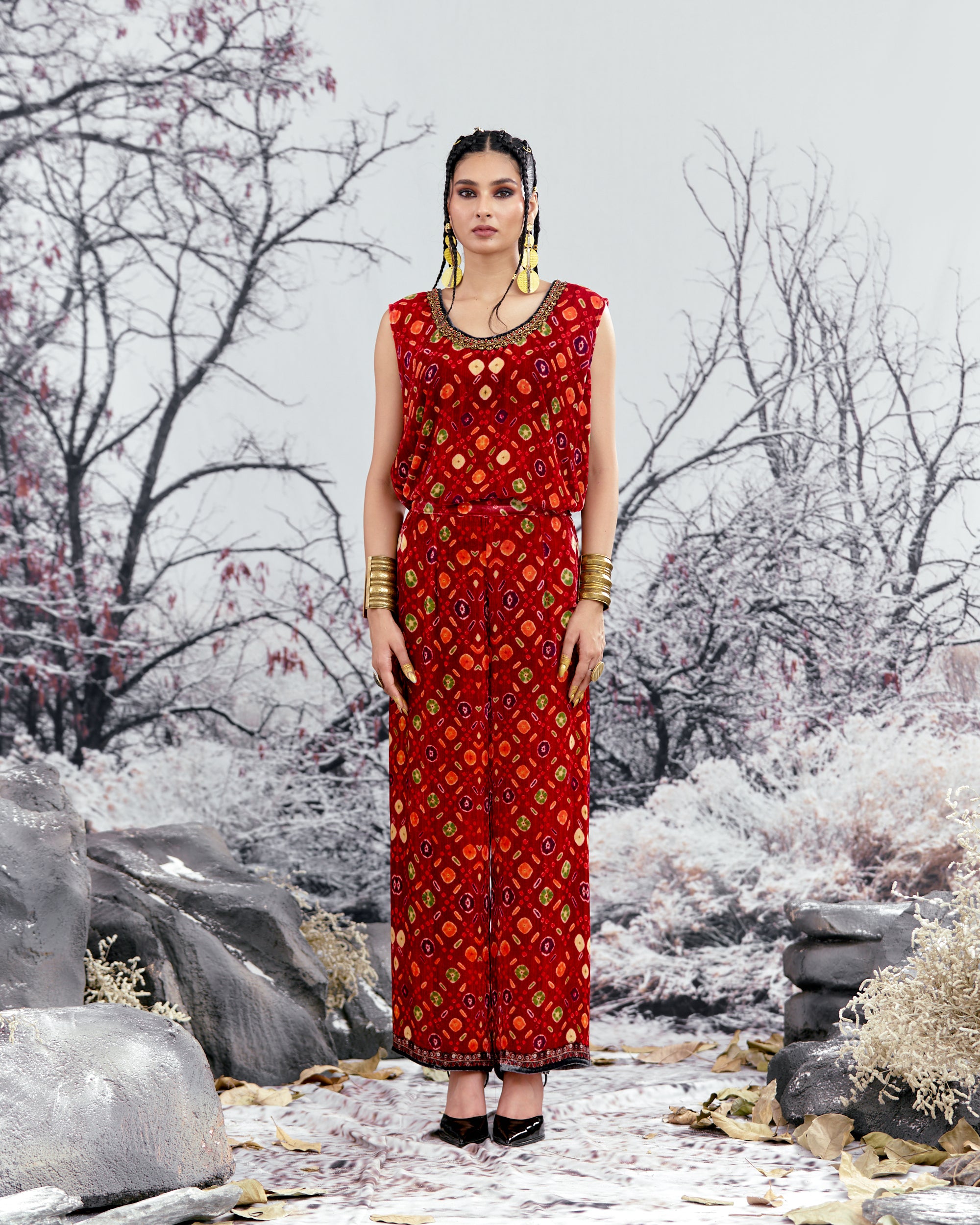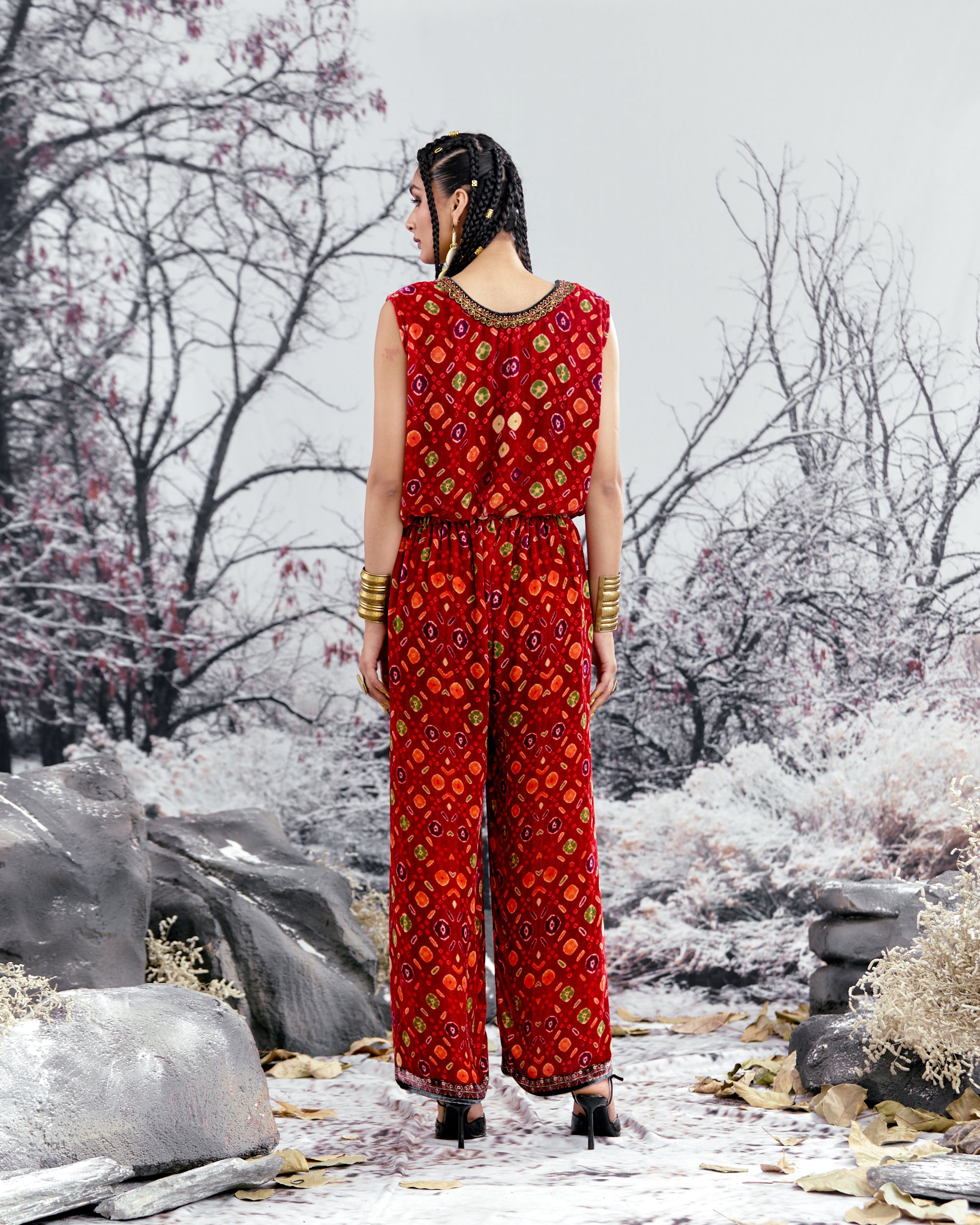 The coverup also comes with a matching pair of printed palazzo pants with a coordinating border at the bottom hem which completes the look for this urban ensemble.