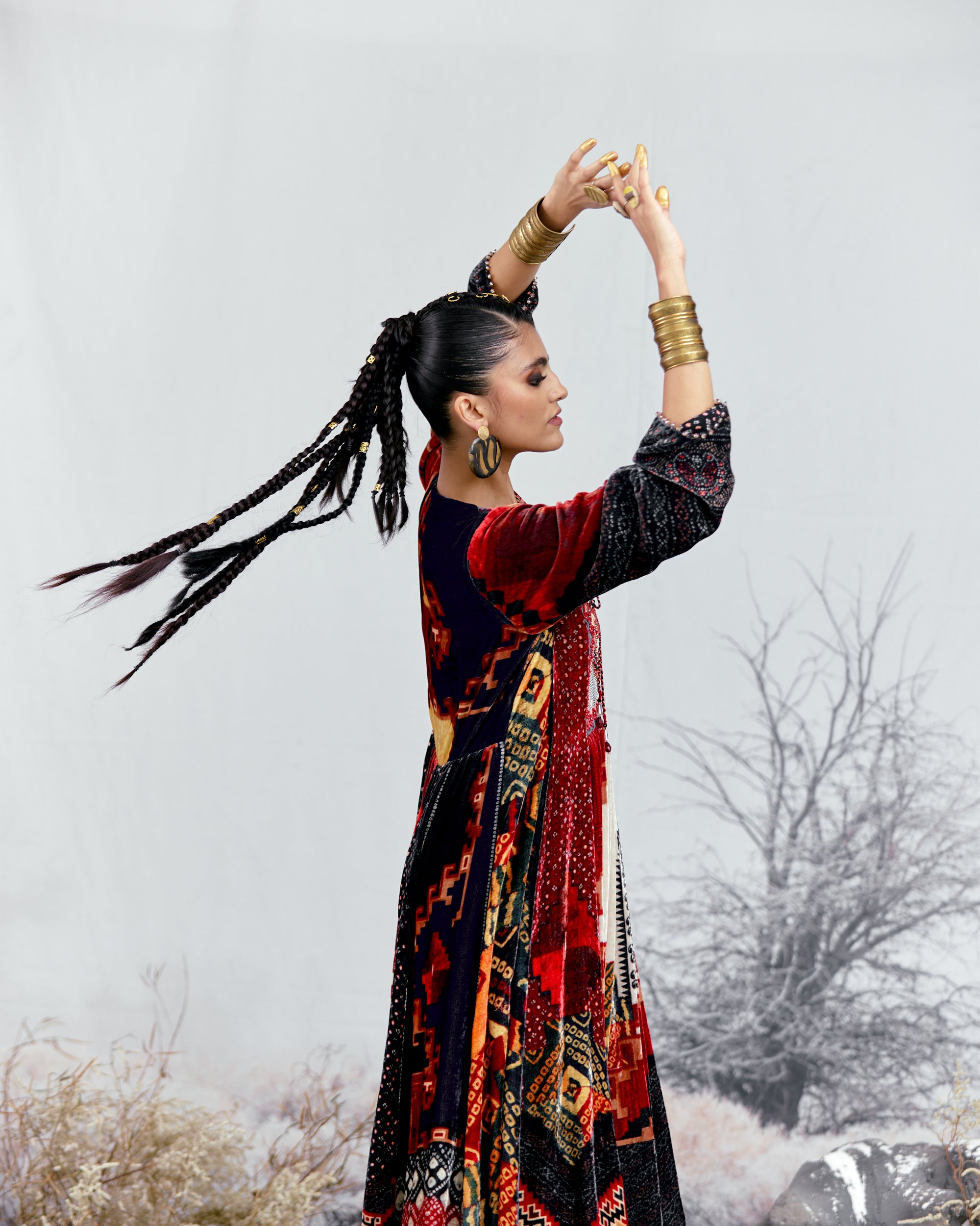 A printed silk dress with a yoke front and panels for a flare. The dress has full length sleeves.