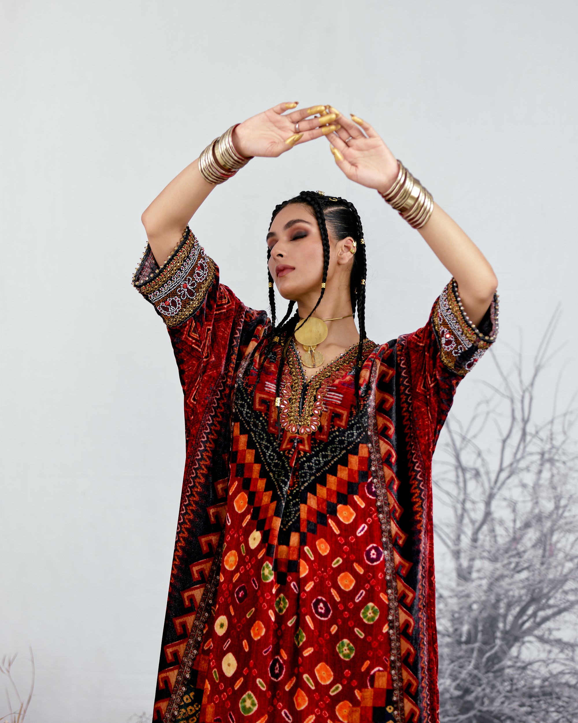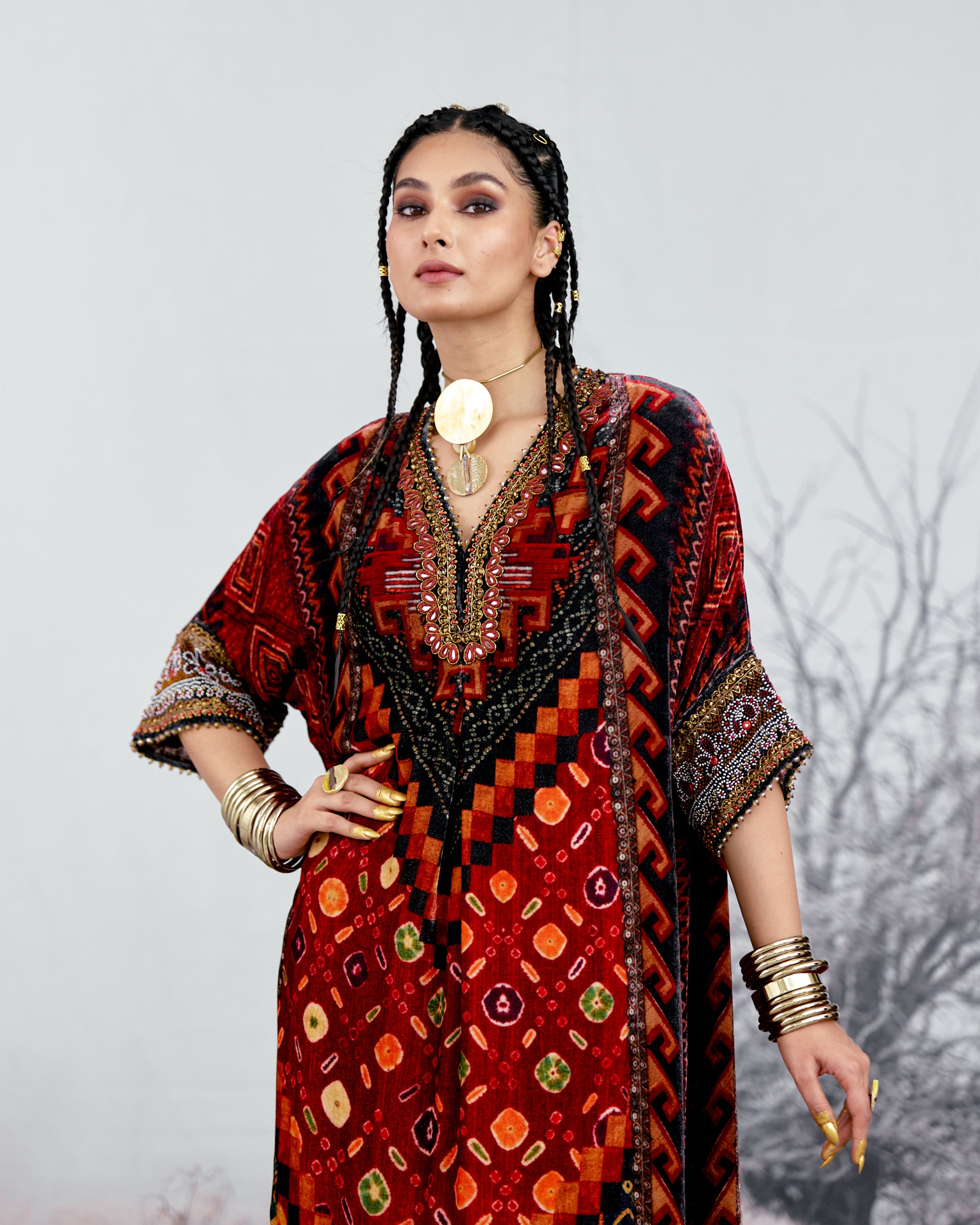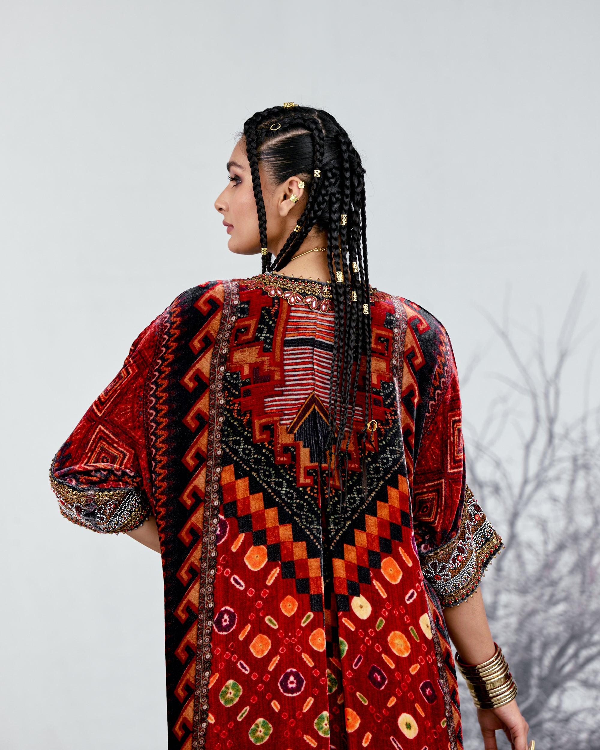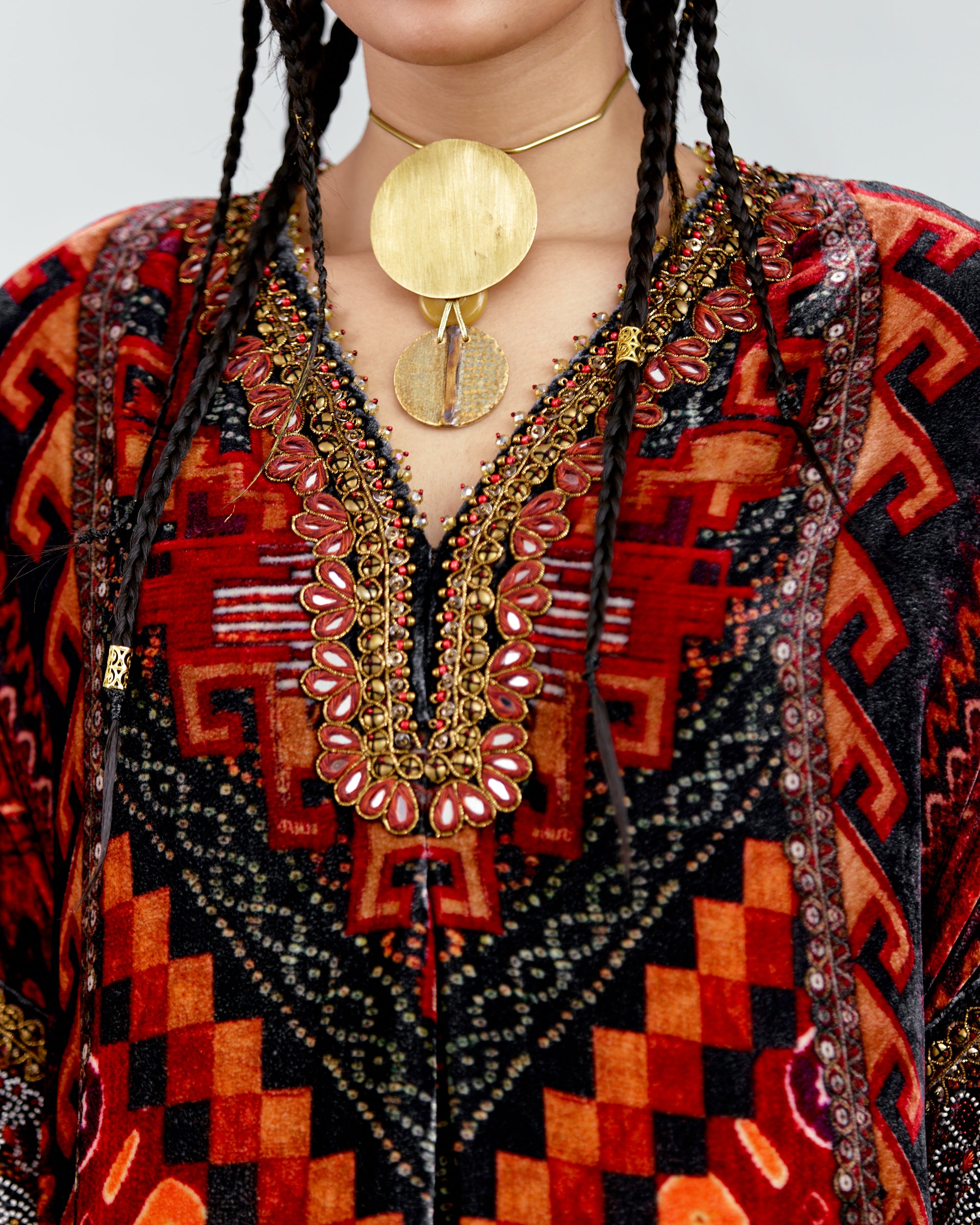 The kaftan tunic is a comfortable boxy shape that has drop shoulders and Cuffs at the sleeve hem.