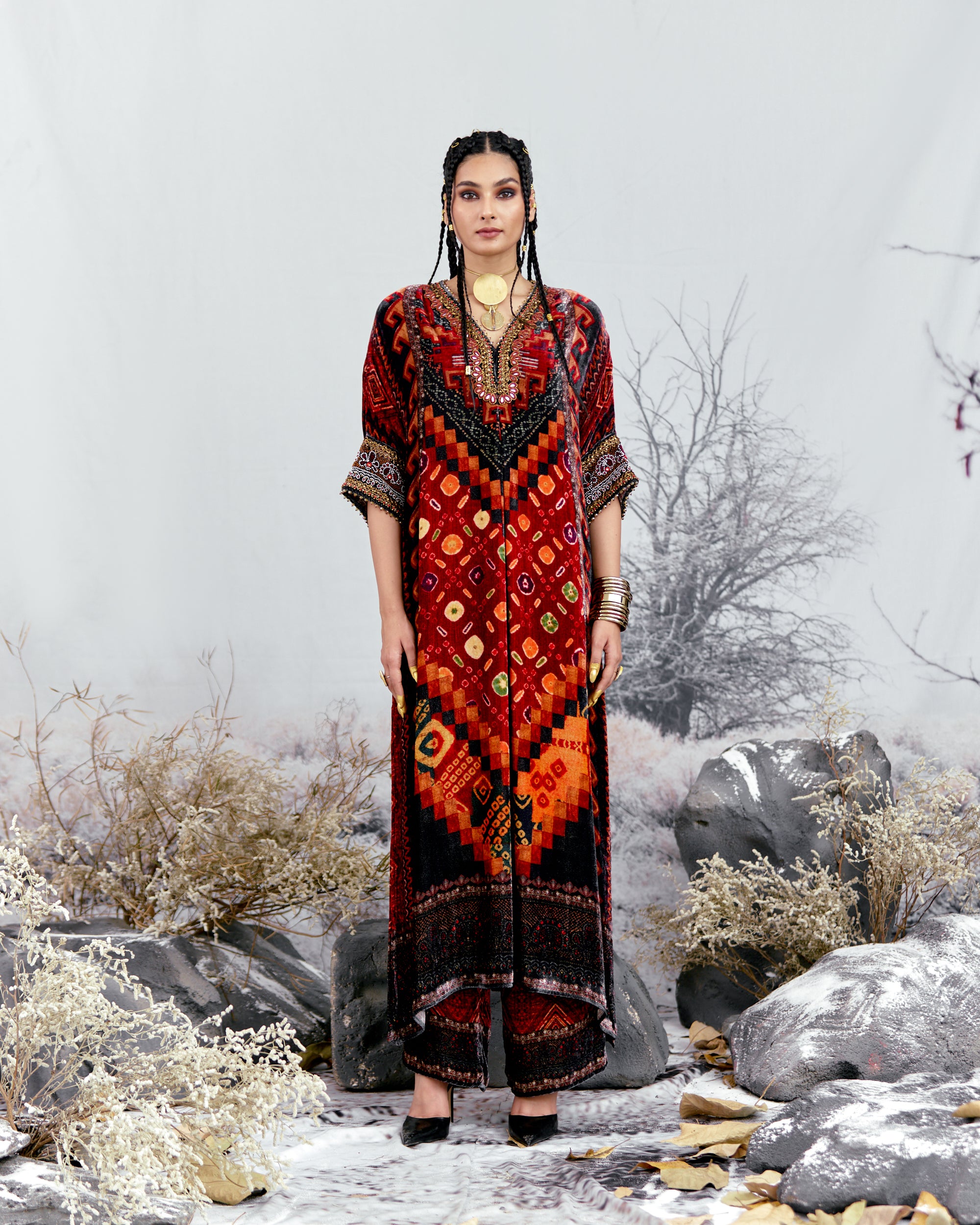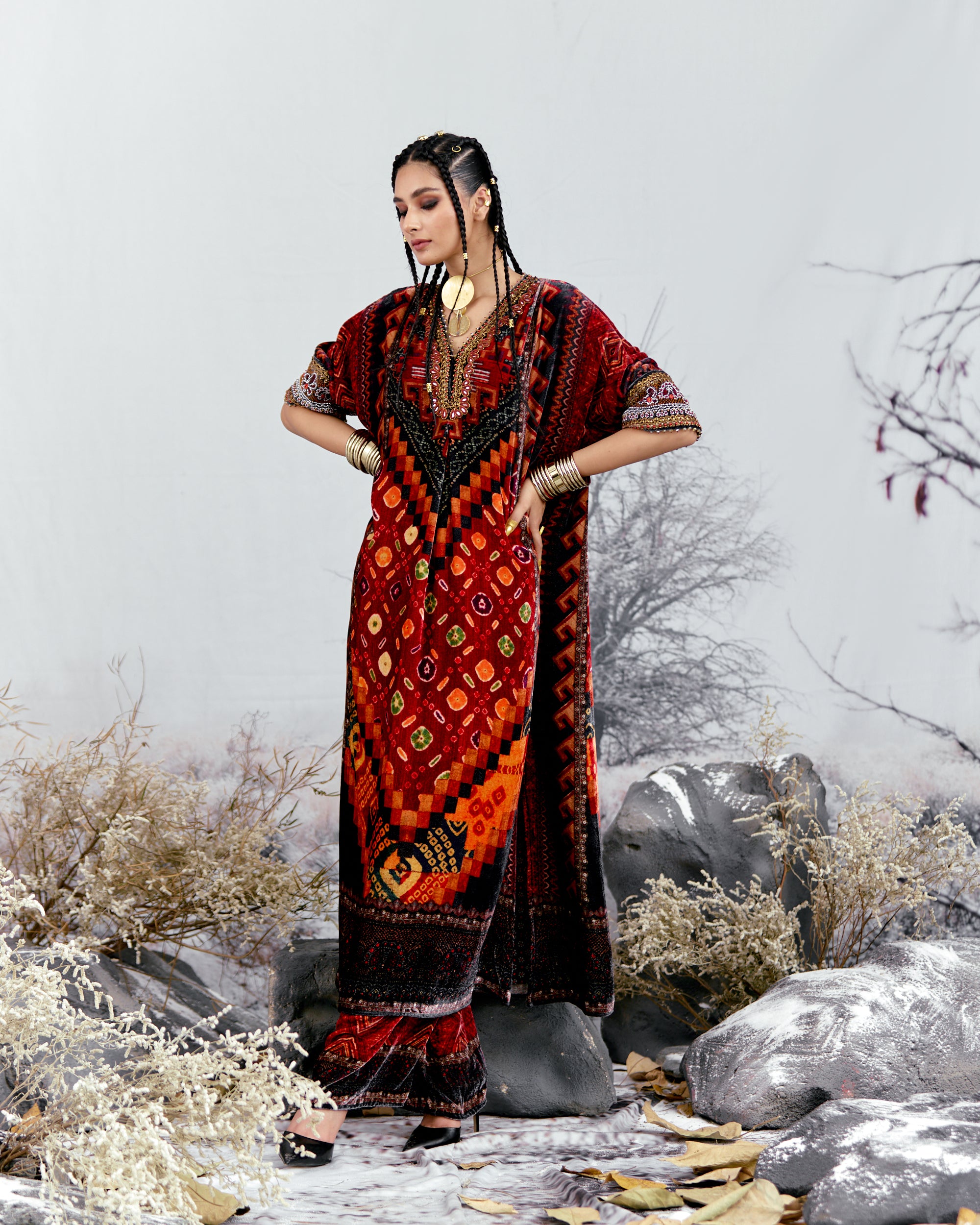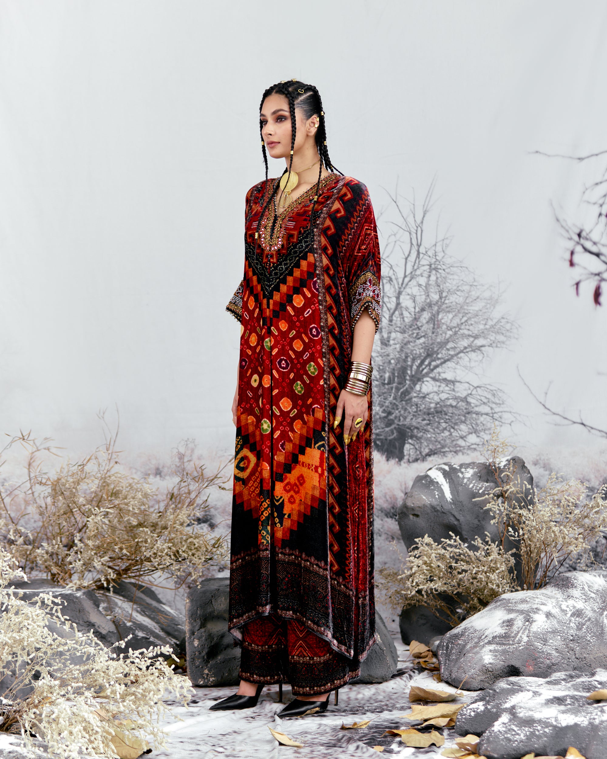 The kaftan tunic is a comfortable boxy shape that has drop shoulders and Cuffs at the sleeve hem.