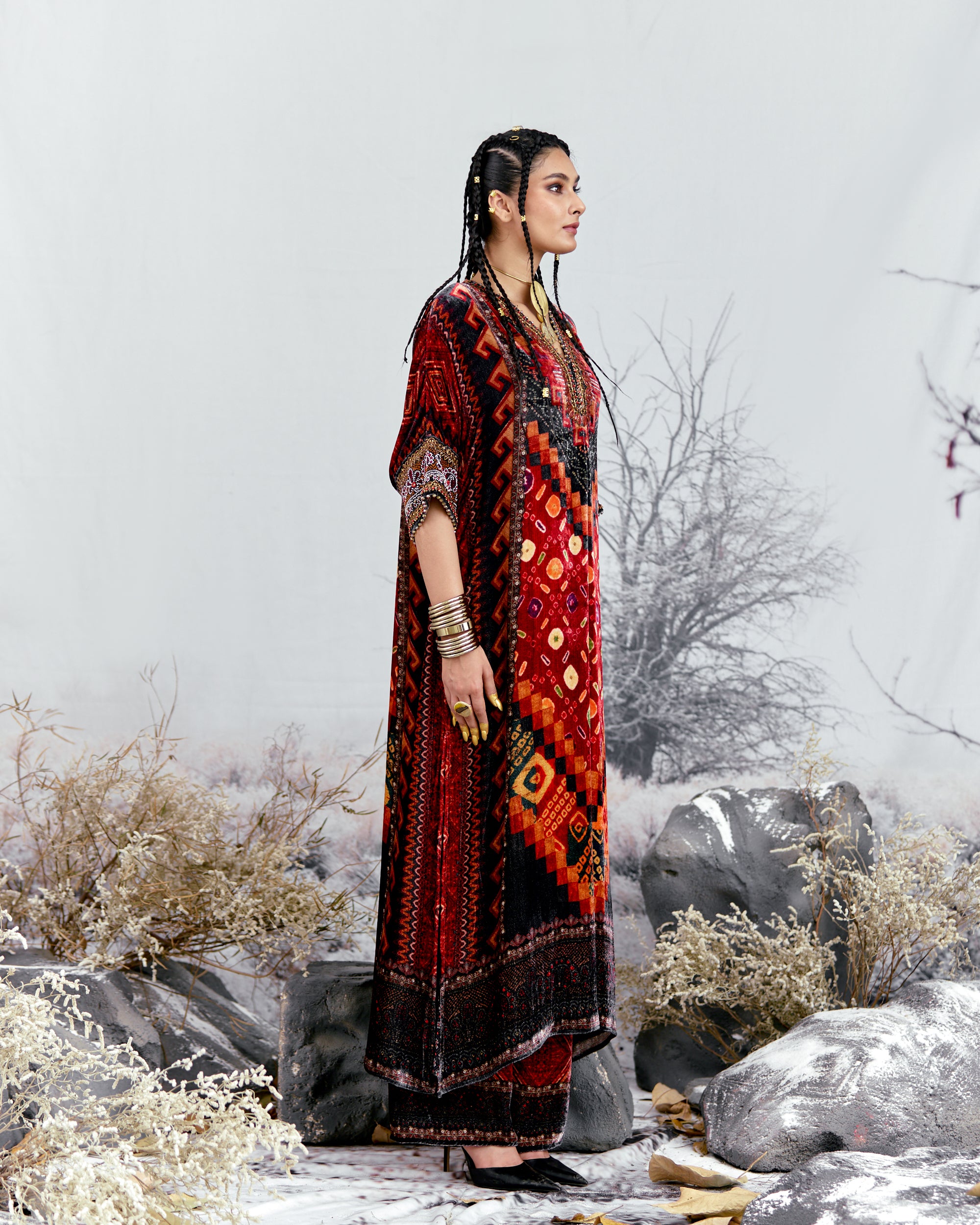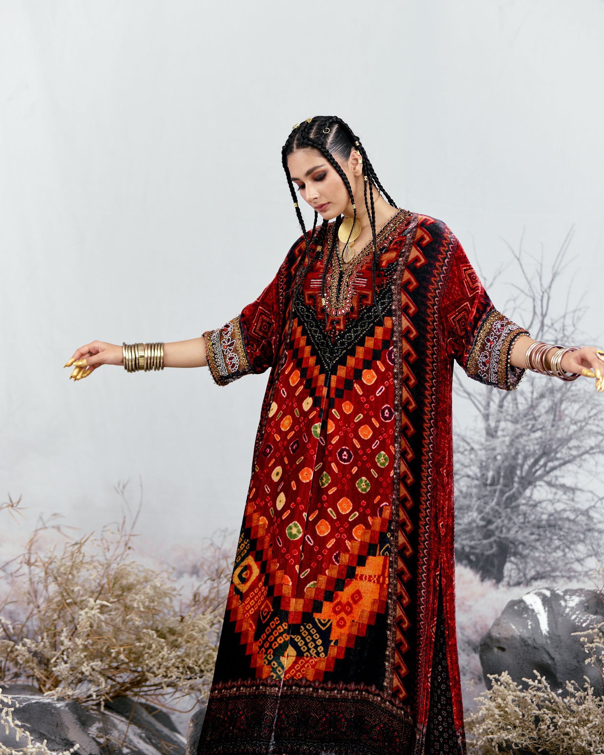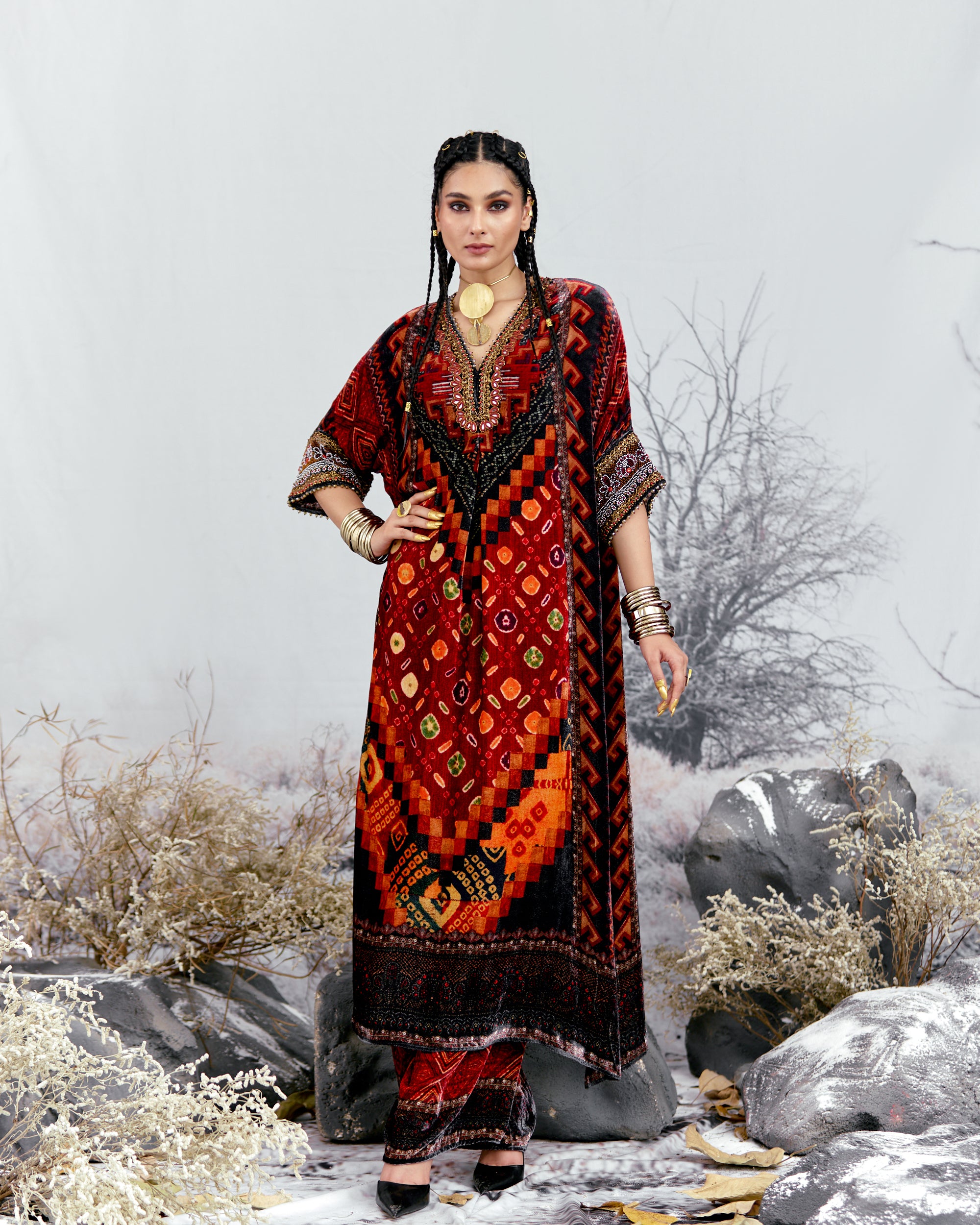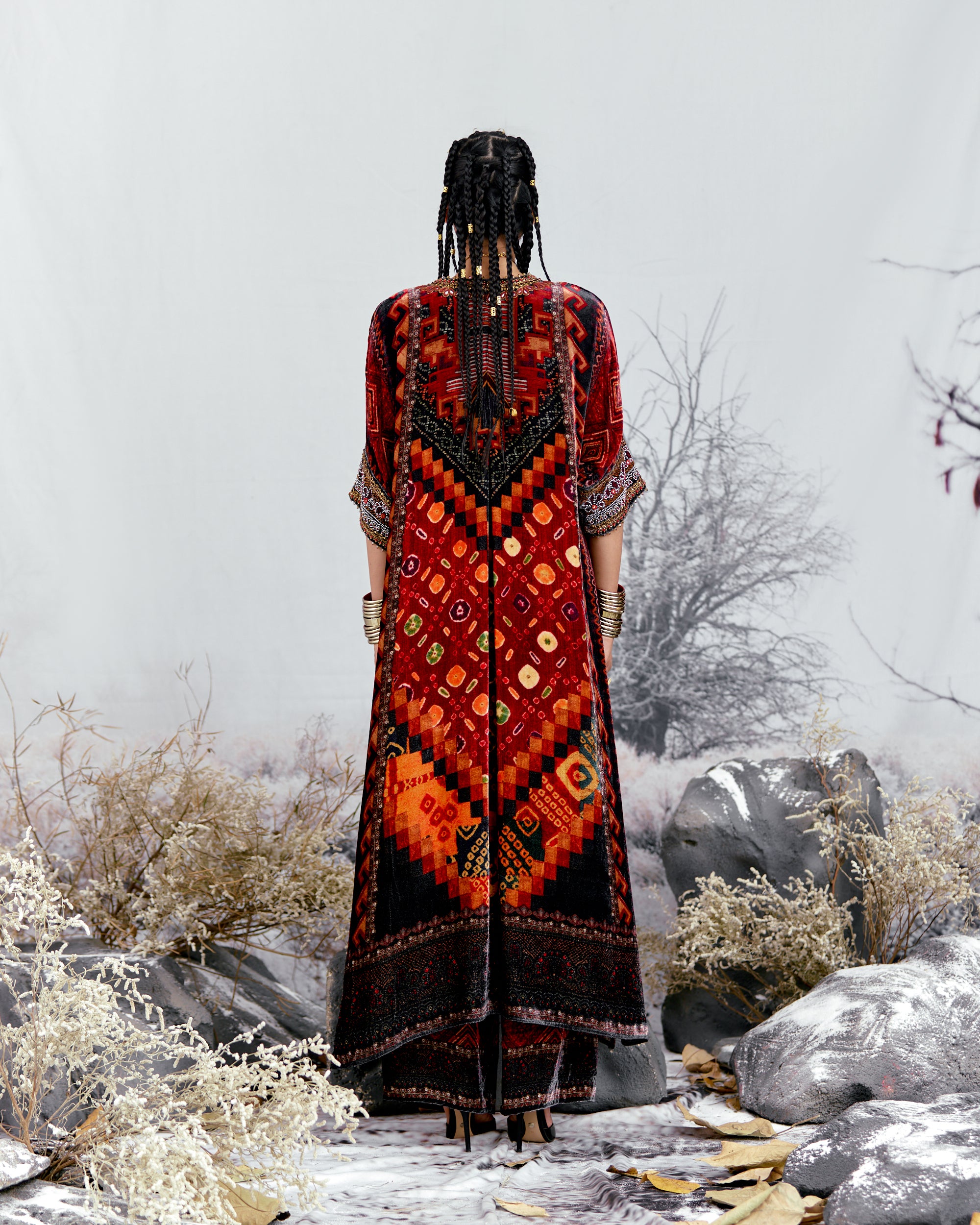 The kaftan tunic is a comfortable boxy shape that has drop shoulders and Cuffs at the sleeve hem.