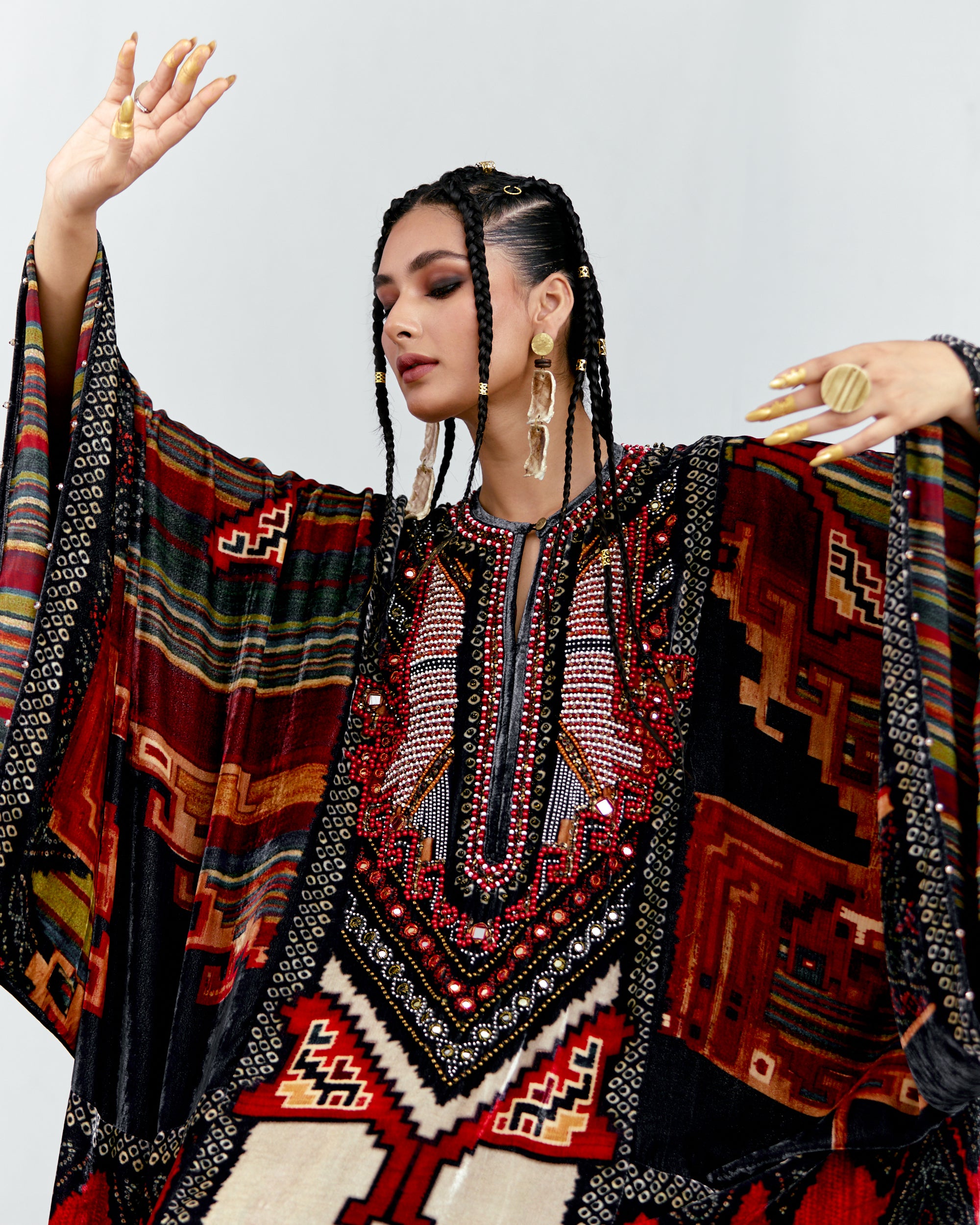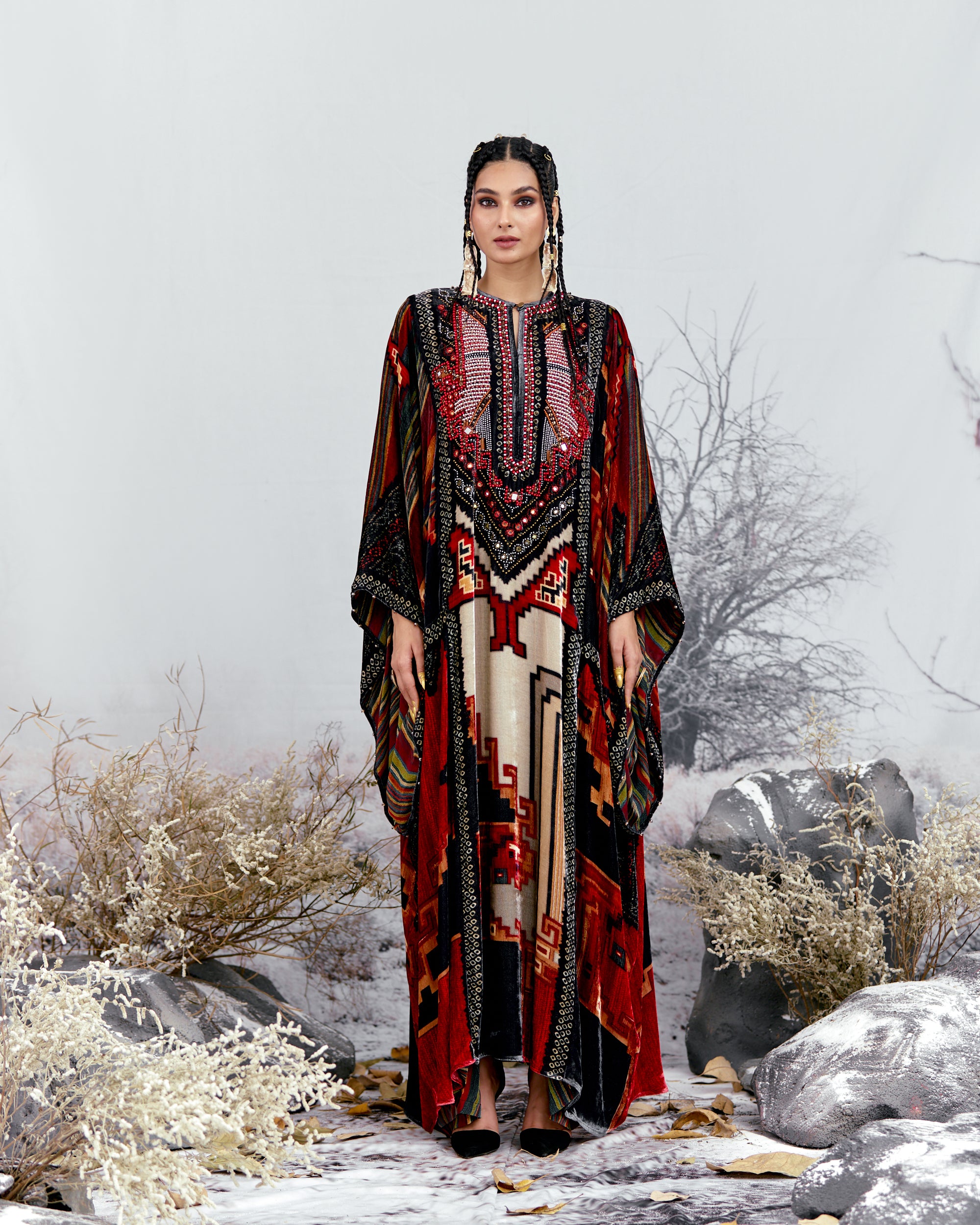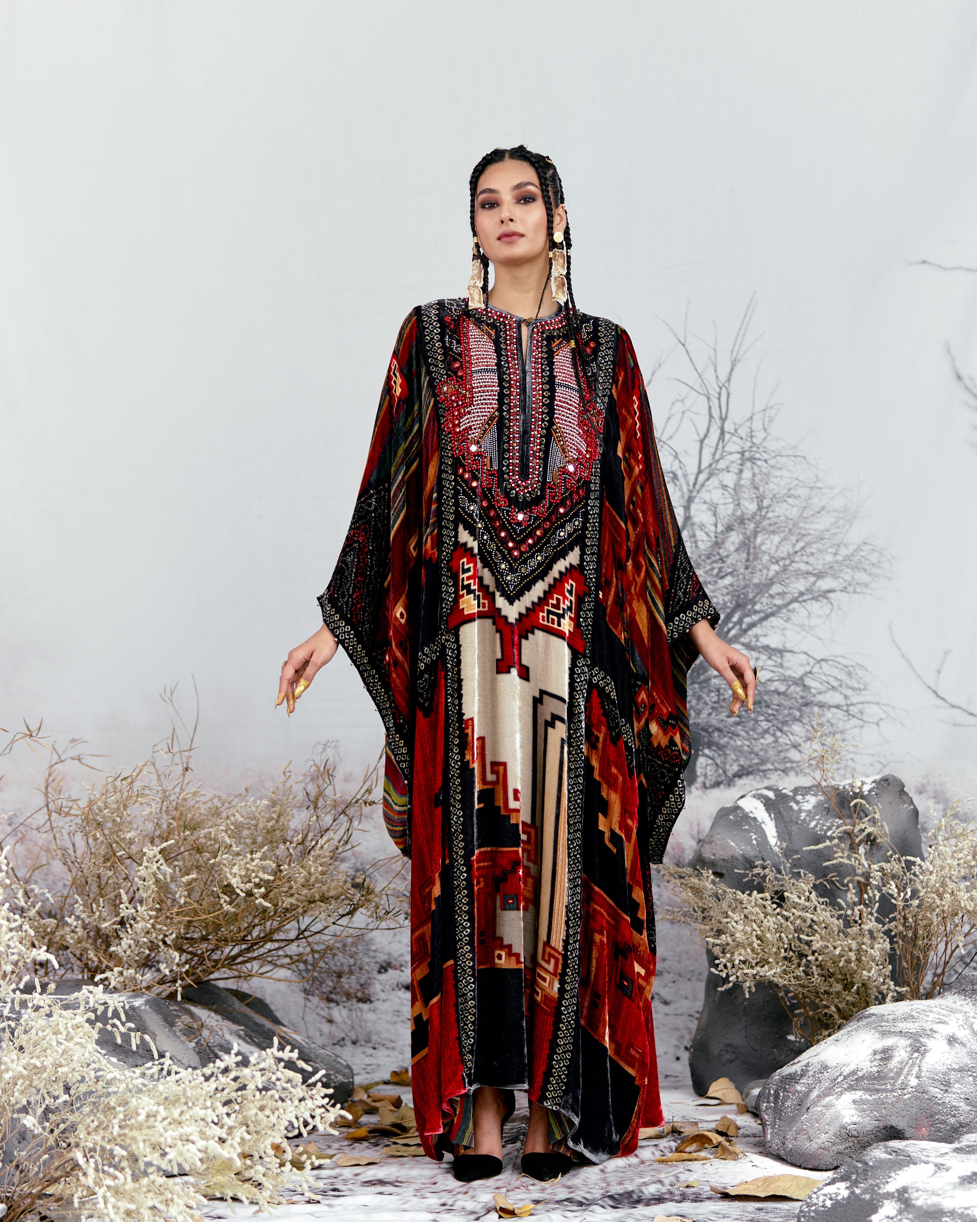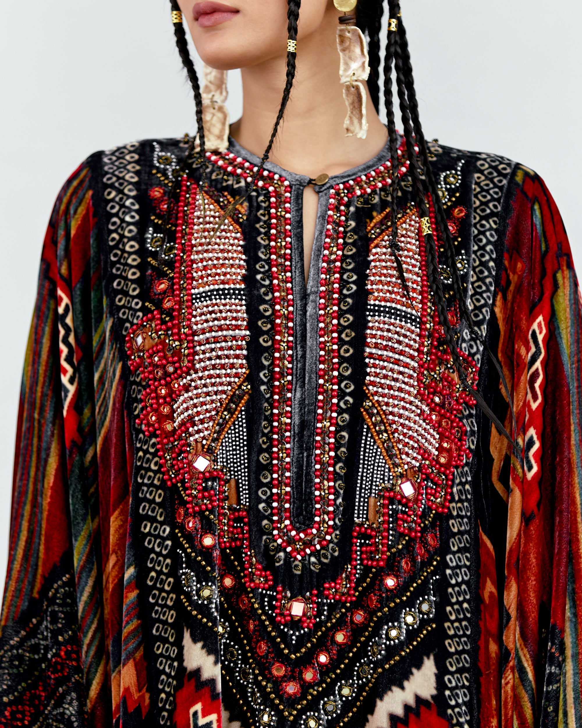 This Kaftan has straight boxy kimono sleeves and panels on the sides.