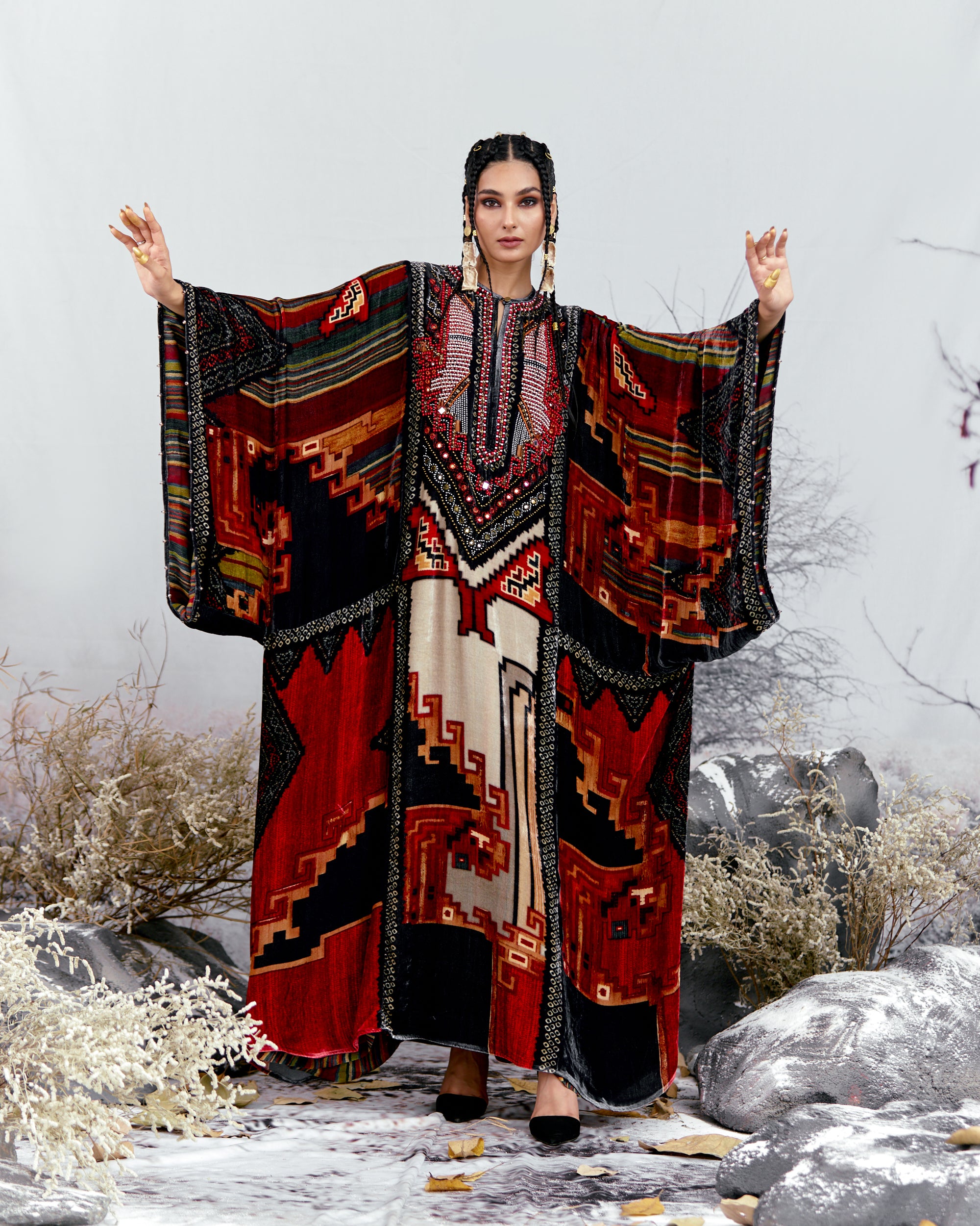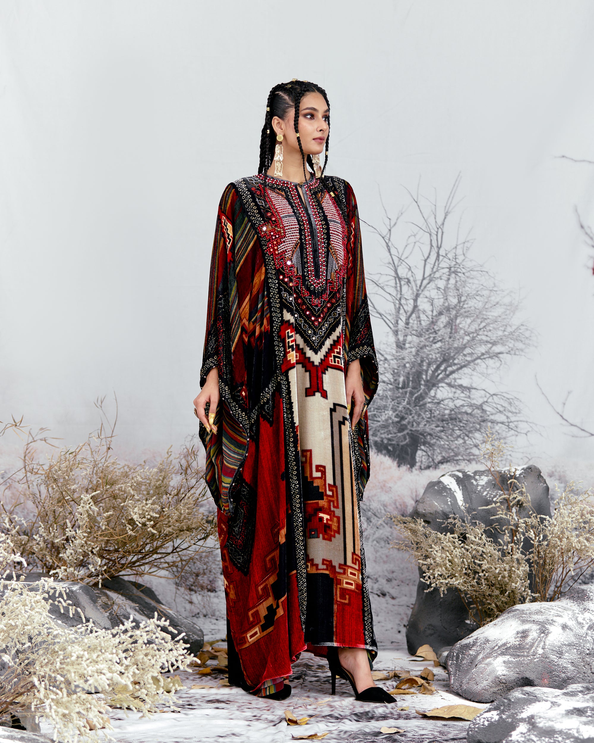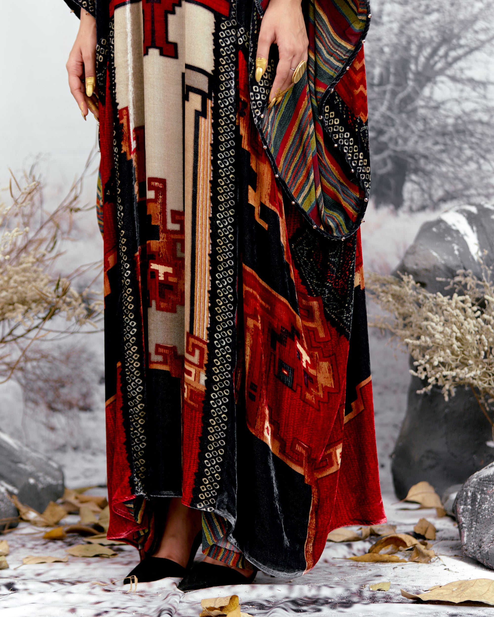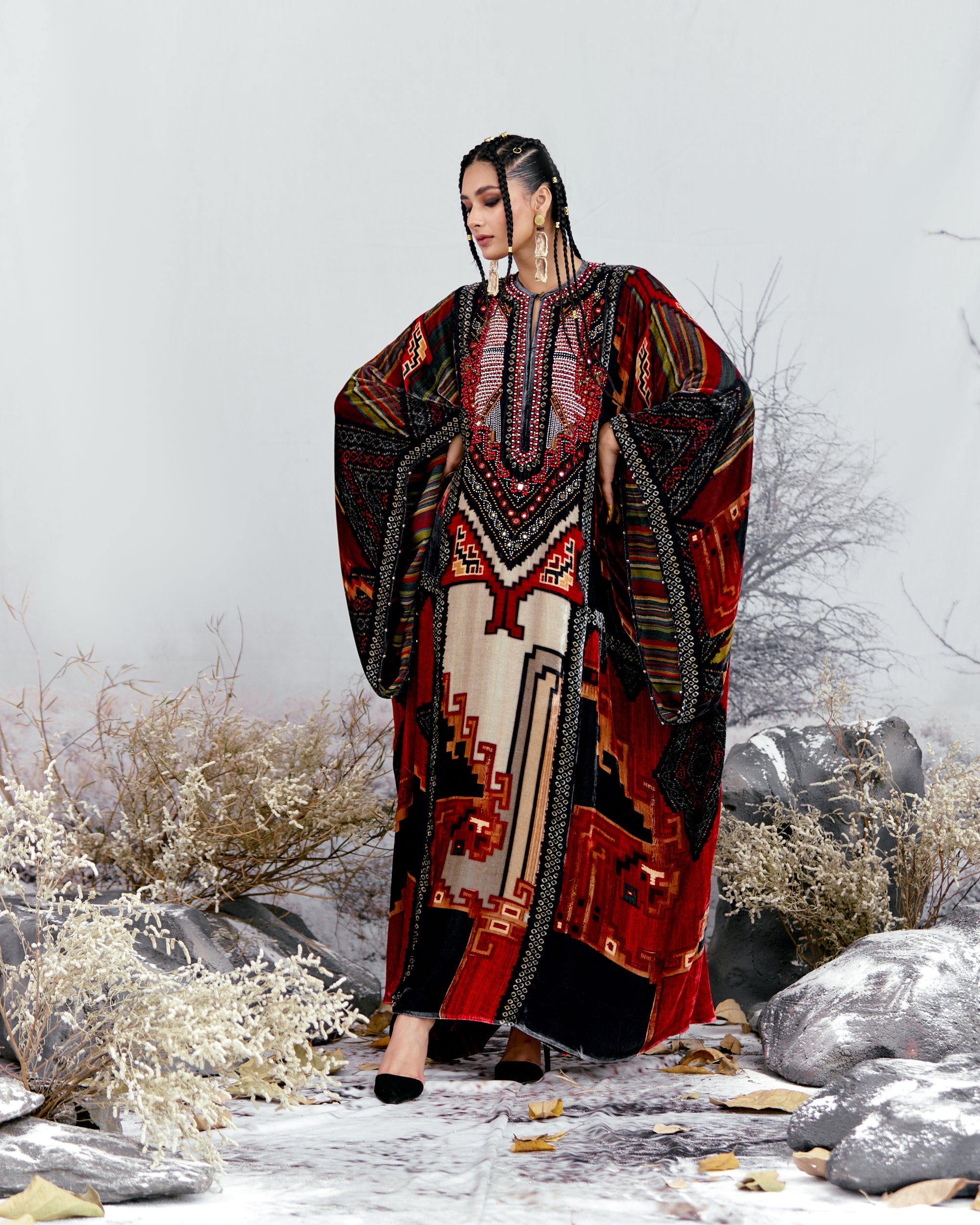 This Kaftan has straight boxy kimono sleeves and panels on the sides.