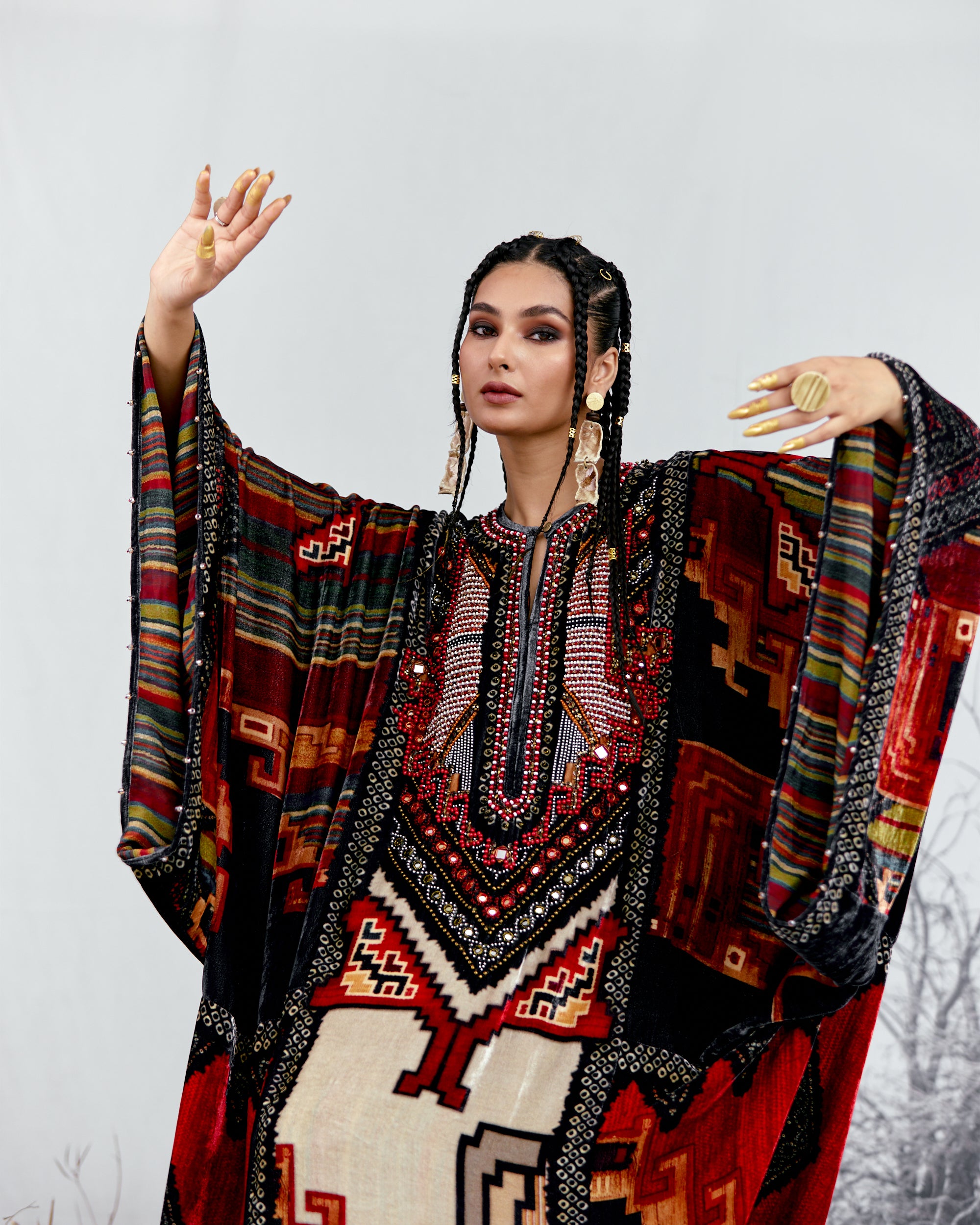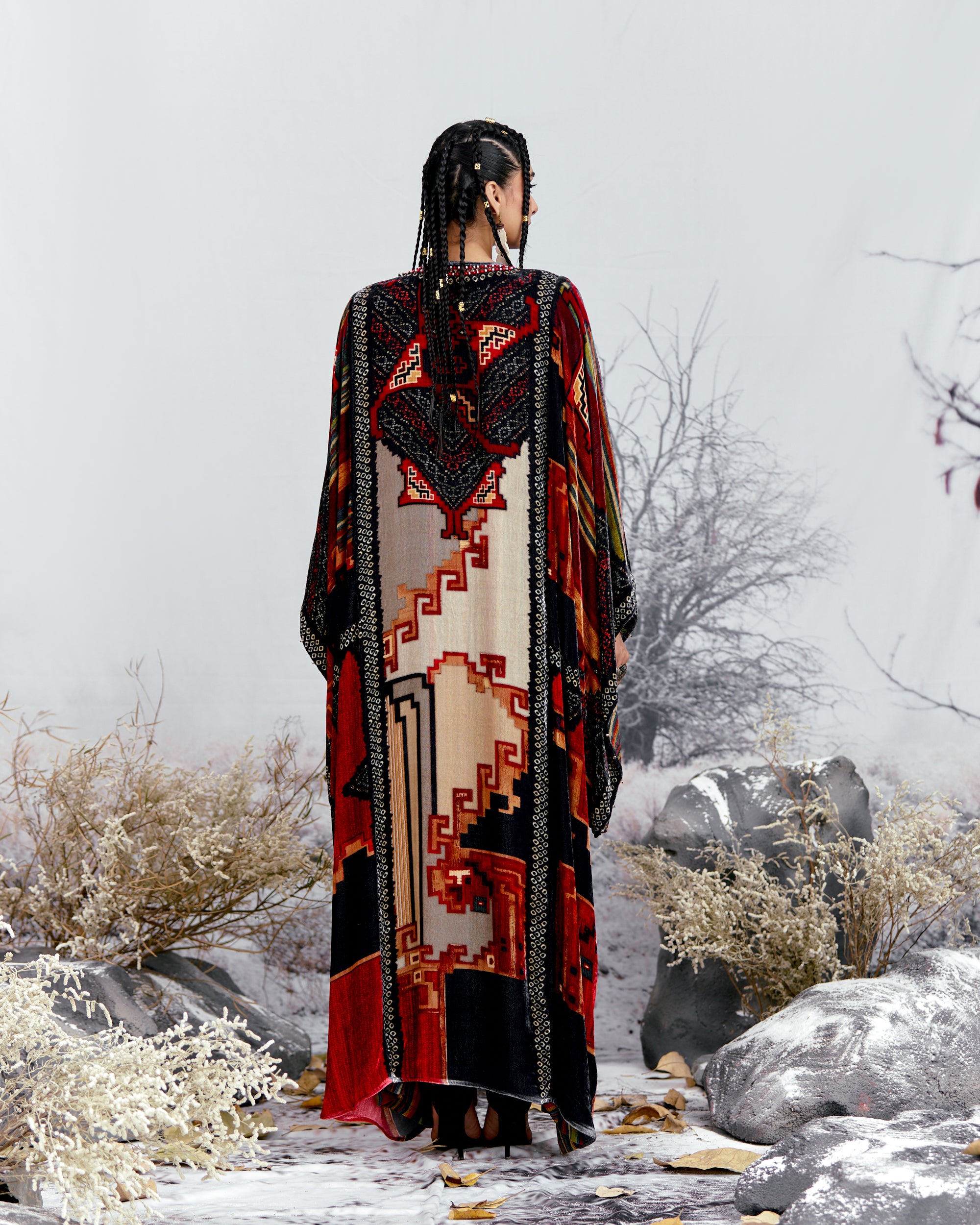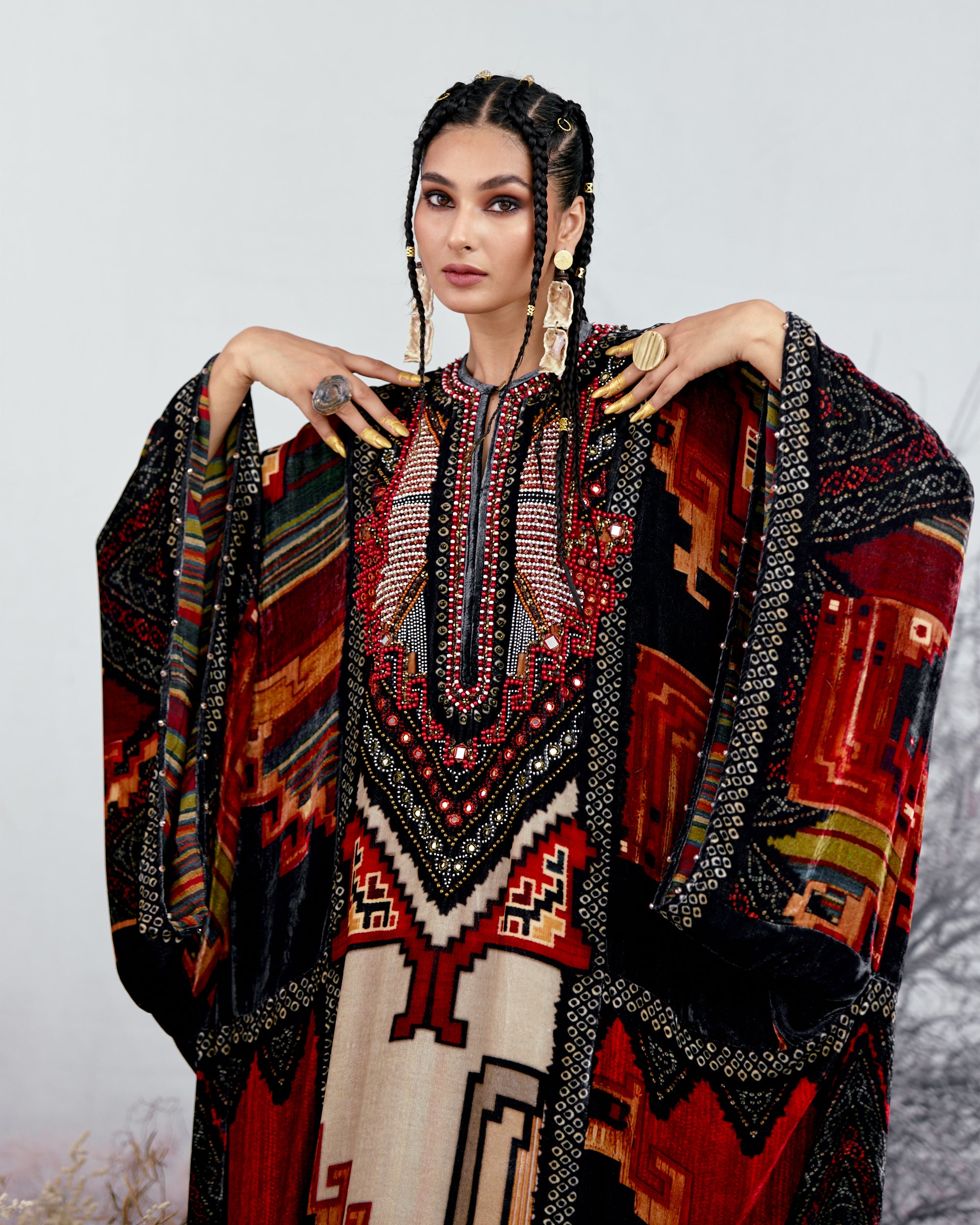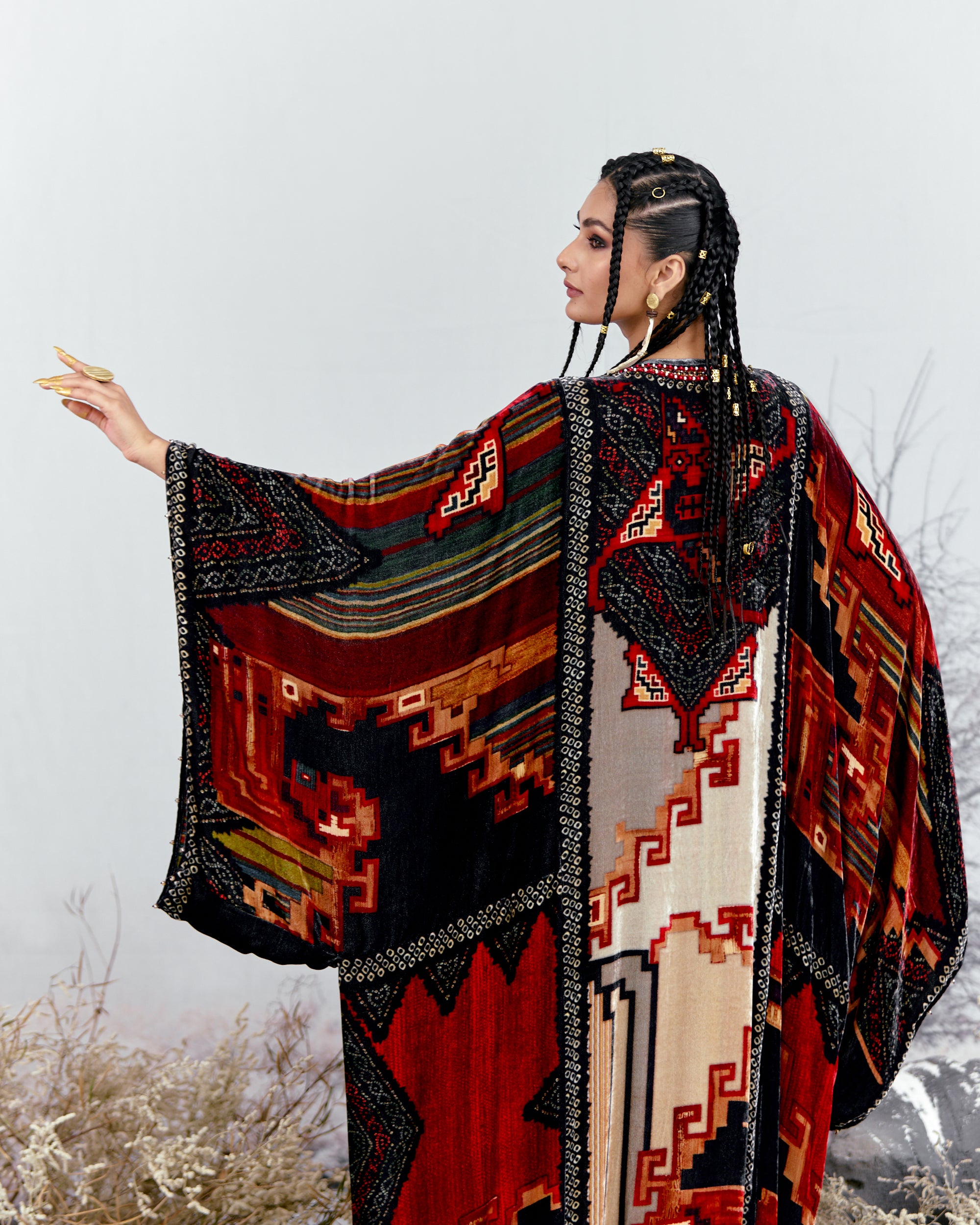 This Kaftan has straight boxy kimono sleeves and panels on the sides.
