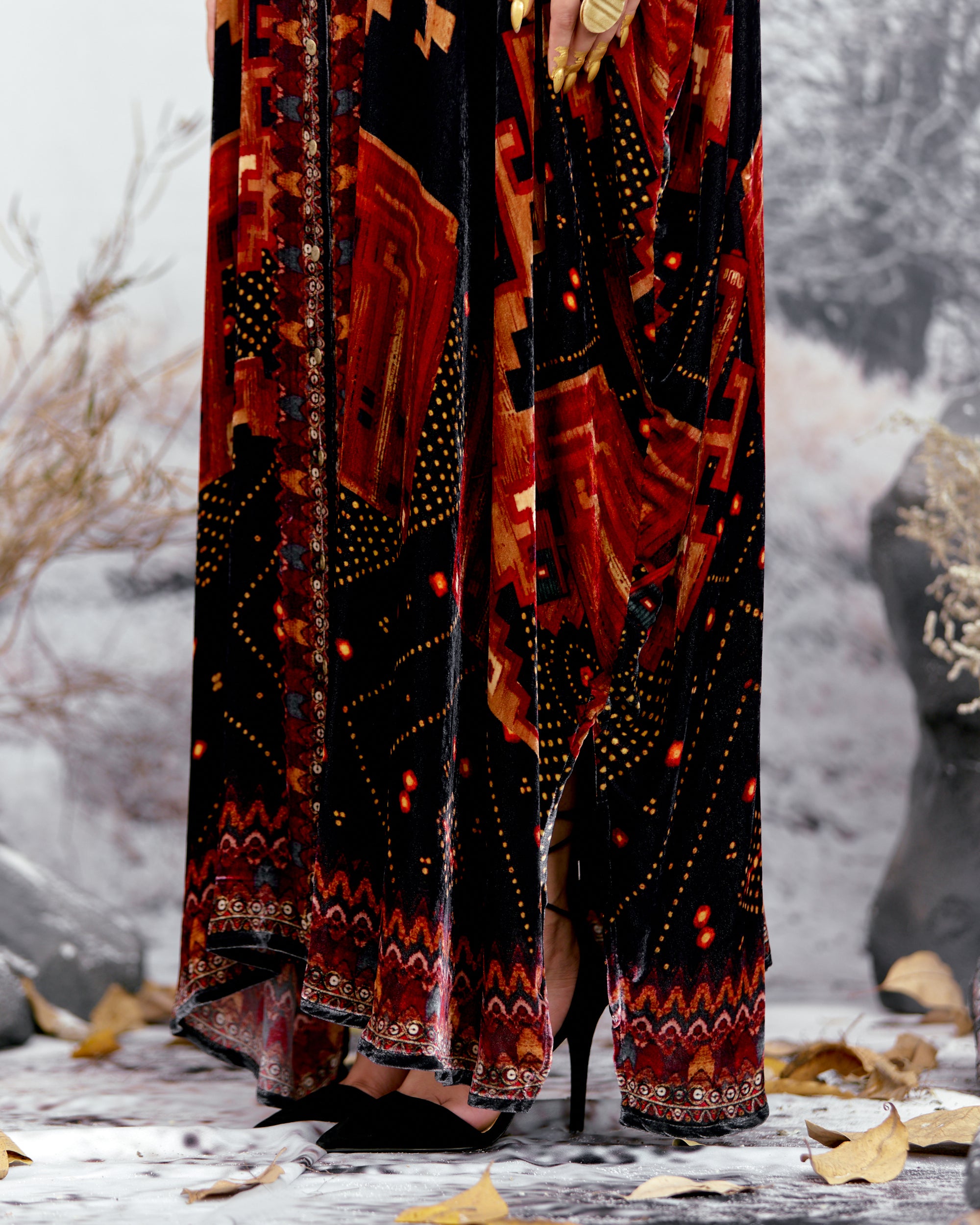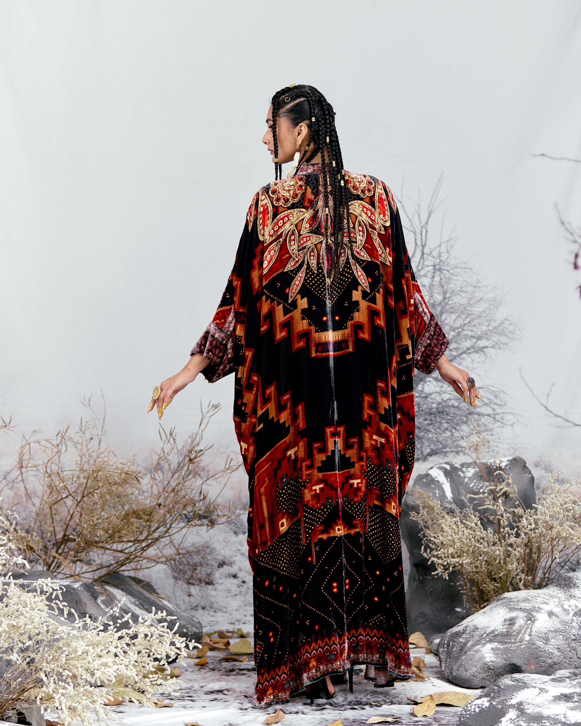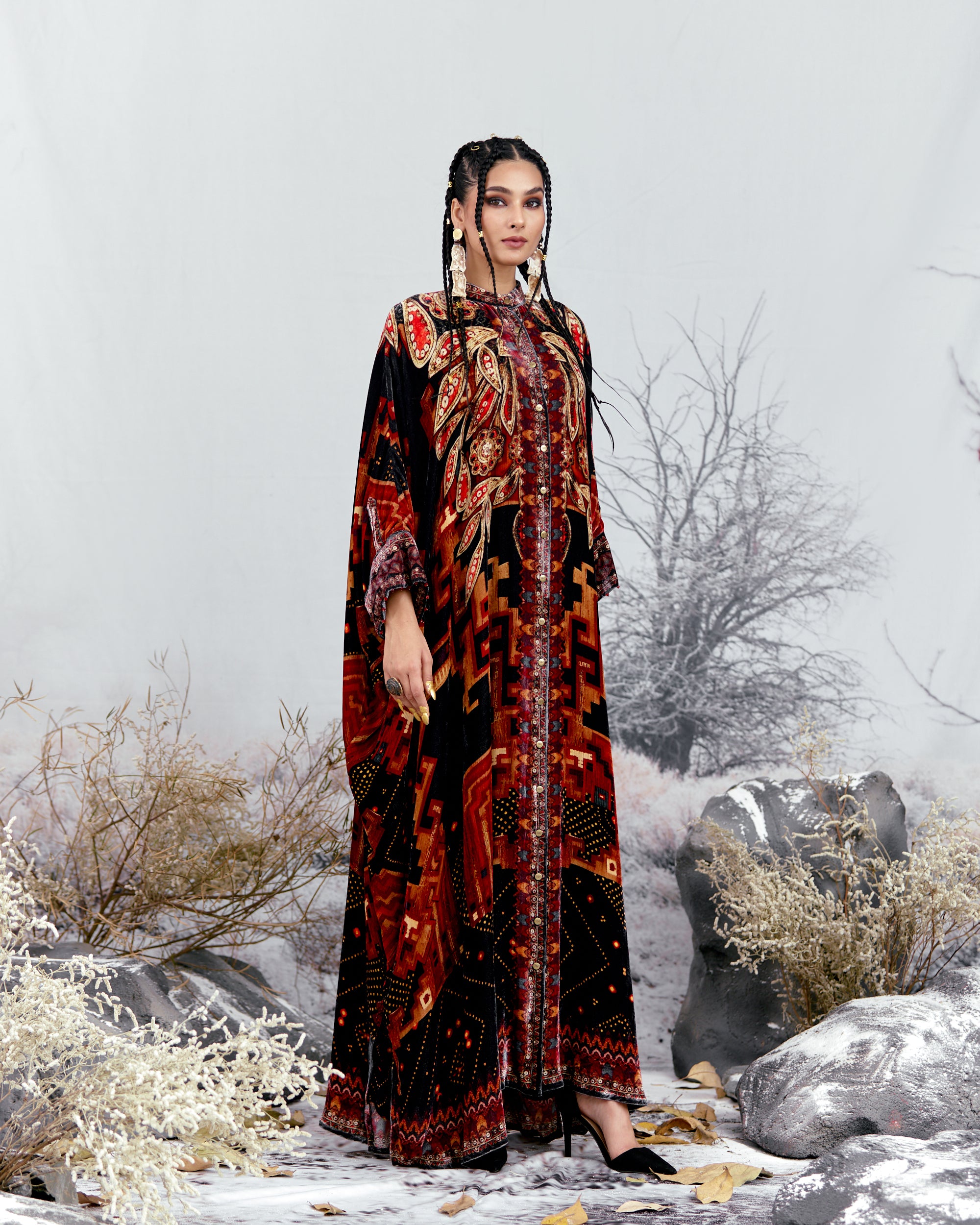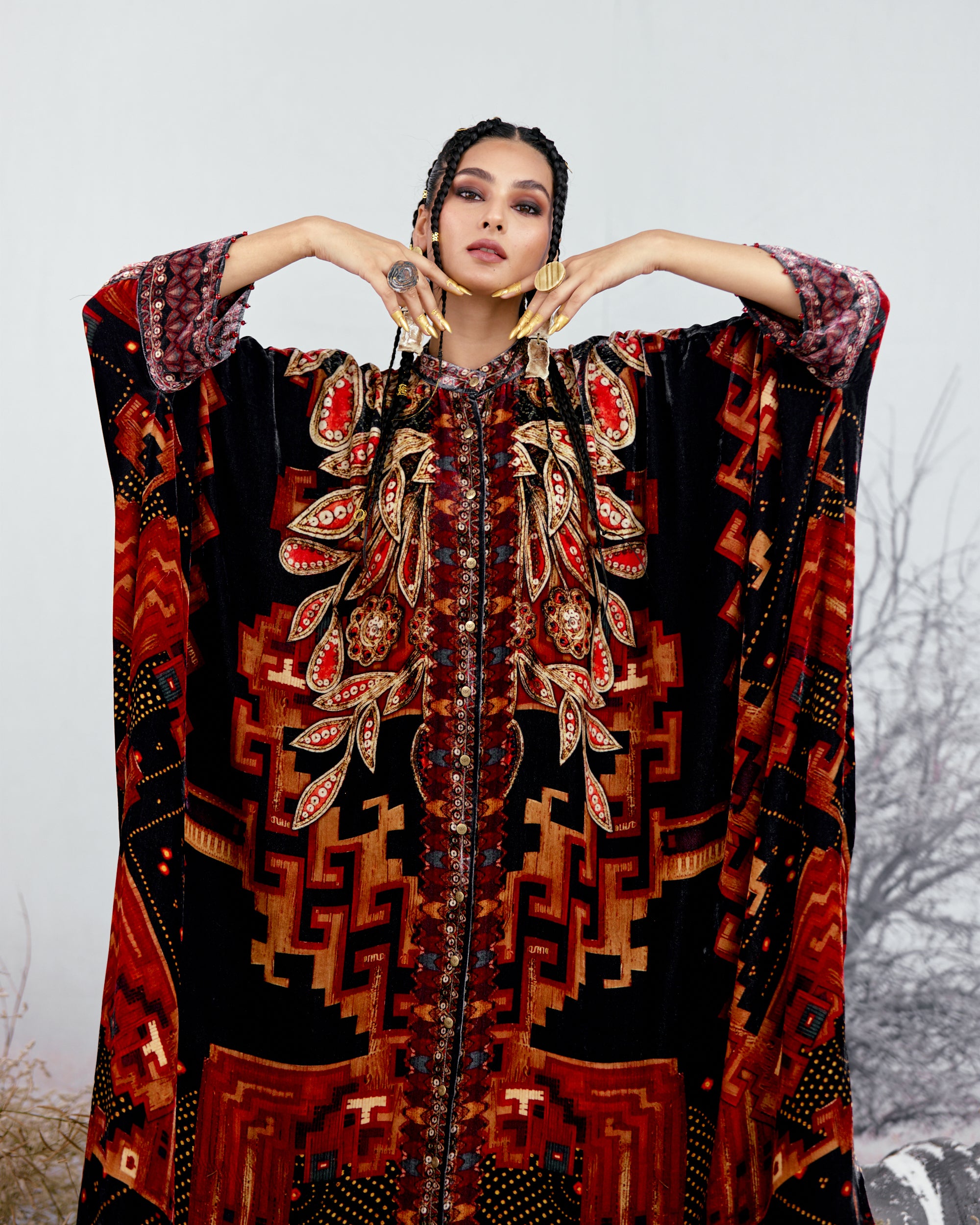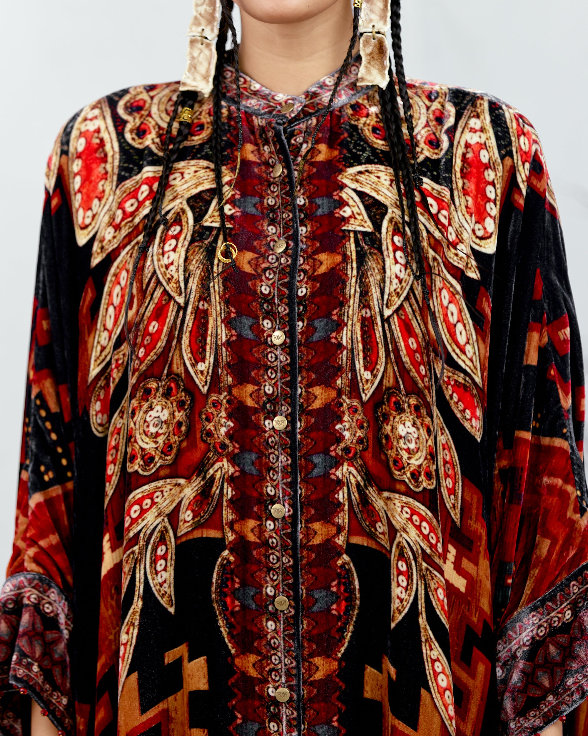 A printed kaftan tunic shirt with cuffs and button front placket.