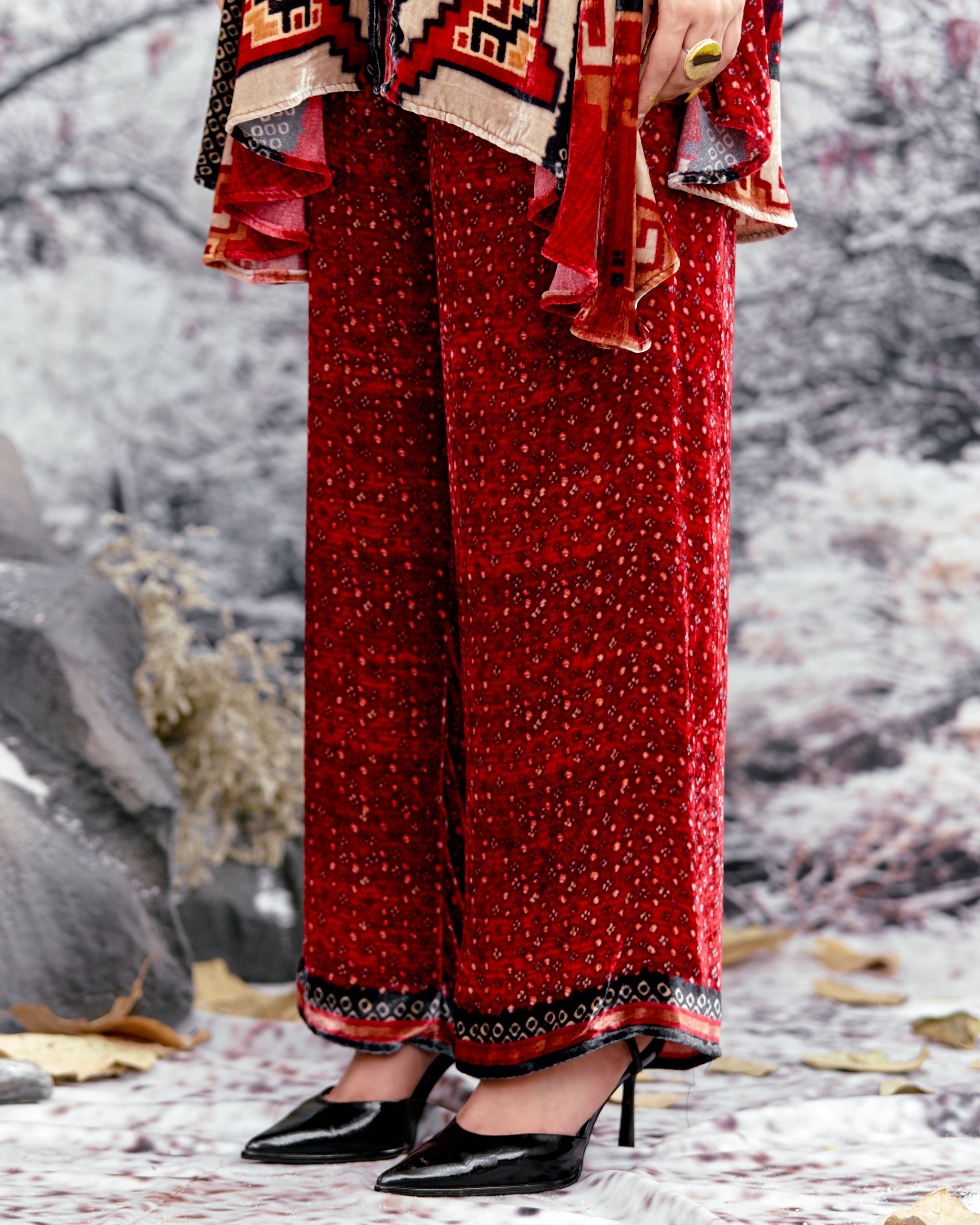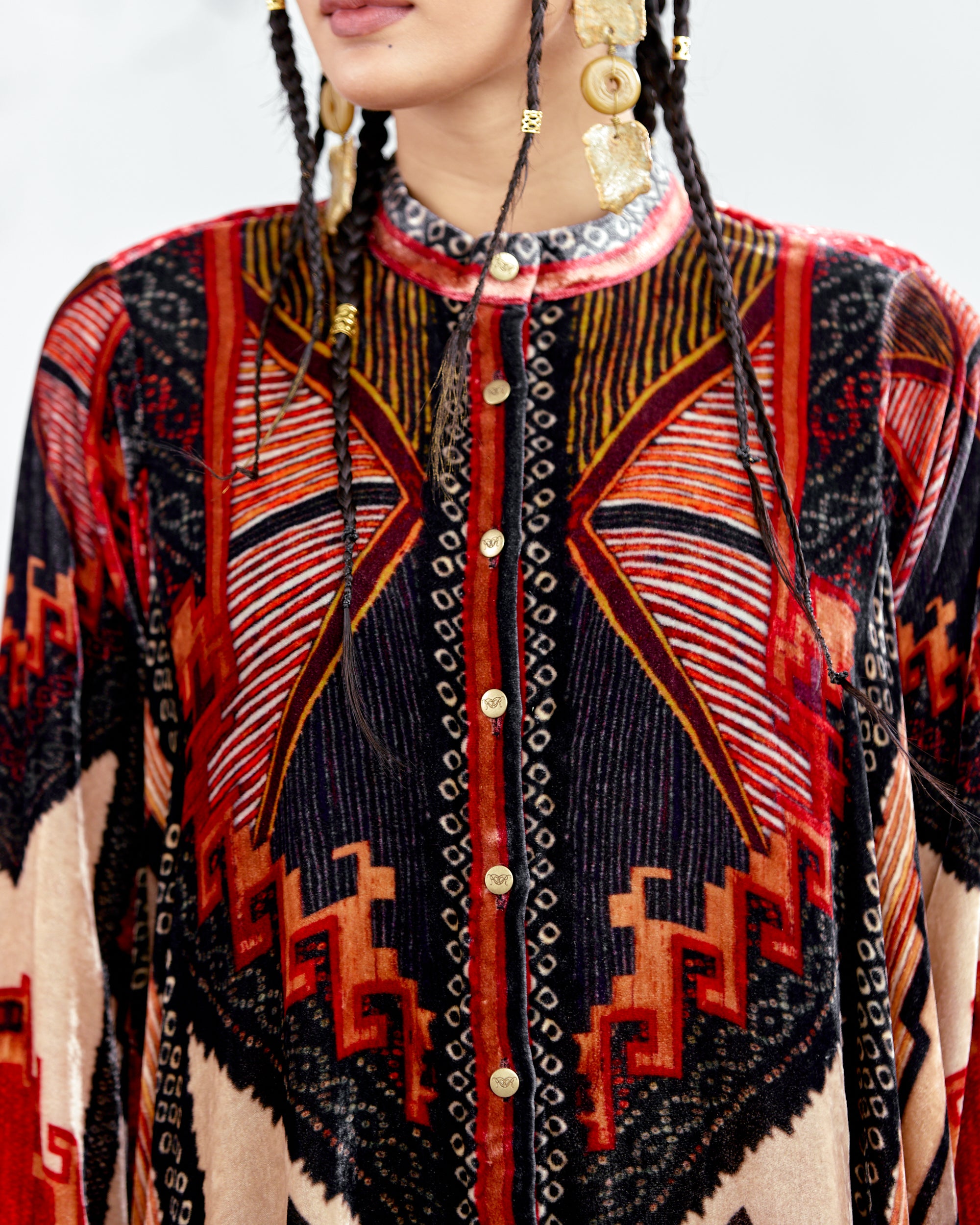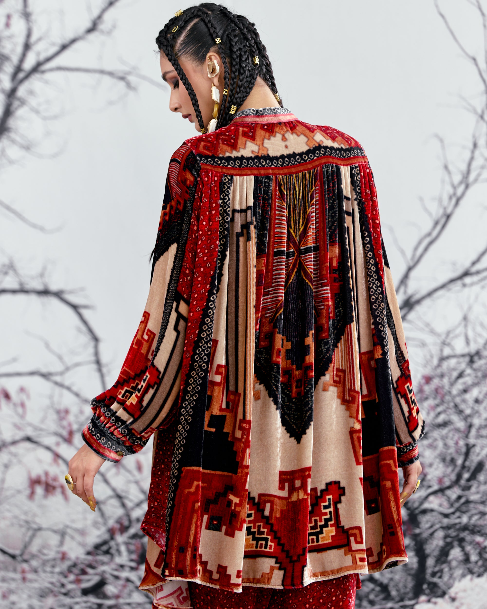 A silk print long sleeve button front shirt with a flared from and back. Pair it with our matching print palazzo pants that coordinates and completed the look so well.