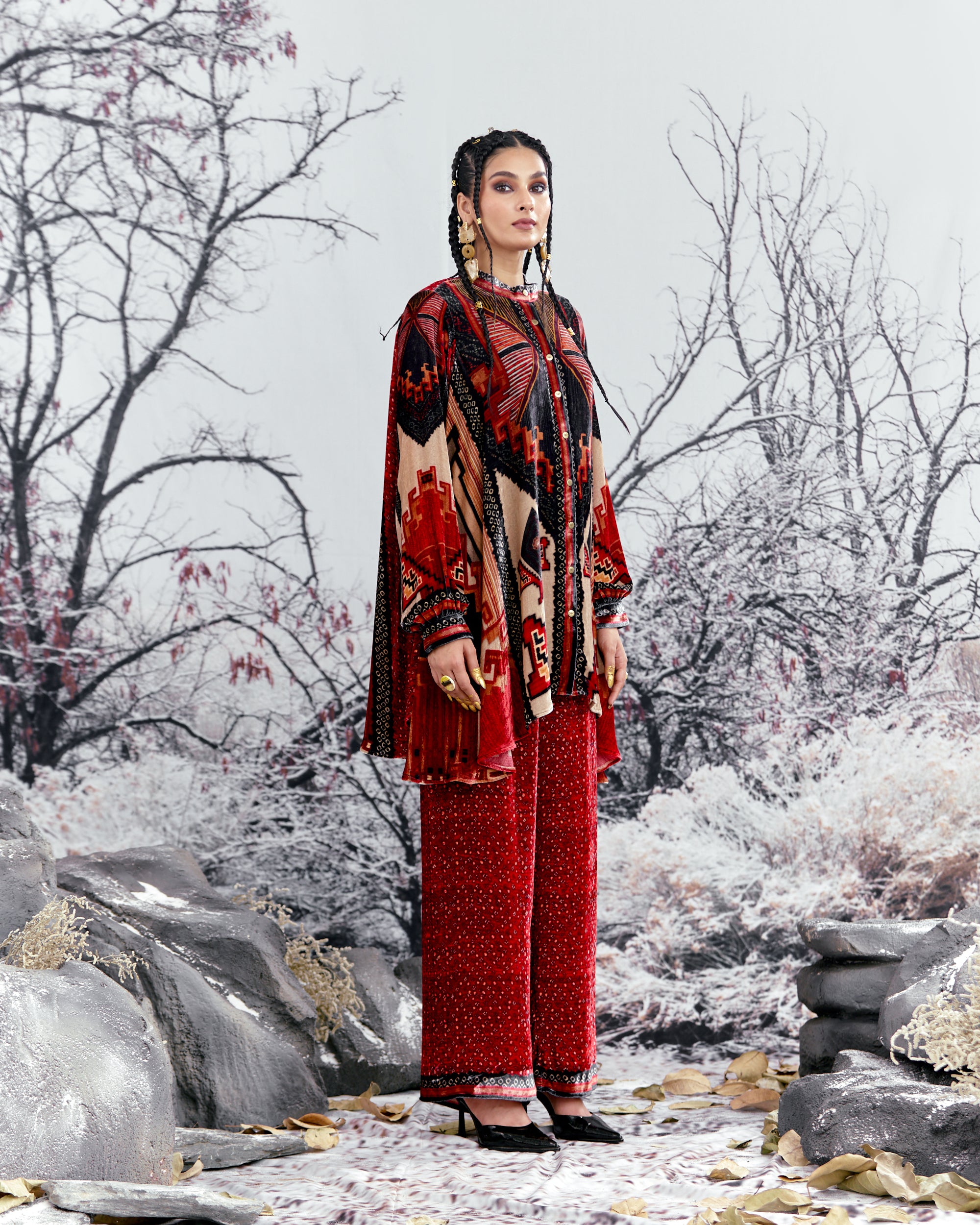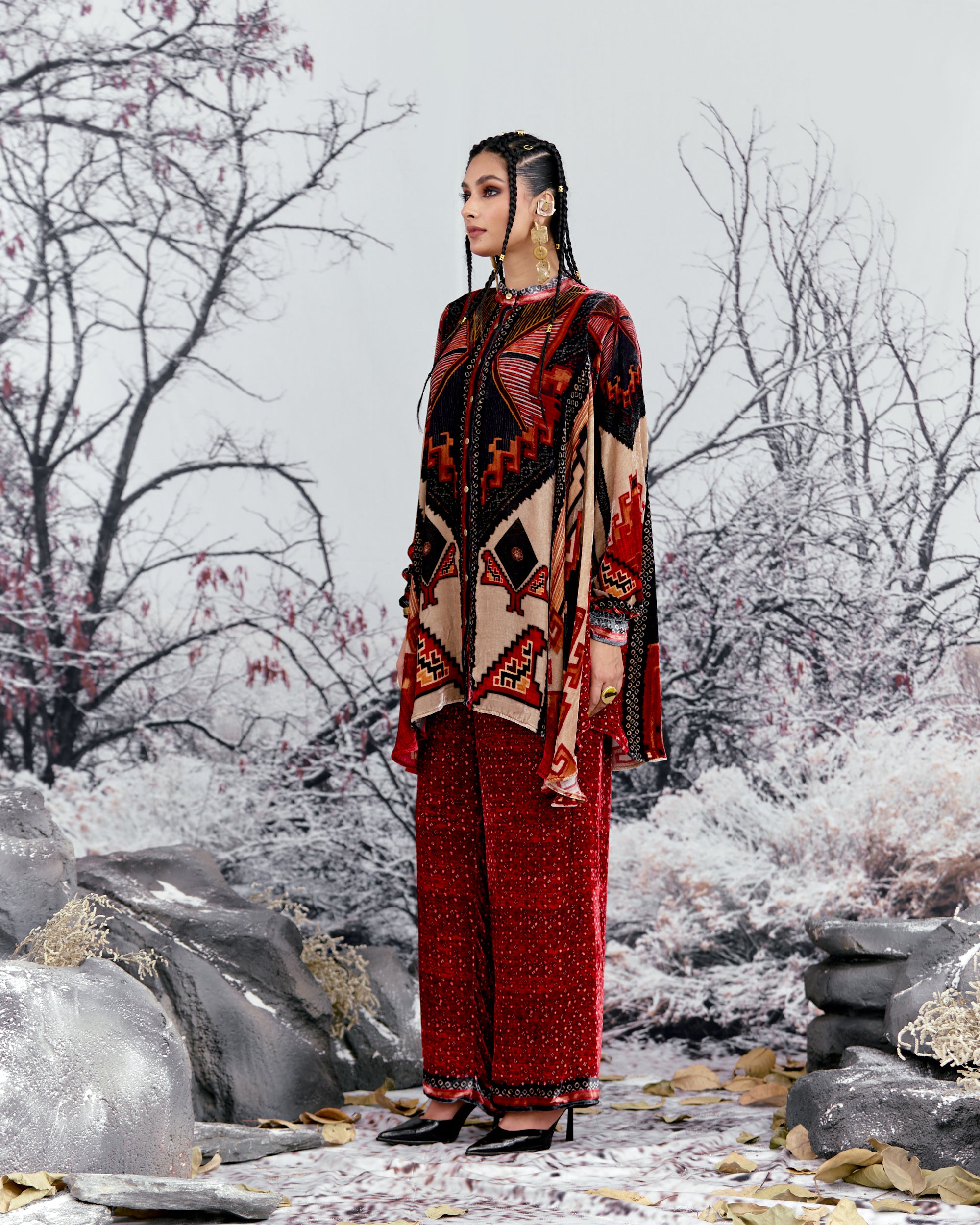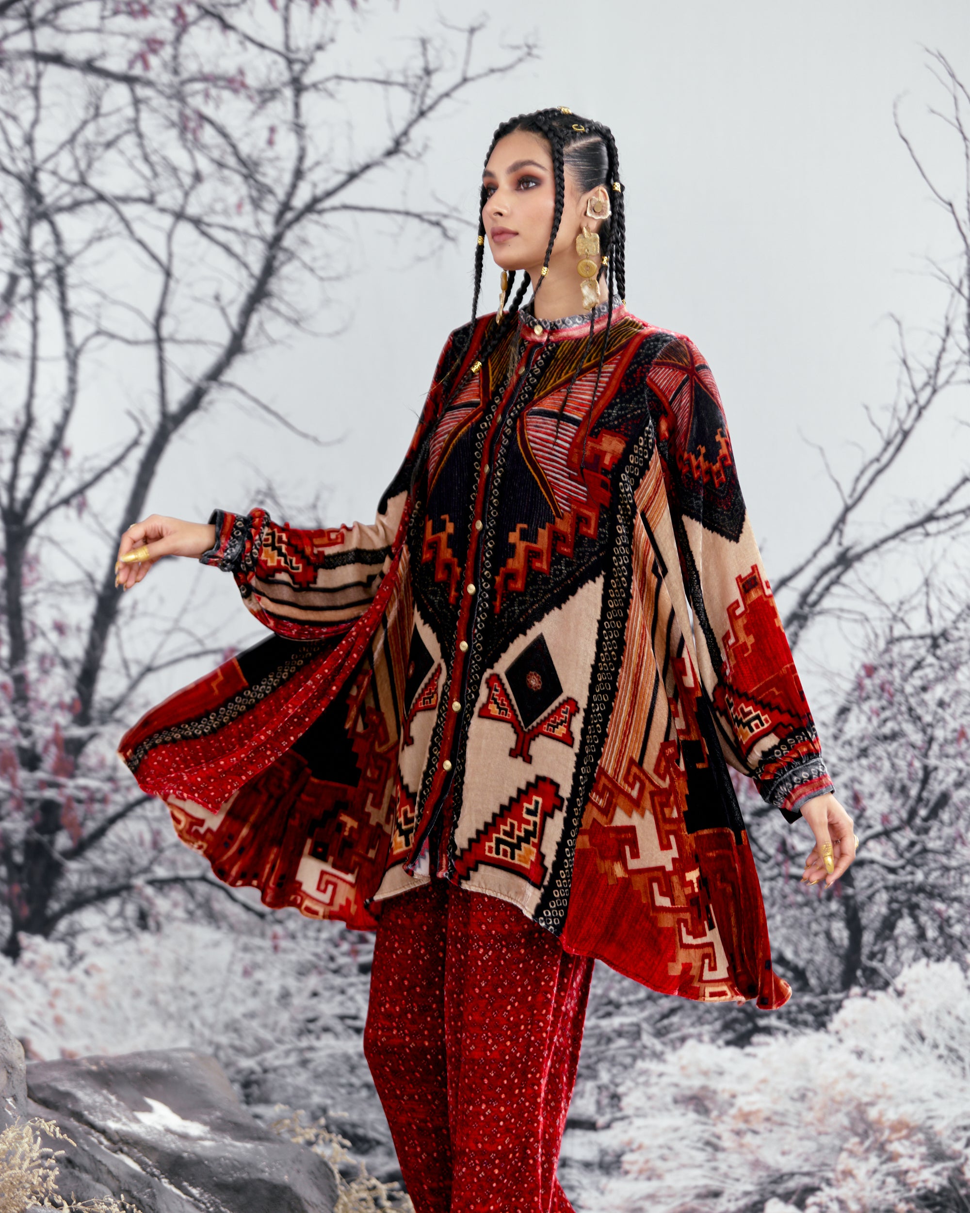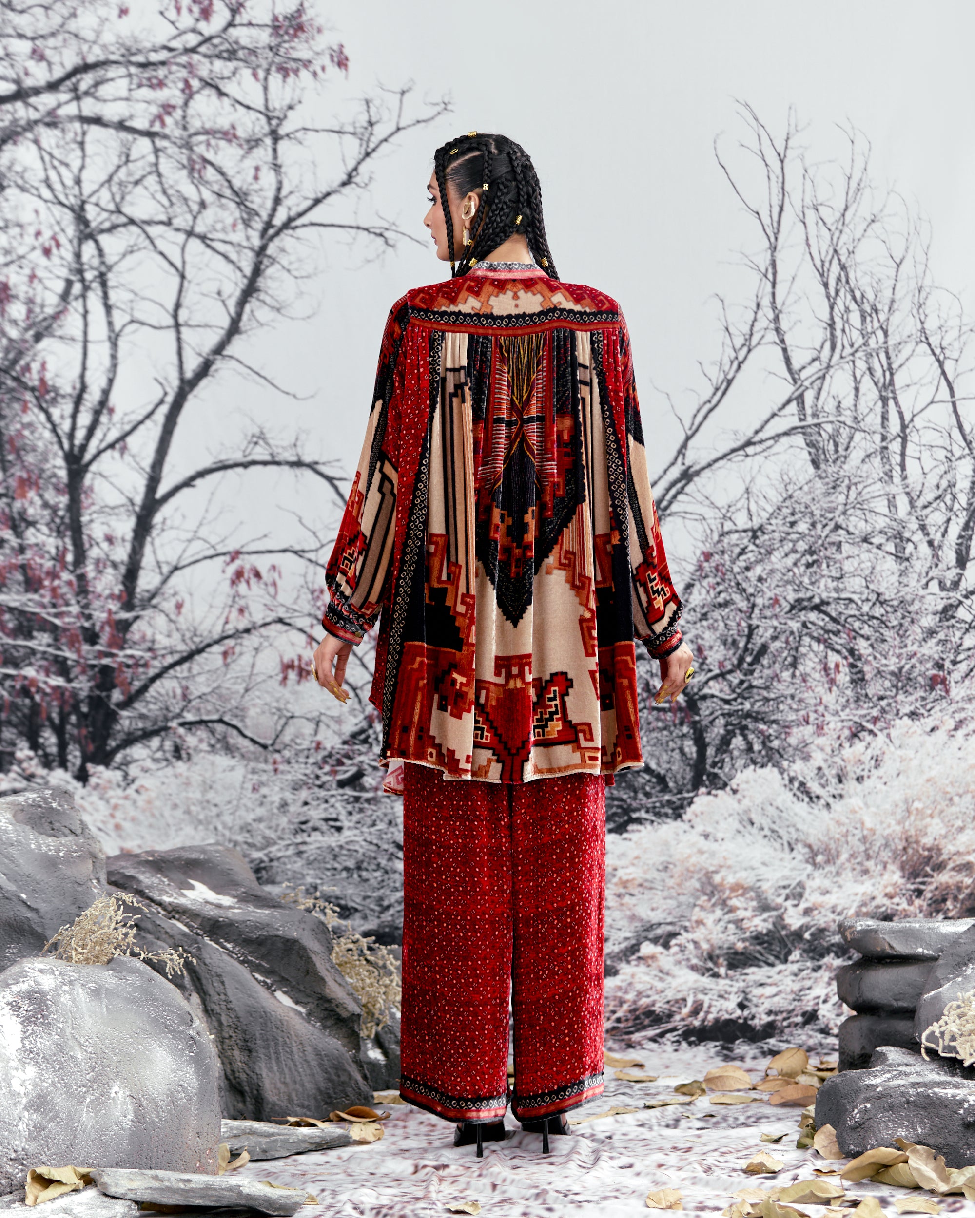 A silk print long sleeve button front shirt with a flared from and back. Pair it with our matching print palazzo pants that coordinates and completed the look so well.