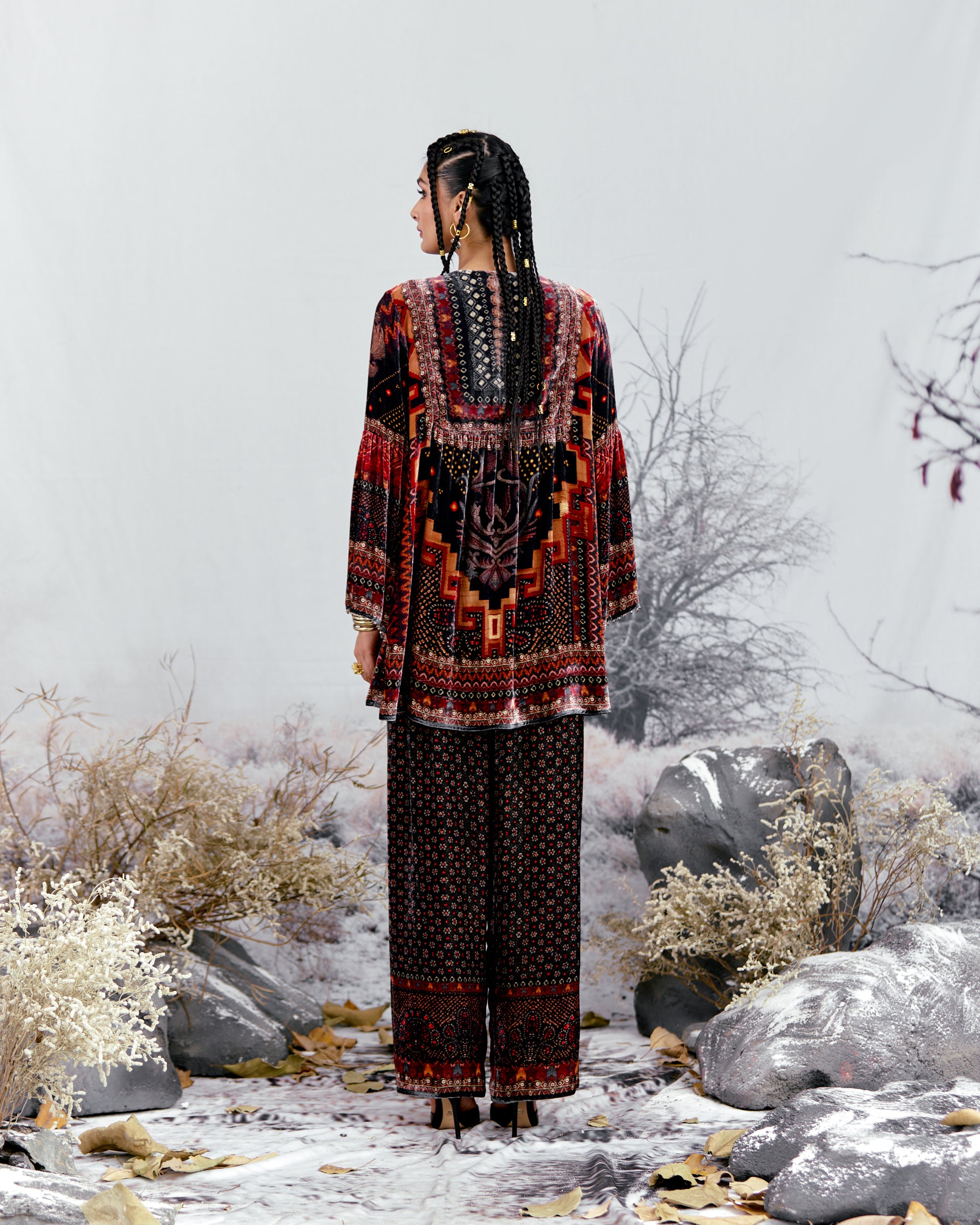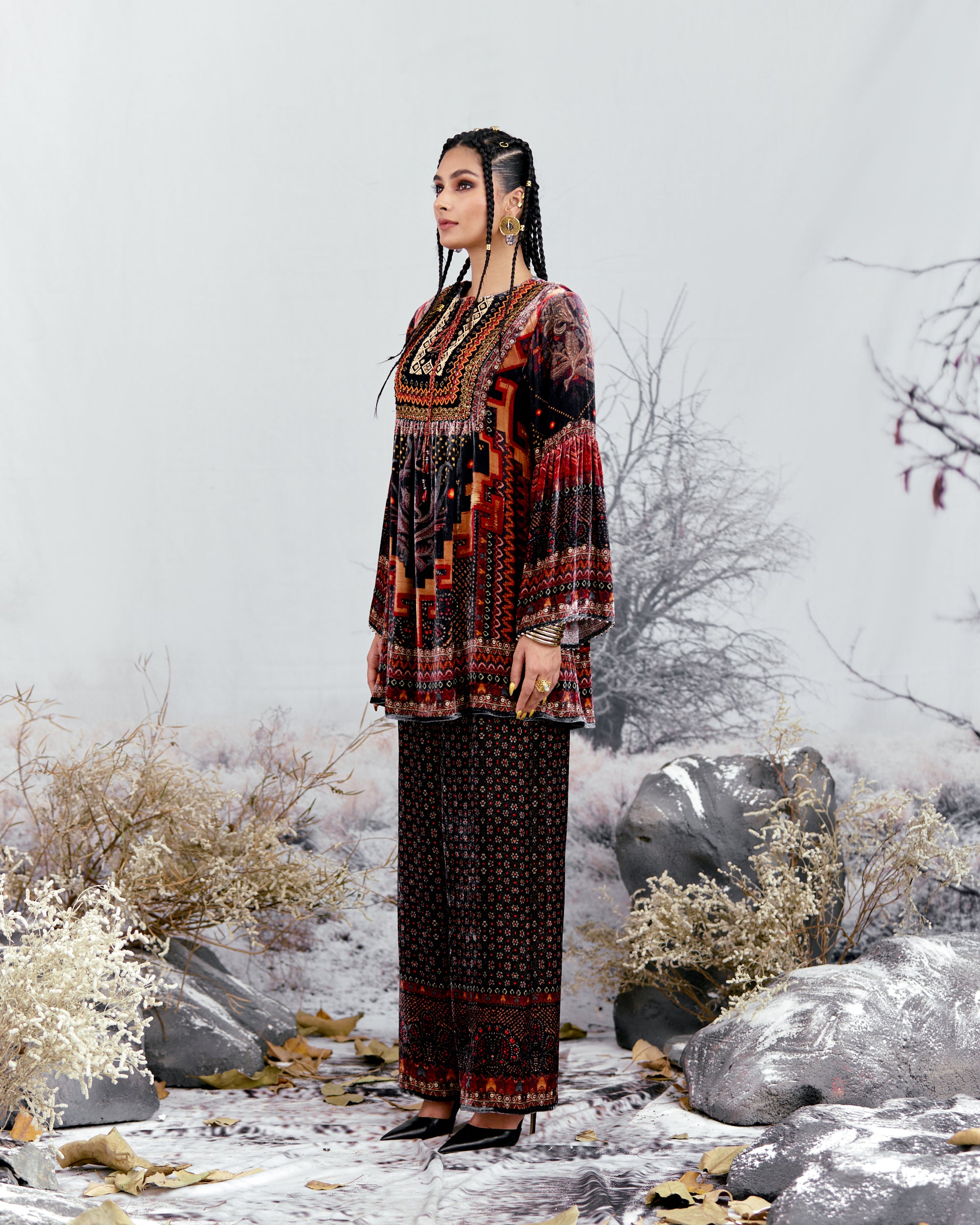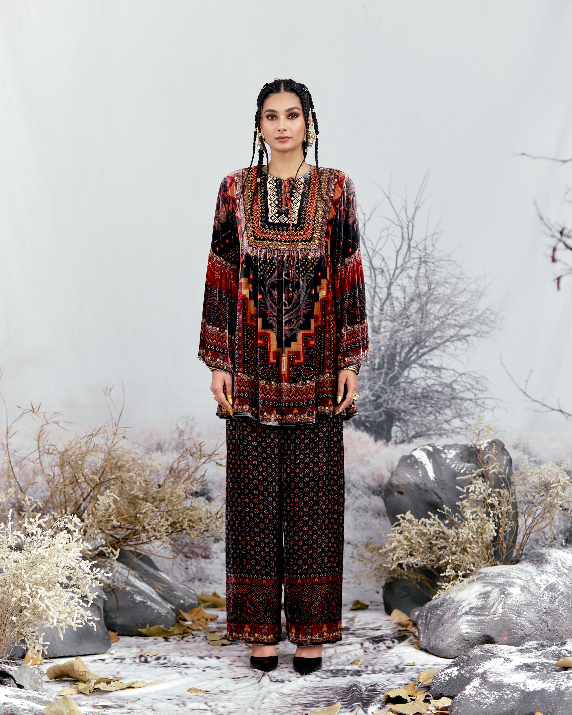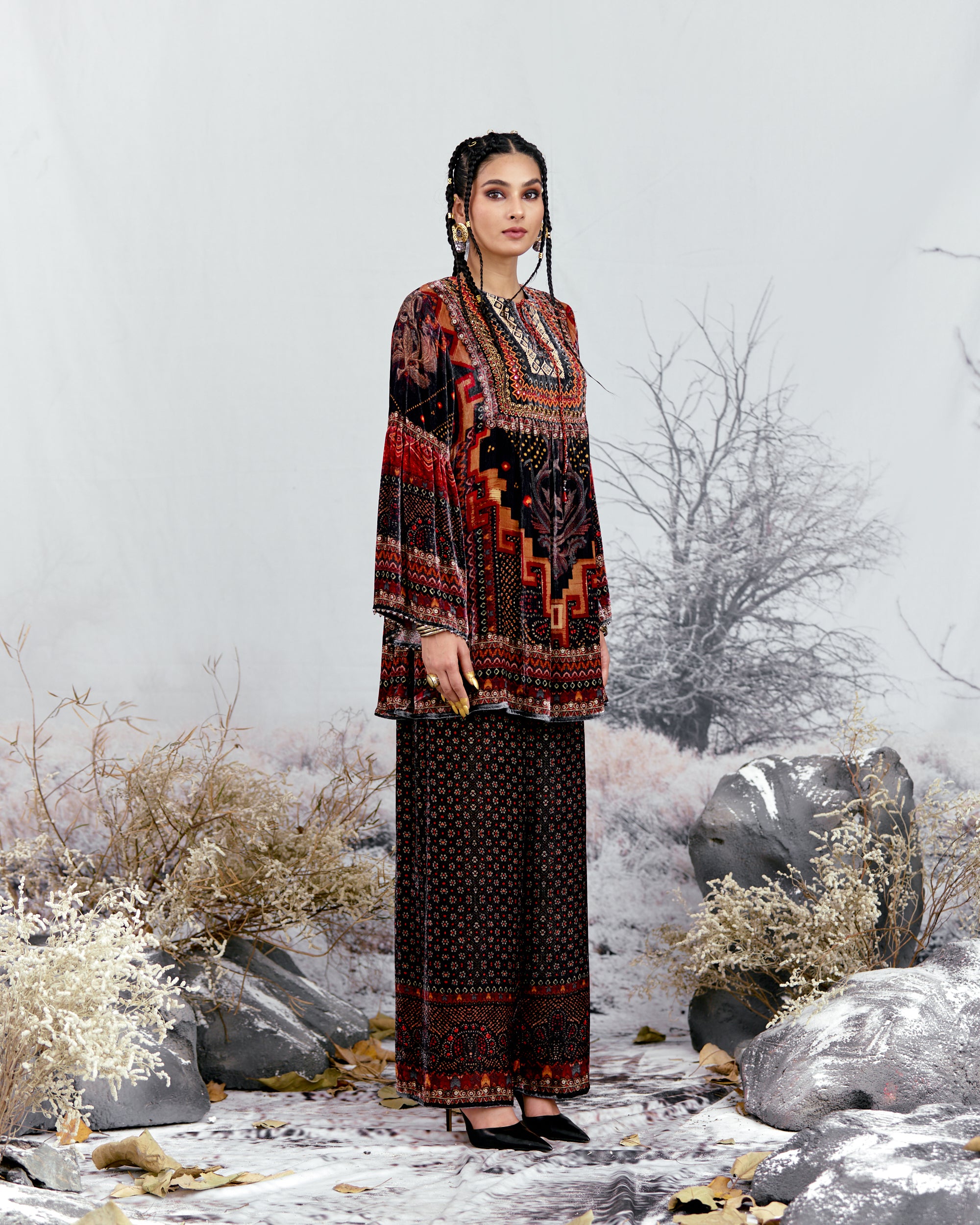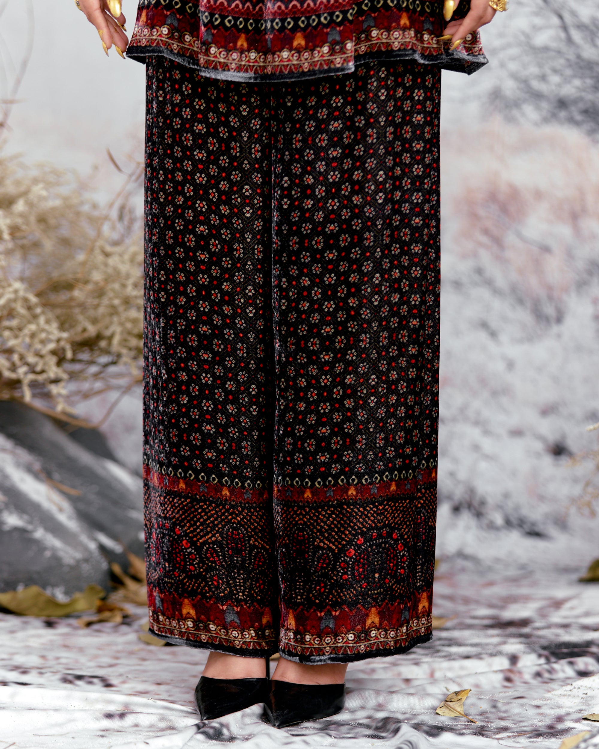 This shirt can also teamed with a coordinating Printed palazzos with a printed border at the hem.