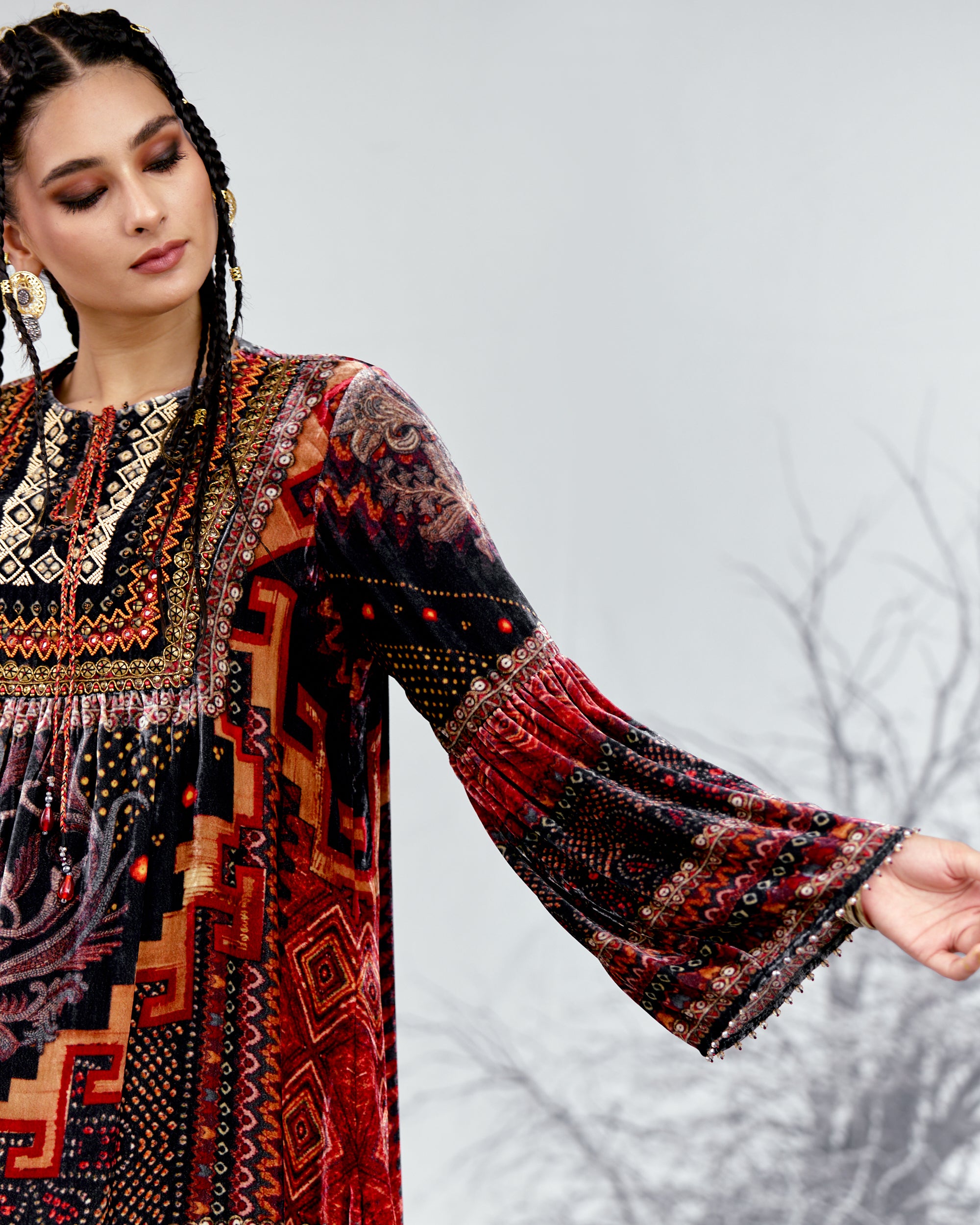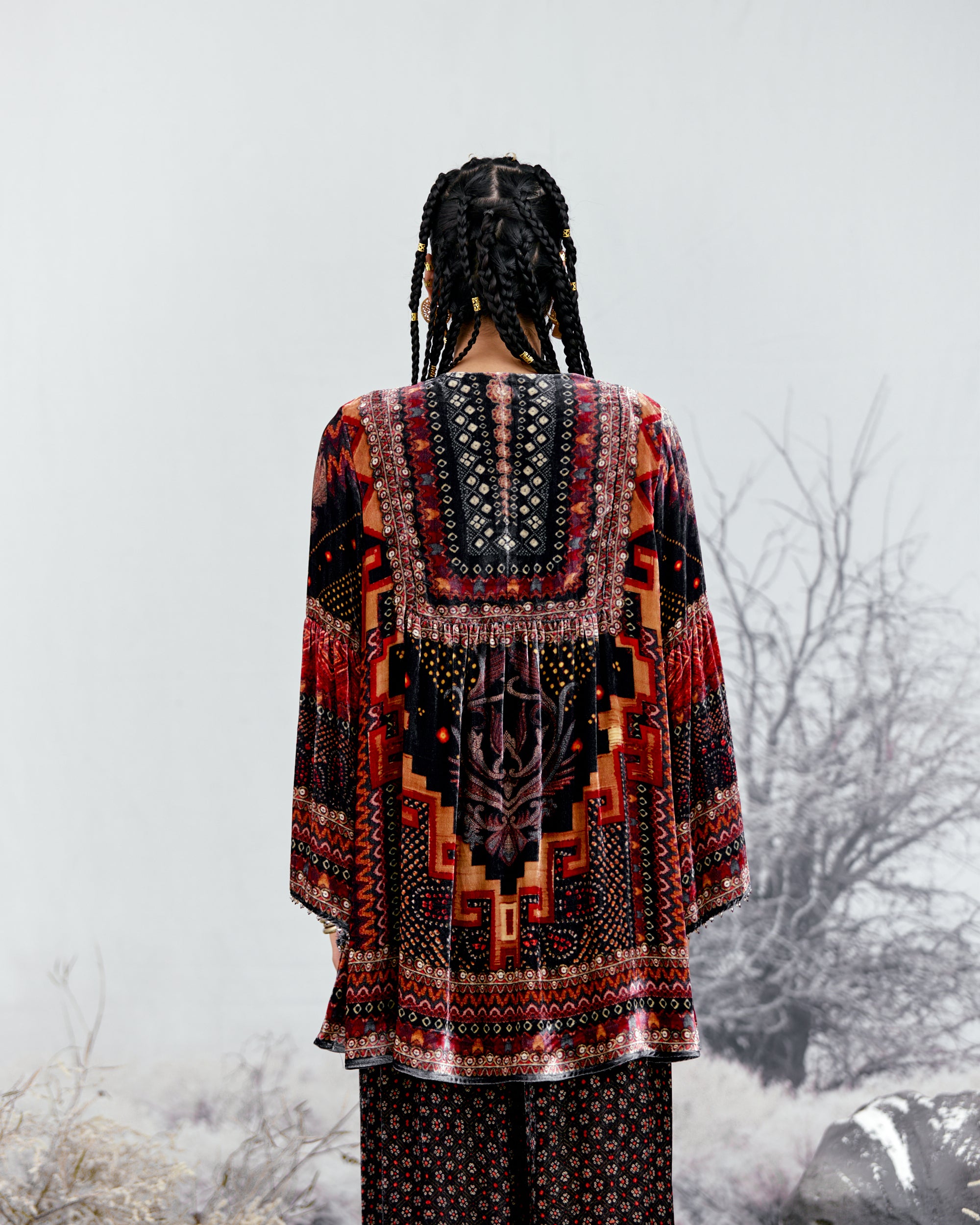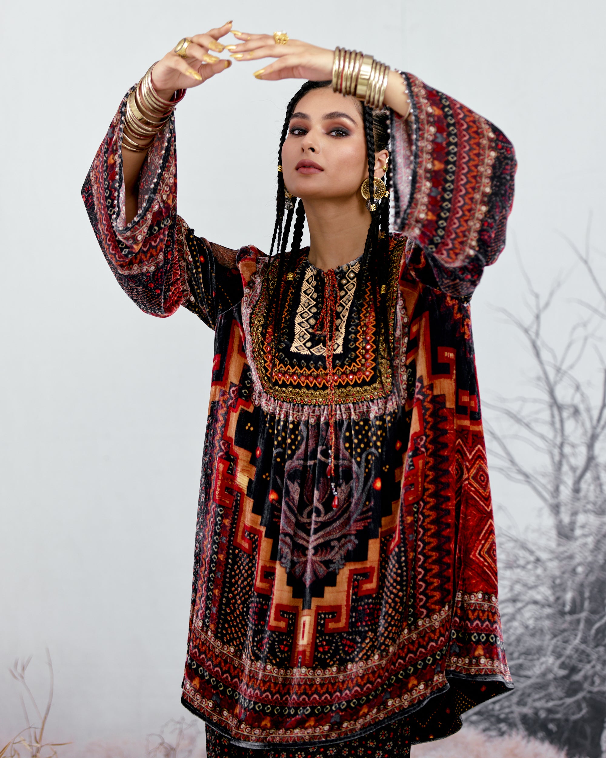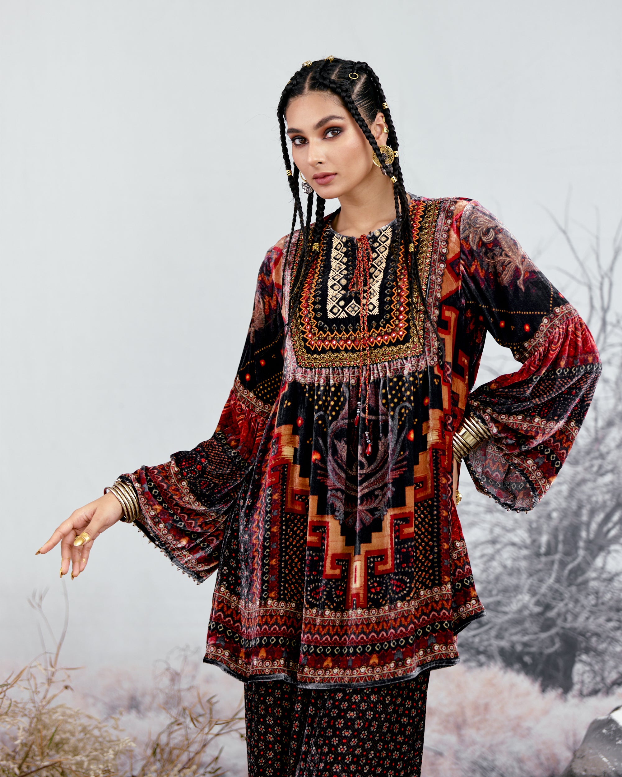 The tunic has a comfortable fit with gathers under the front yoke and flare sleeves.