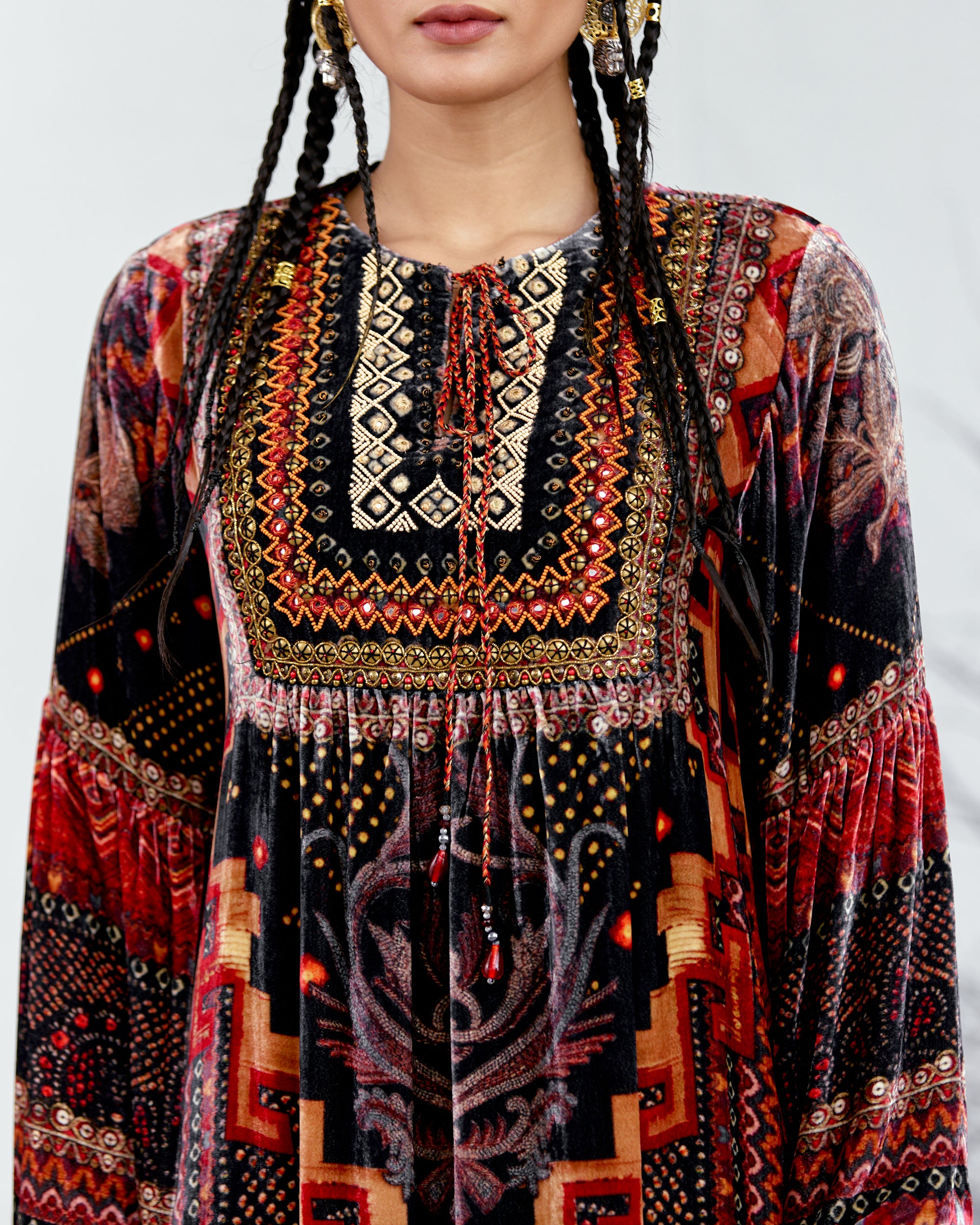 The printed bohemian tunic style with a yoke on the front. The tunic has a round neckline, keyhole front with a drawstring.