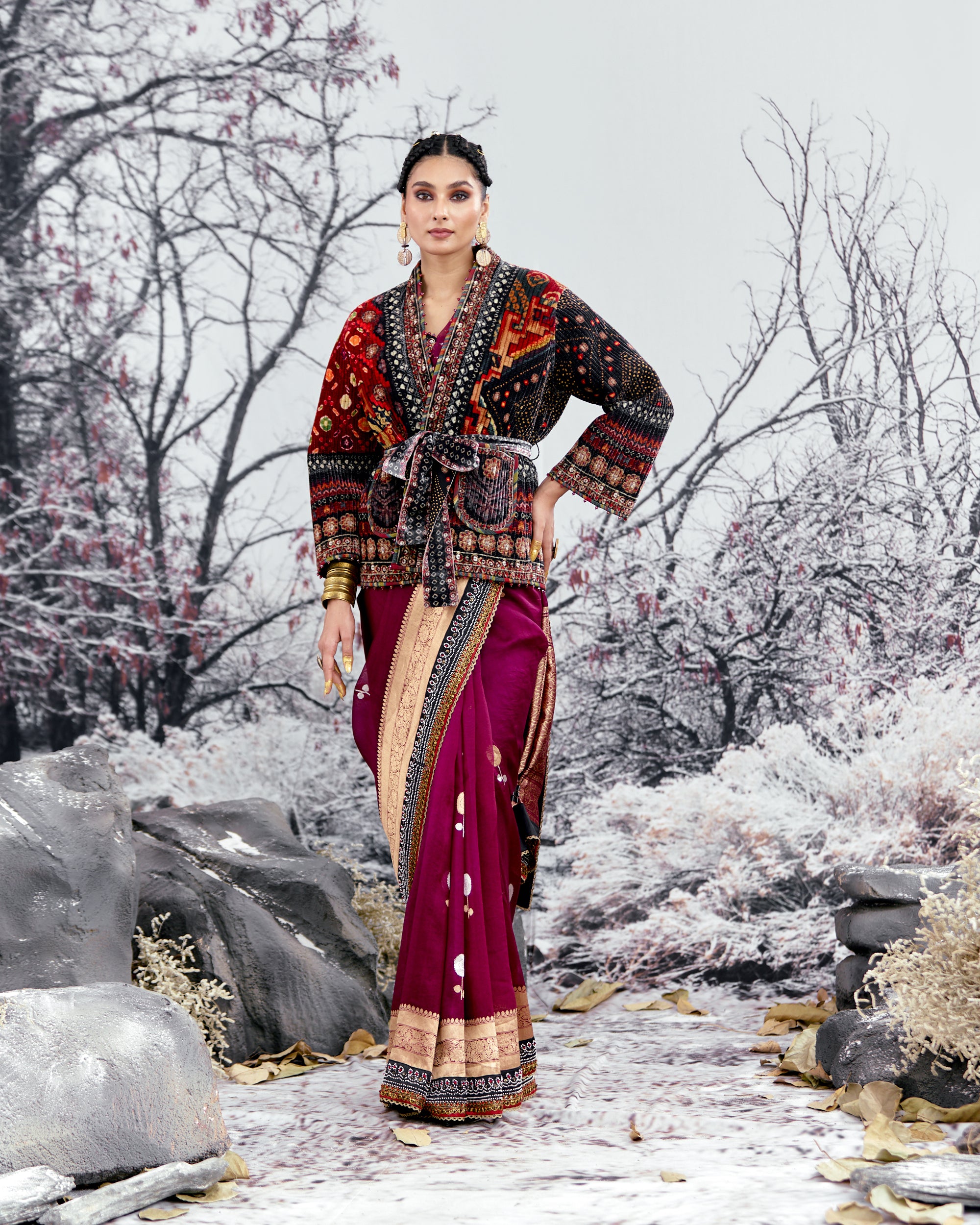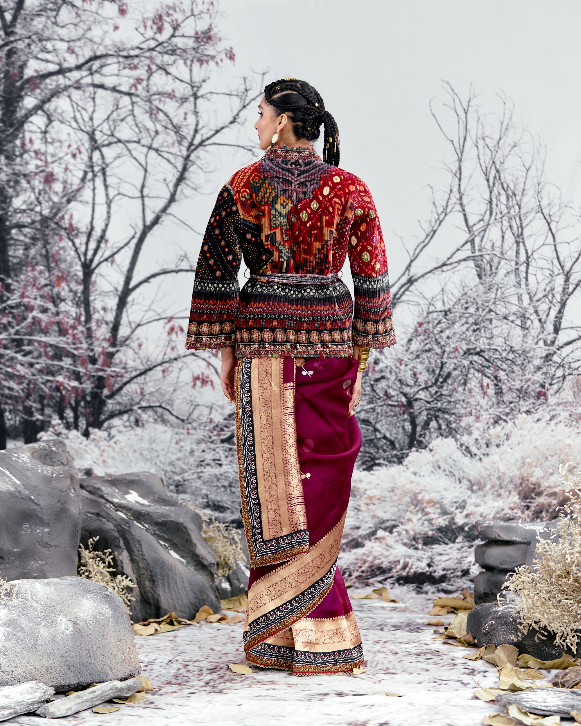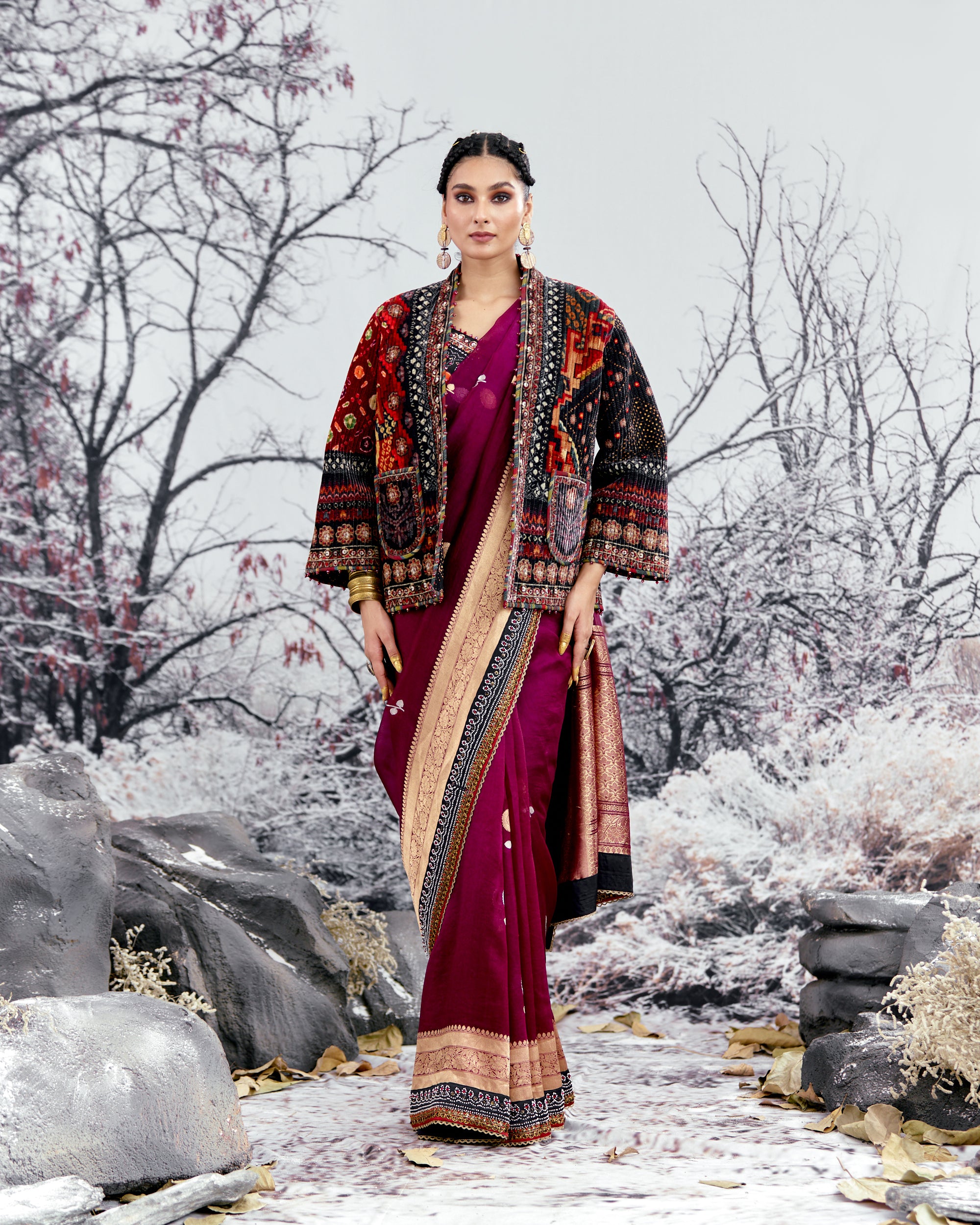 This jacket is sold separately and does not include the sari as per the images. Kindly order the sari as a separate product from the same collection.
