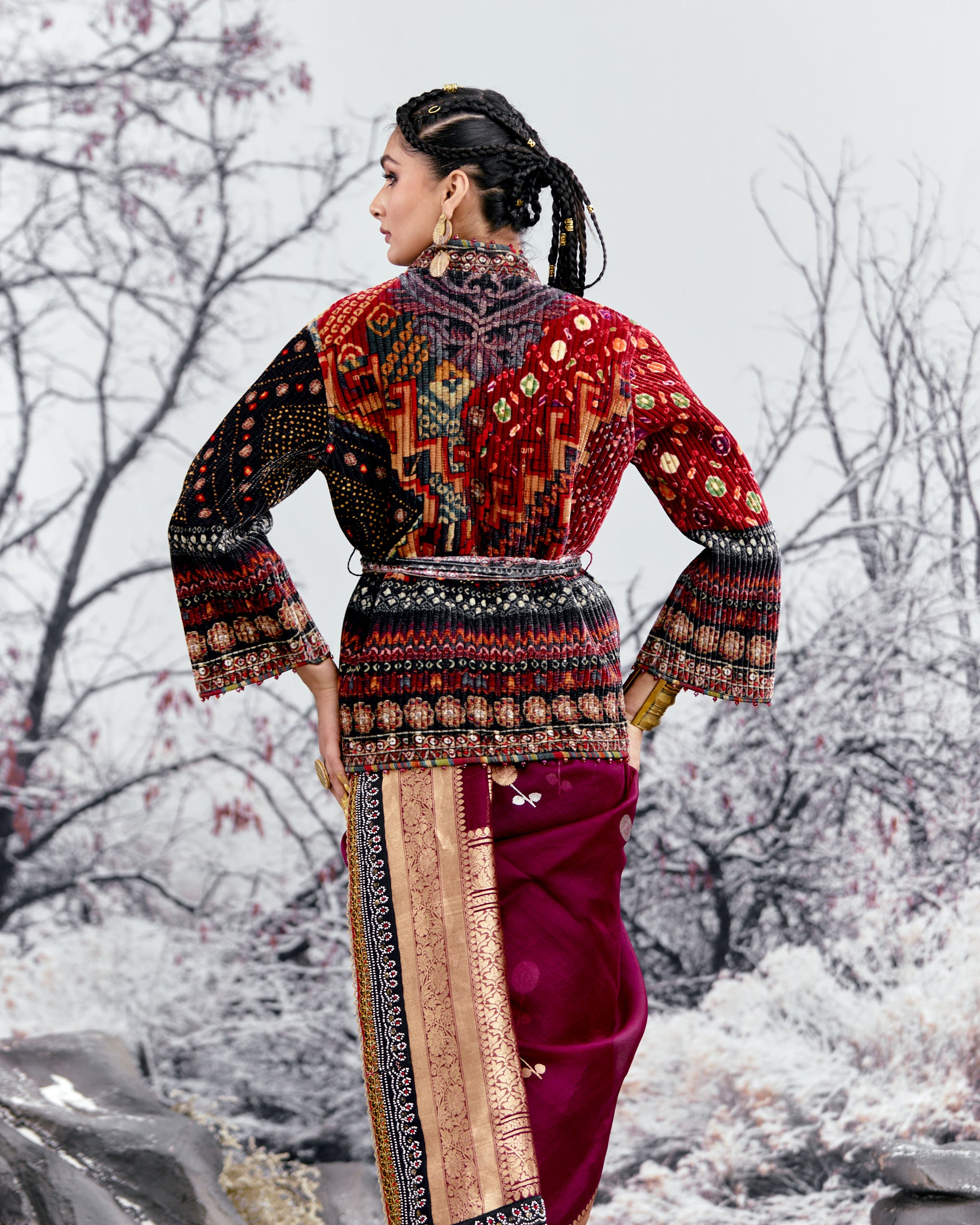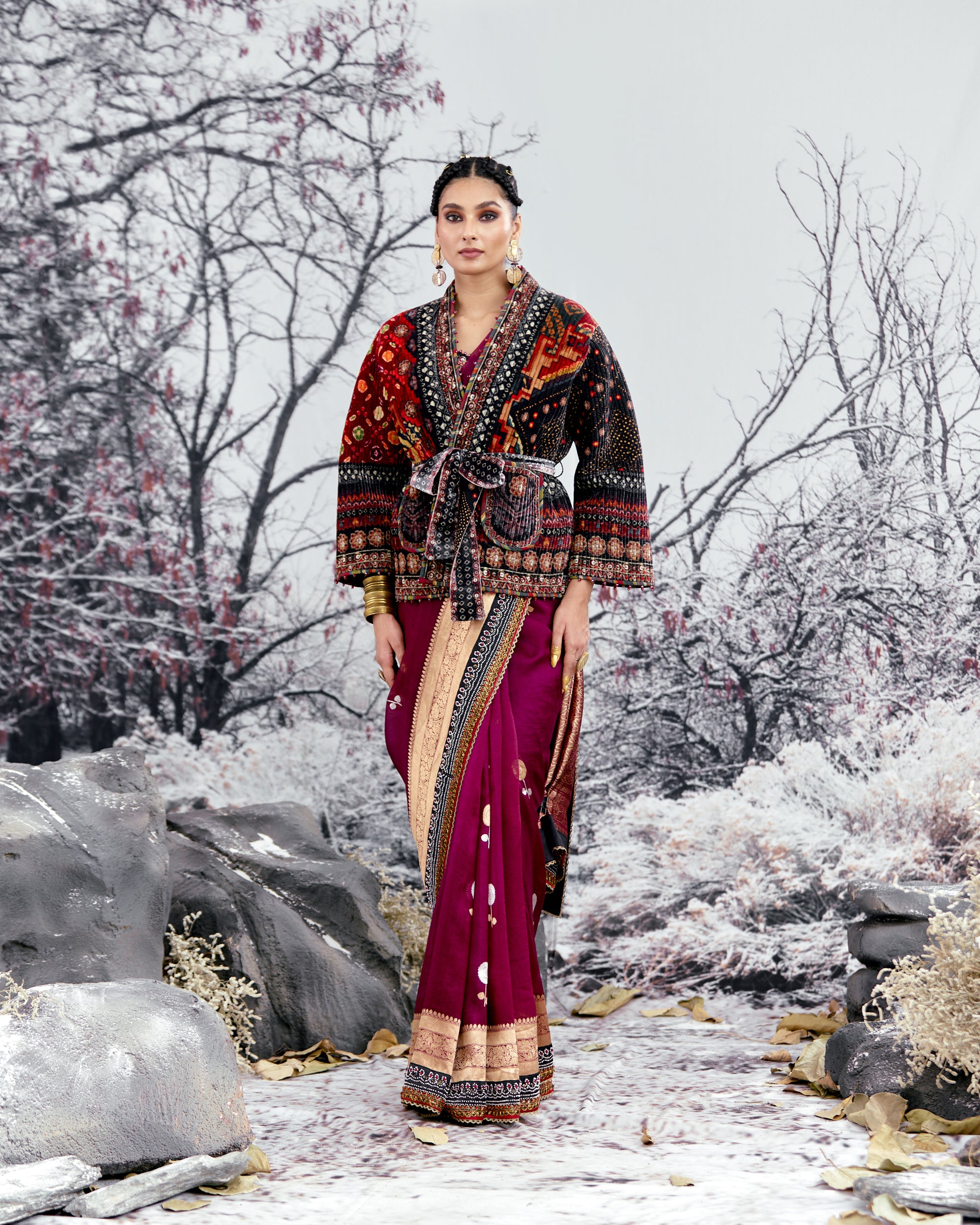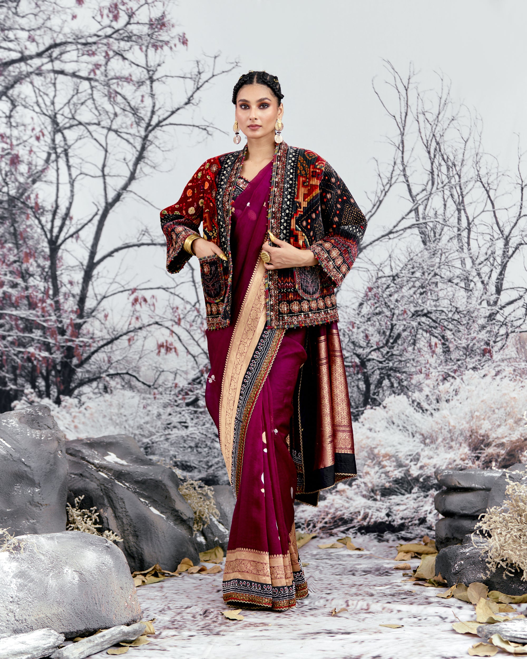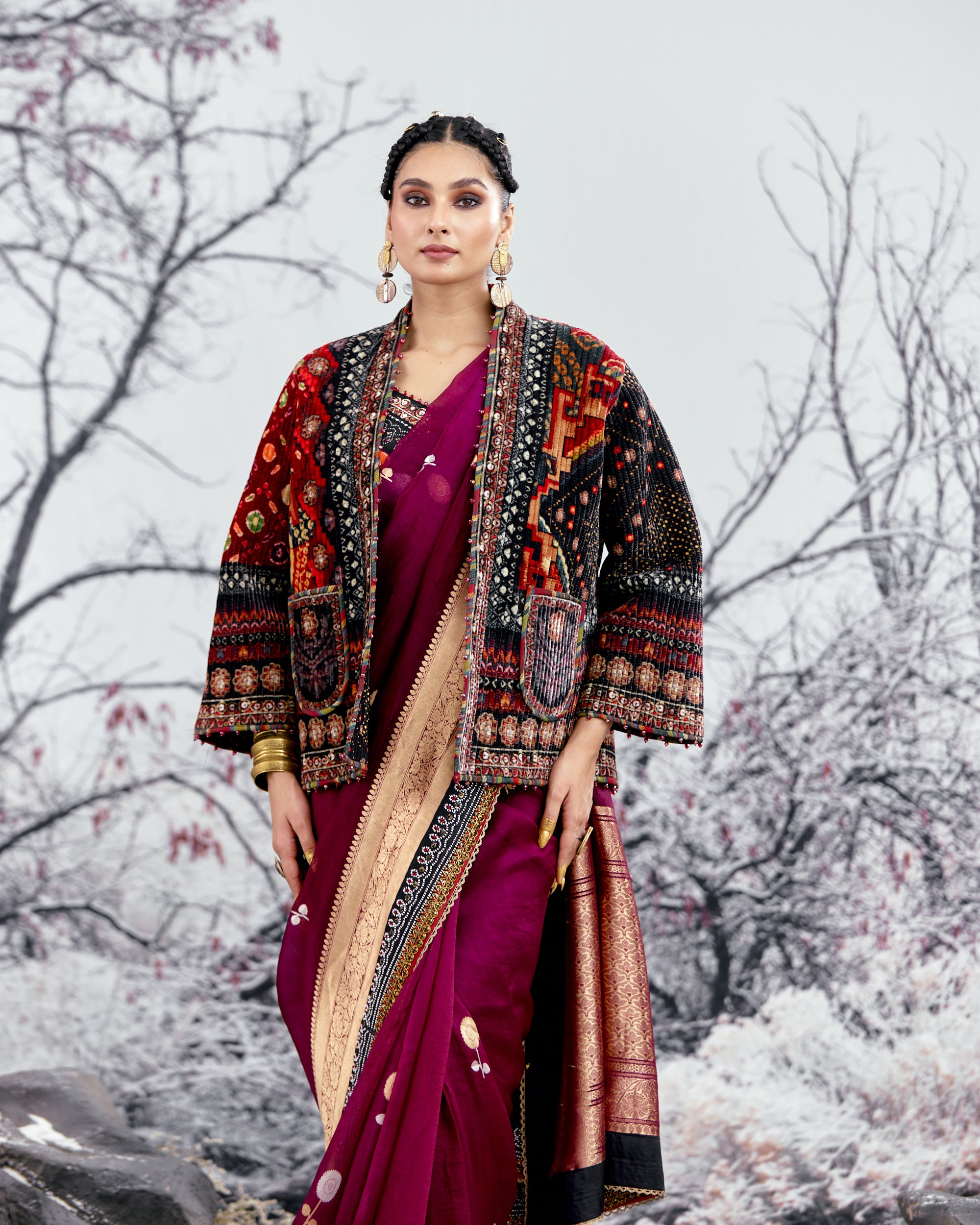 This jacket is sold separately and does not include the sari as per the images. Kindly order the sari as a separate product from the same collection.